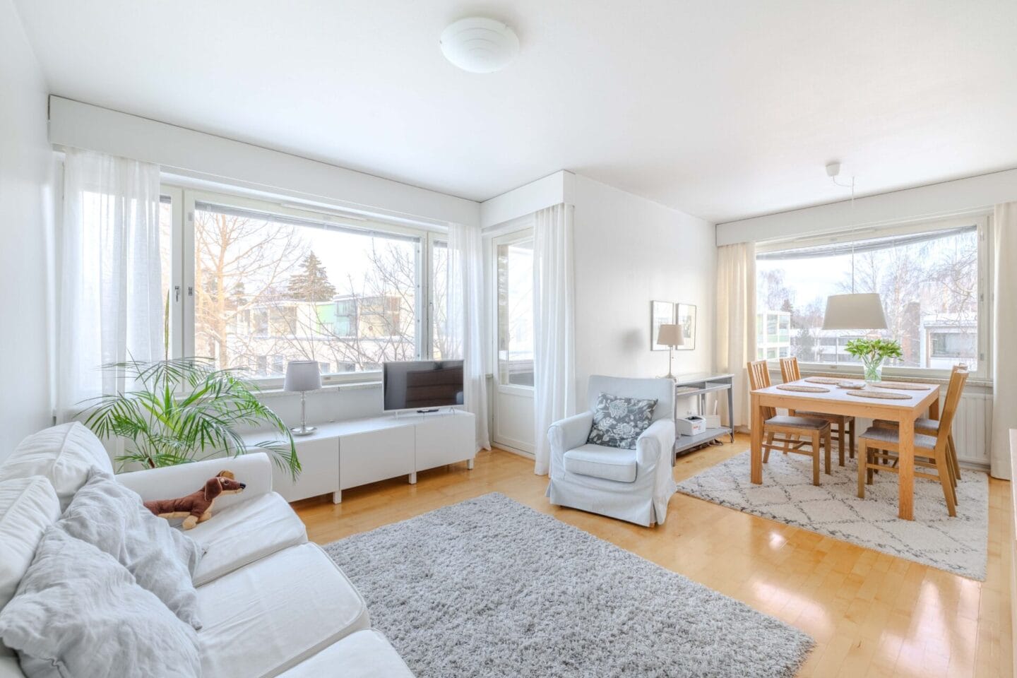 Tässä vaaleasävyisessä asunnossa olohuoneen yhteydessä on ruokailutila ja lasitettu parveke. Kahteen suuntaan olevat ikkunat antavat puistomaiseen sisäpihaan ja tuovat runsaasti luonnonvaloa asuntoon. Tilavaan makuuhuoneeseen mahtuu parisänky ja runsaasti kaappitilaa.