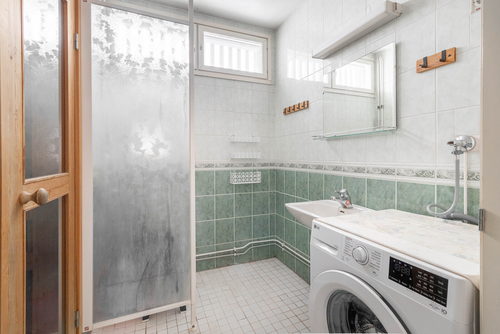 | Kylpyhuoneen kuvaus | Peilikaappi, pesukoneliitäntä, suihkuseinä ja suihku, seinät (kaakeli), lattiat (laatta) |