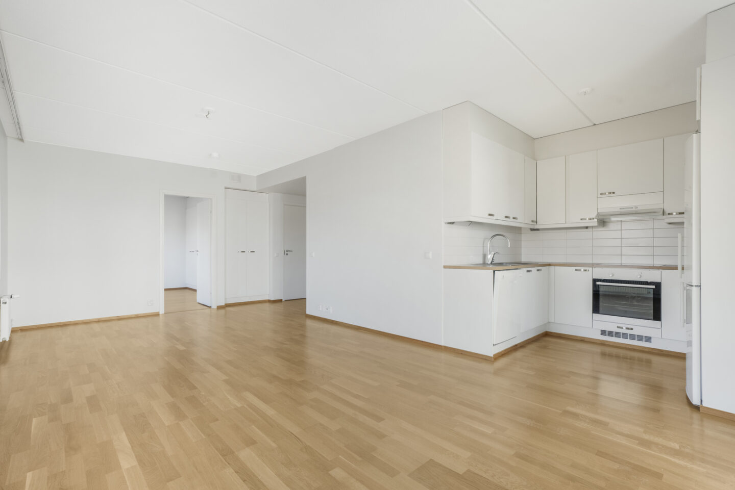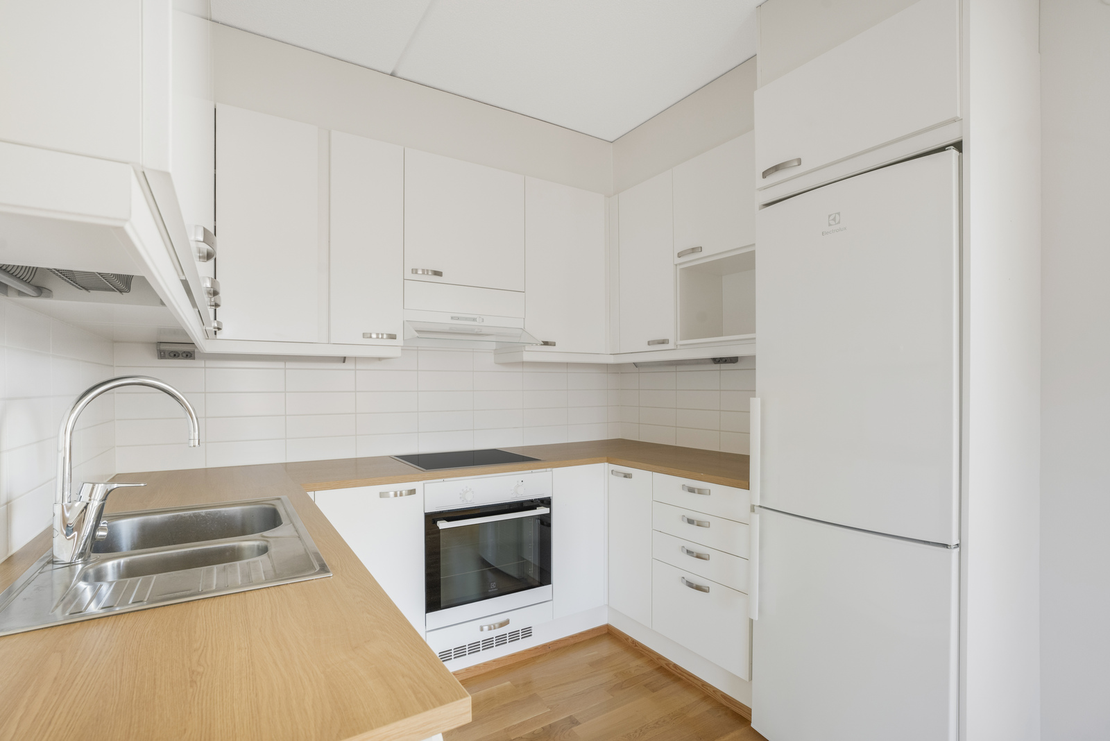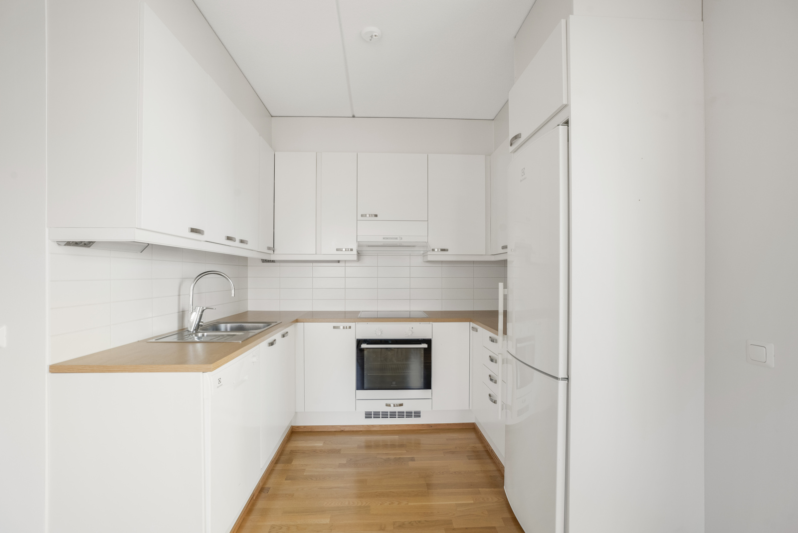 Liesi (Keraaminen liesi), työtasot (laminaatti), lattiat (parketti), astianpesukone, jääkaappipakastin, liesituuletin ja kiinteät valaisimet |