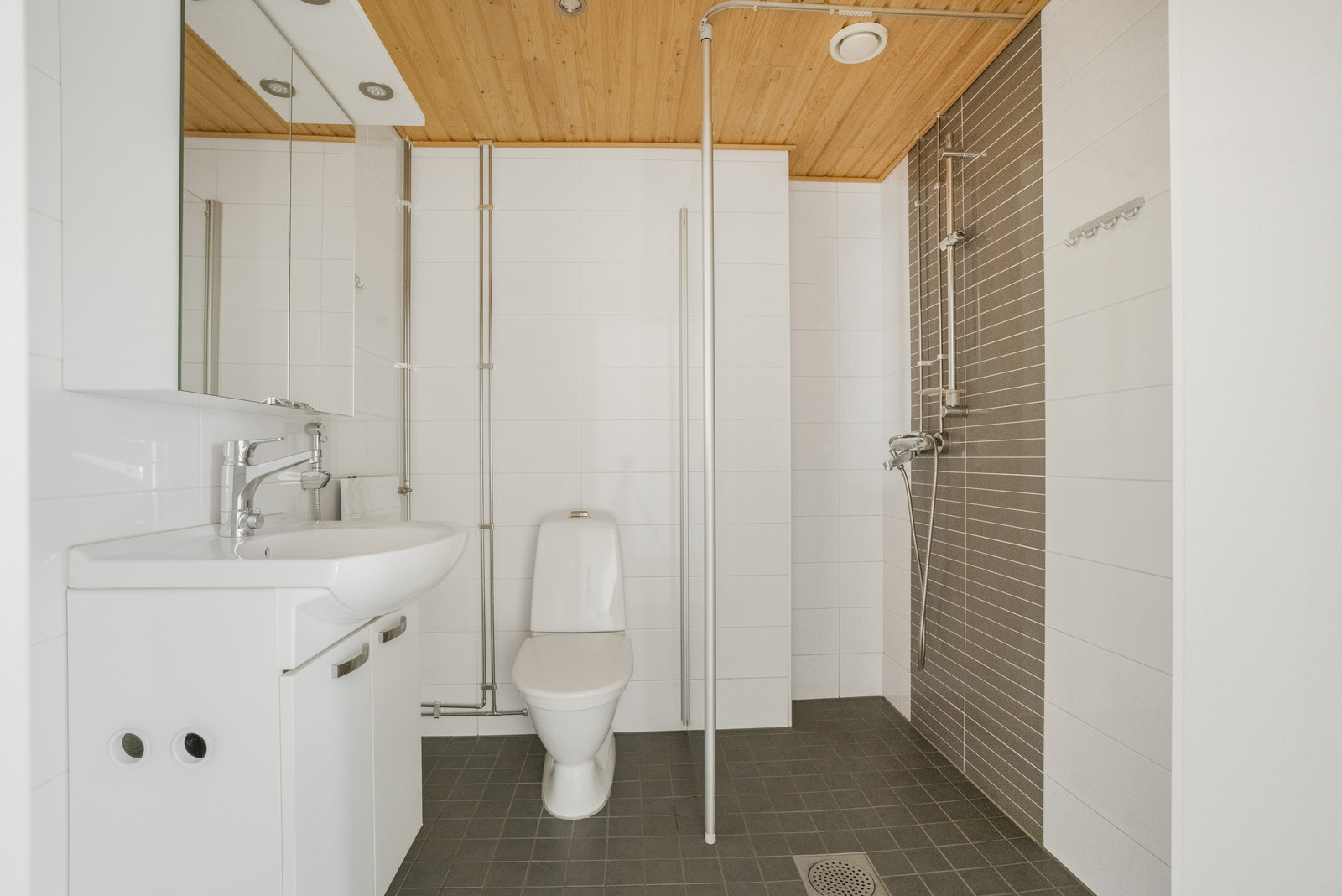 Pesukoneliitäntä, suihkuseinä, wc-istuin, peilikaappi ja suihku, seinät (kaakeli), lattiat (laatta) |