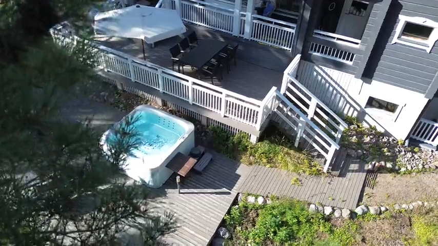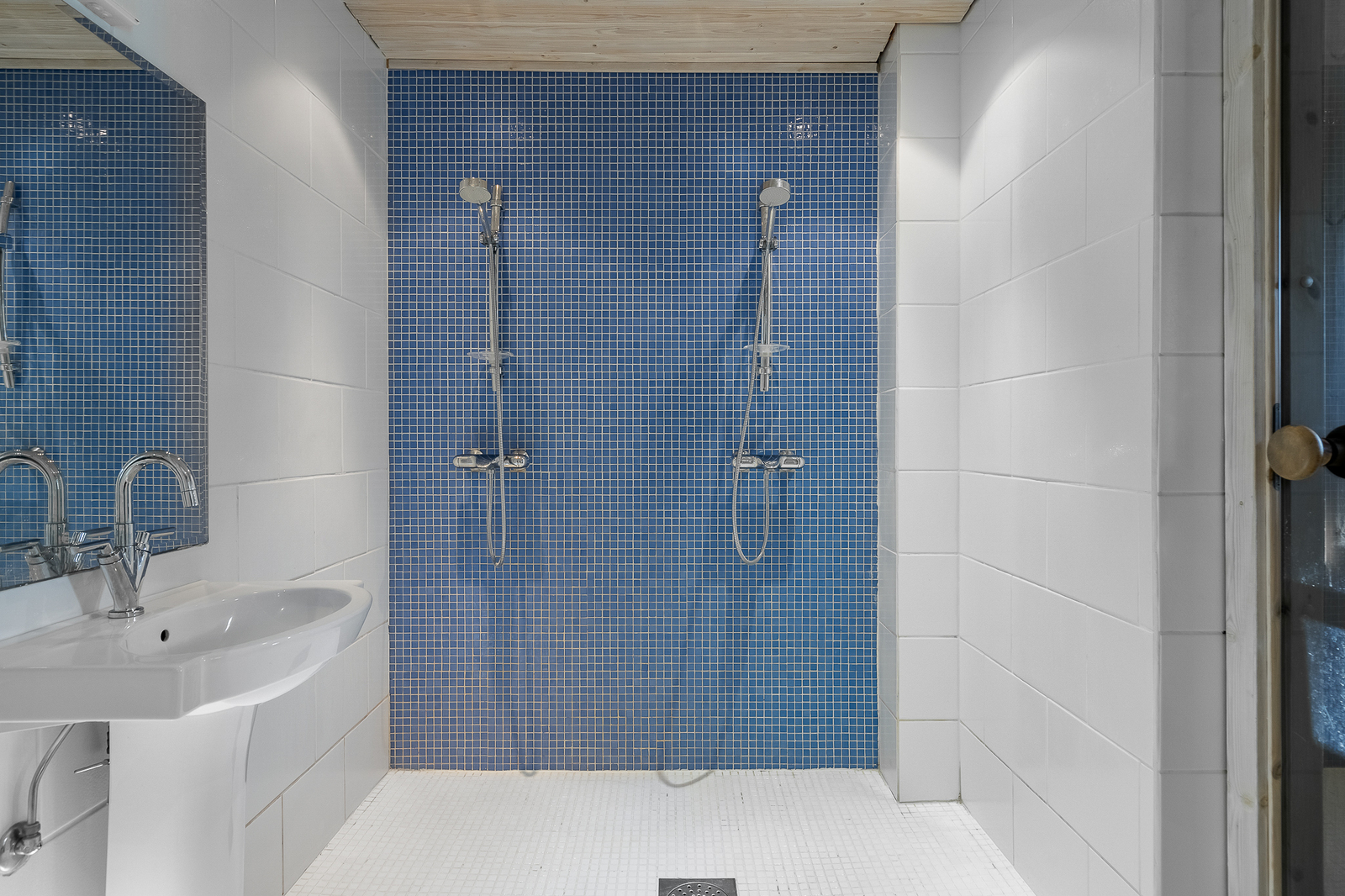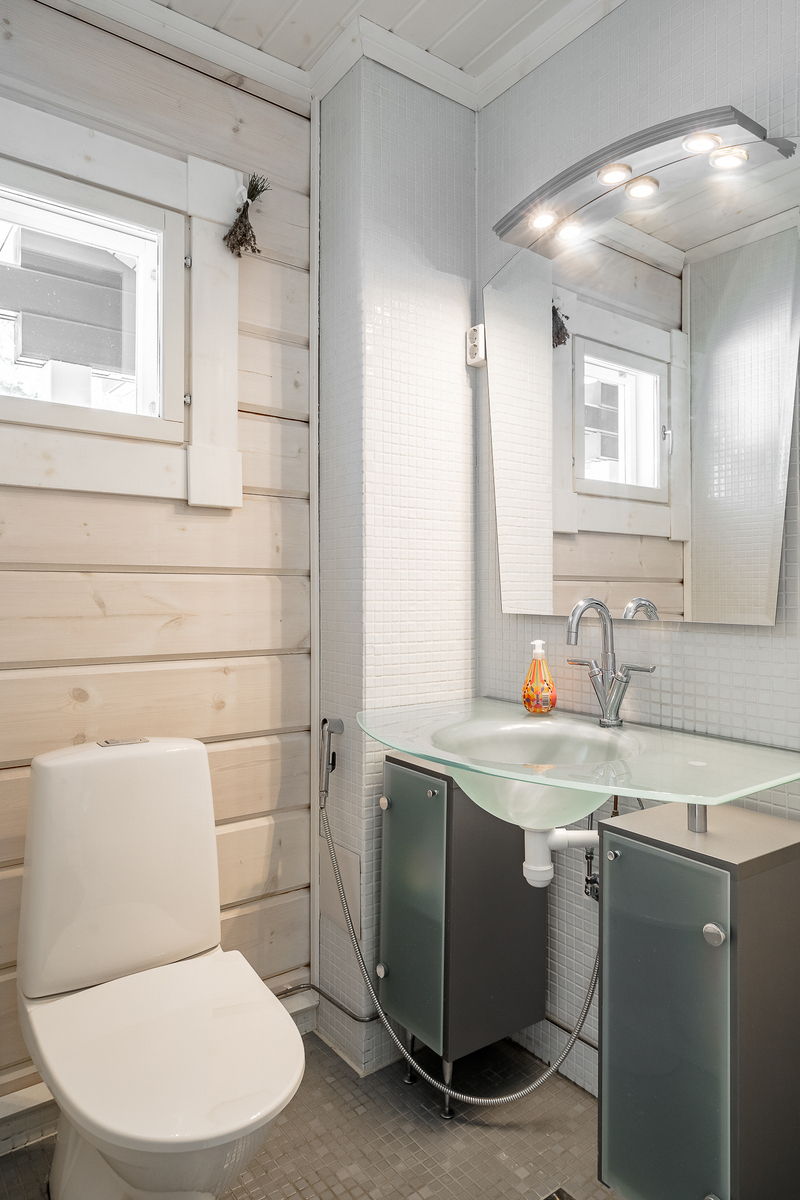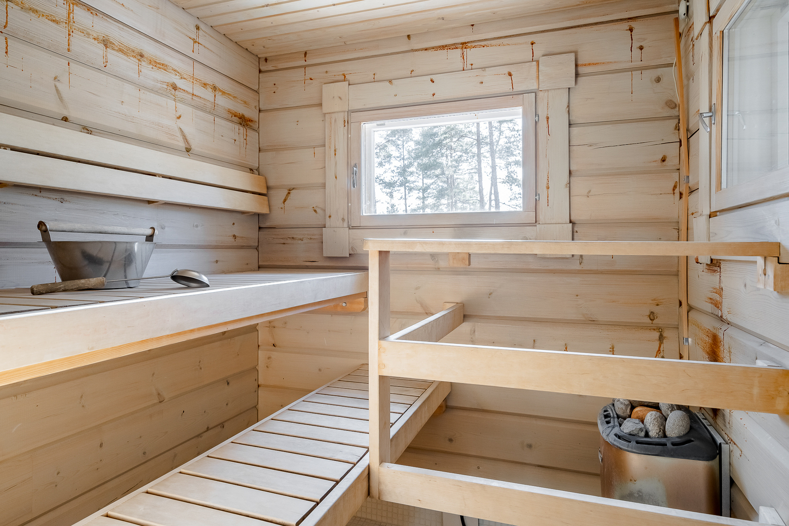 Ikkunallisen saunan yhteydessä on tilava, laatoitettu pesuhuone sekä kodinhoitohuone, josta on ovi ulos isoille, etelään avautuville terasseille. Yläterassi on katettu sadepäivien varalle ja alaterassilla on kymmenen hengen ulkoporeallas. Ympäröivästä luonnosta nauttimiseen ulkoilmassa on siis panostettu!