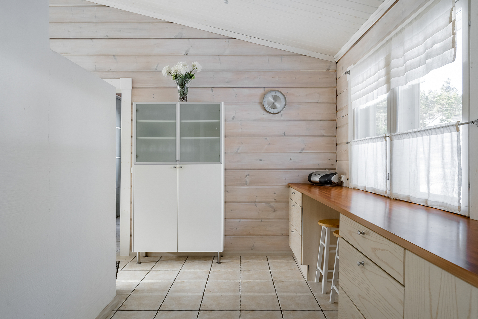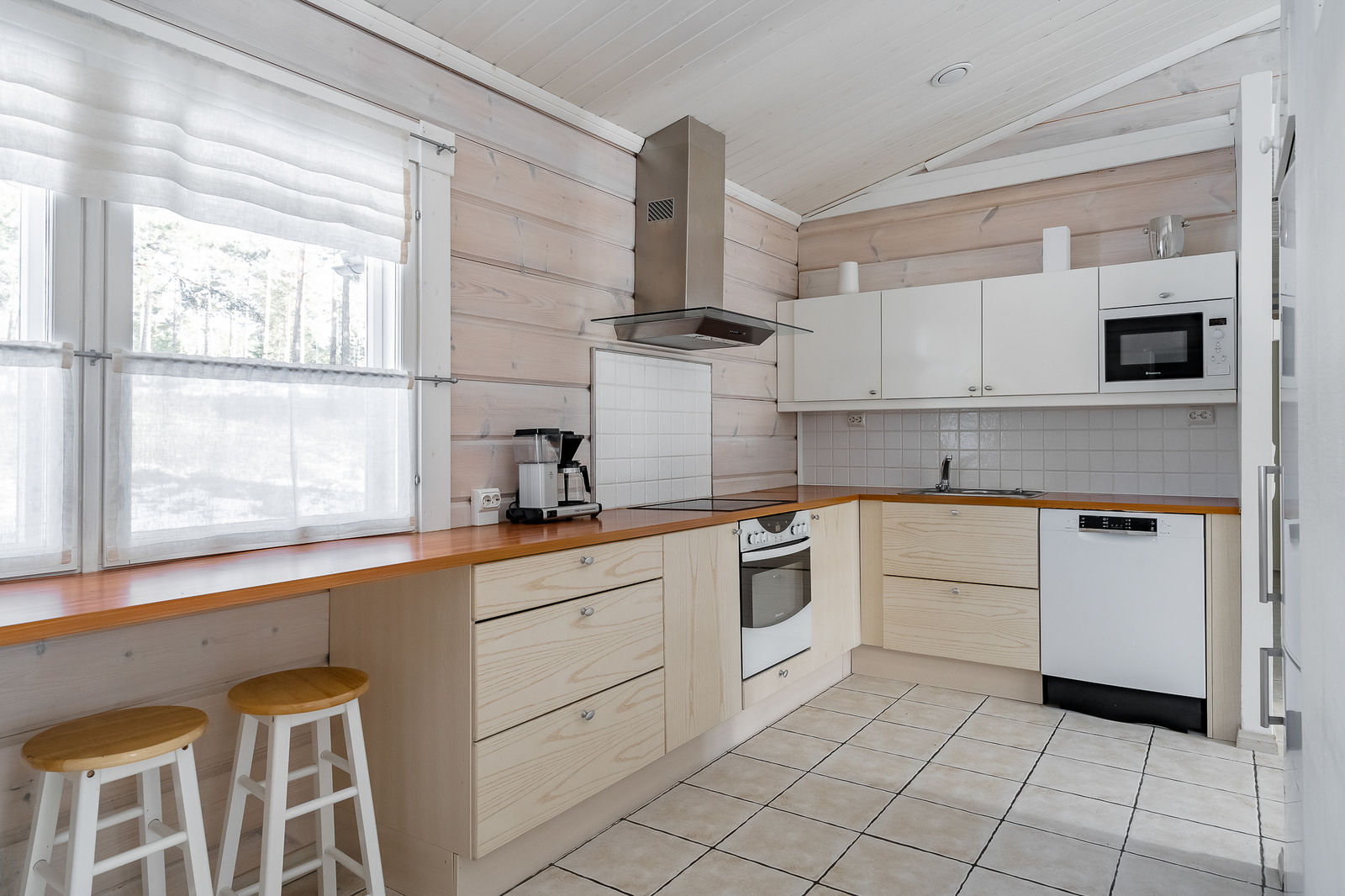 | Keittiön kuvaus | Liesi (erillisuuni, liesitaso), työtasot (laminaatti), seinät (tapetti ja puu), lattiat (laatta), astianpesukone, erillisuuni, erillinen pakastin, jääkaappi ja kiinteät valaisimet, liesitaso, liesituuletin / hormi |