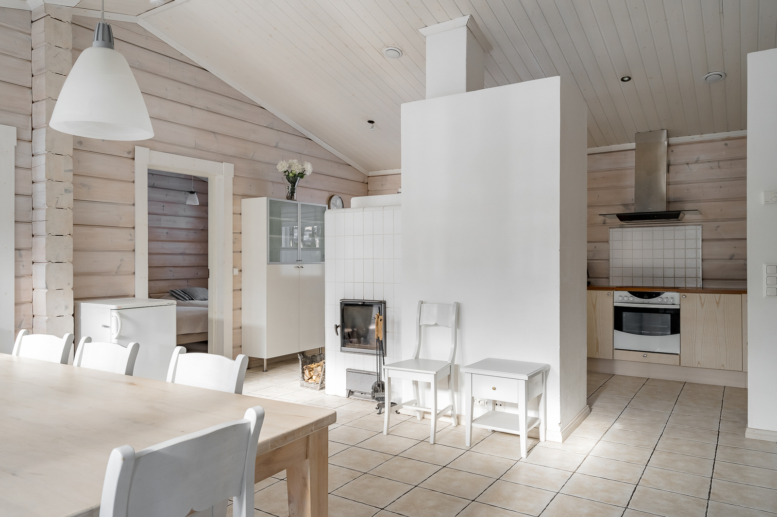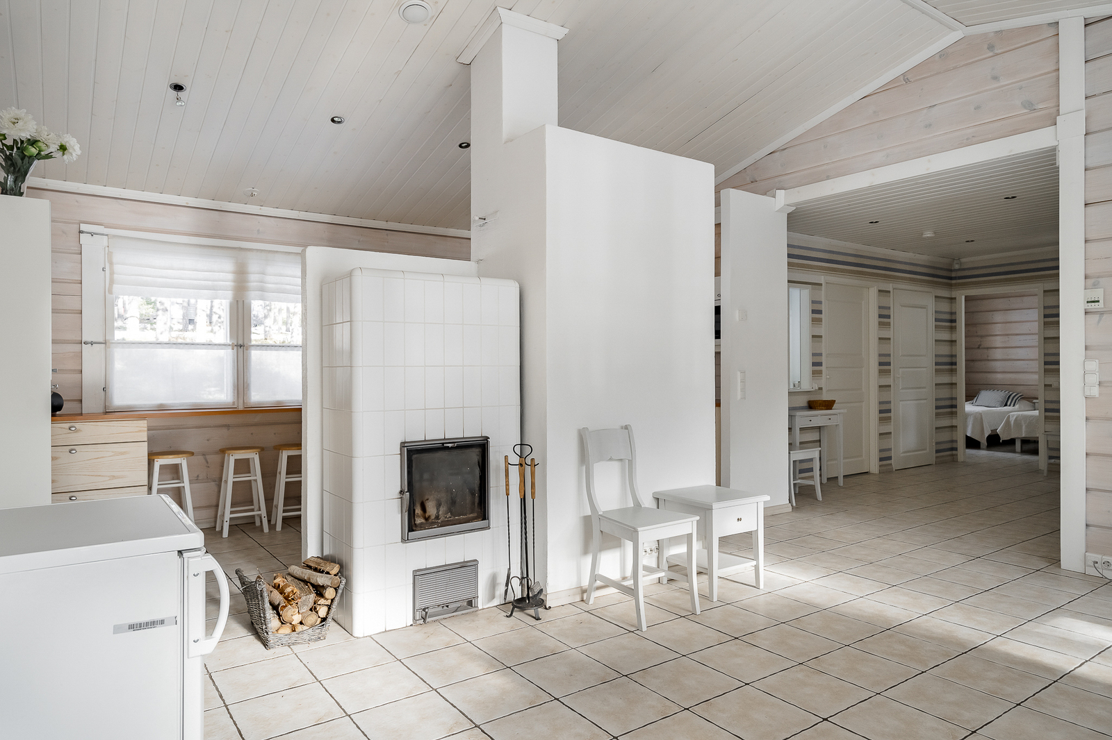 Vaaleasävyisen keittiön ja olohuoneen tilanjakajana toimii varaava takka.
