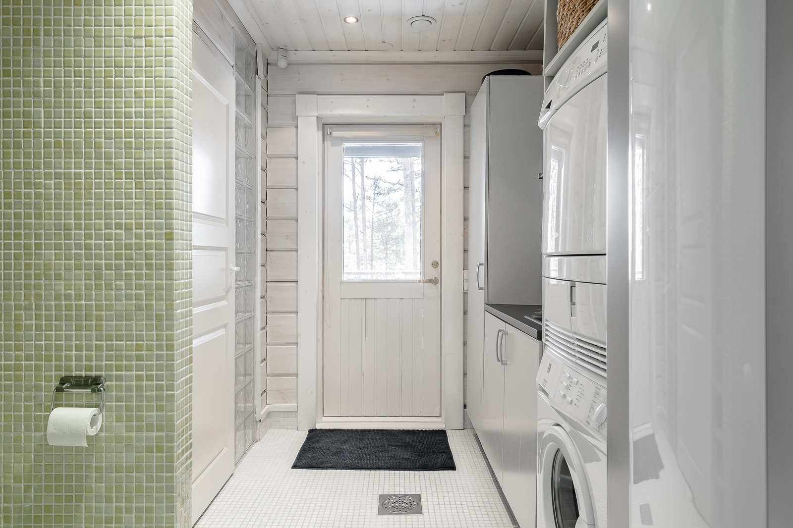 | Kodinhoitohuoneen kuvaus | Lattialämmitys, pyykkikaapit ja pesukoneliitäntä, lattiat (laatta), Kätevästi pesuhuoneen ja saunan vieressä, ovi ulos |