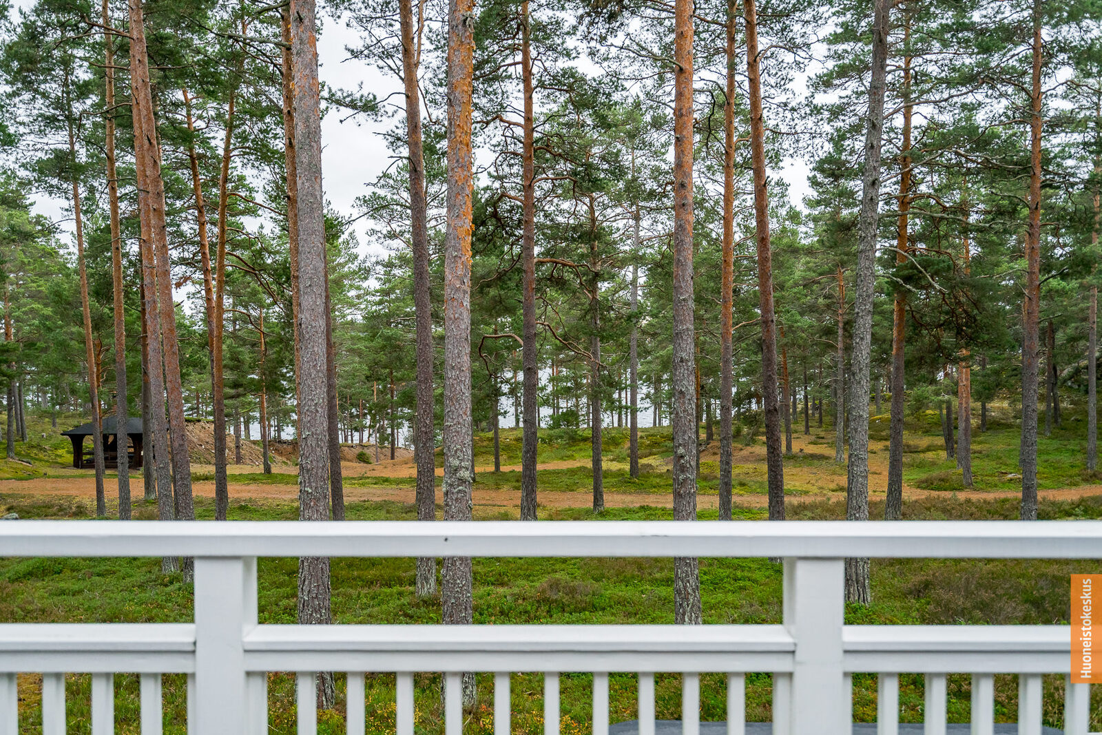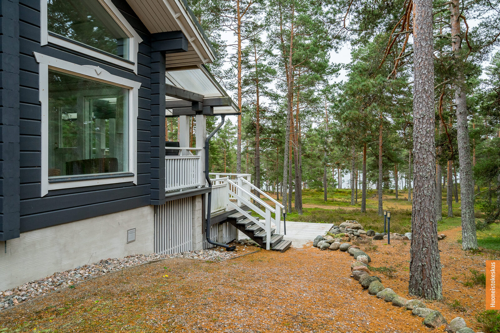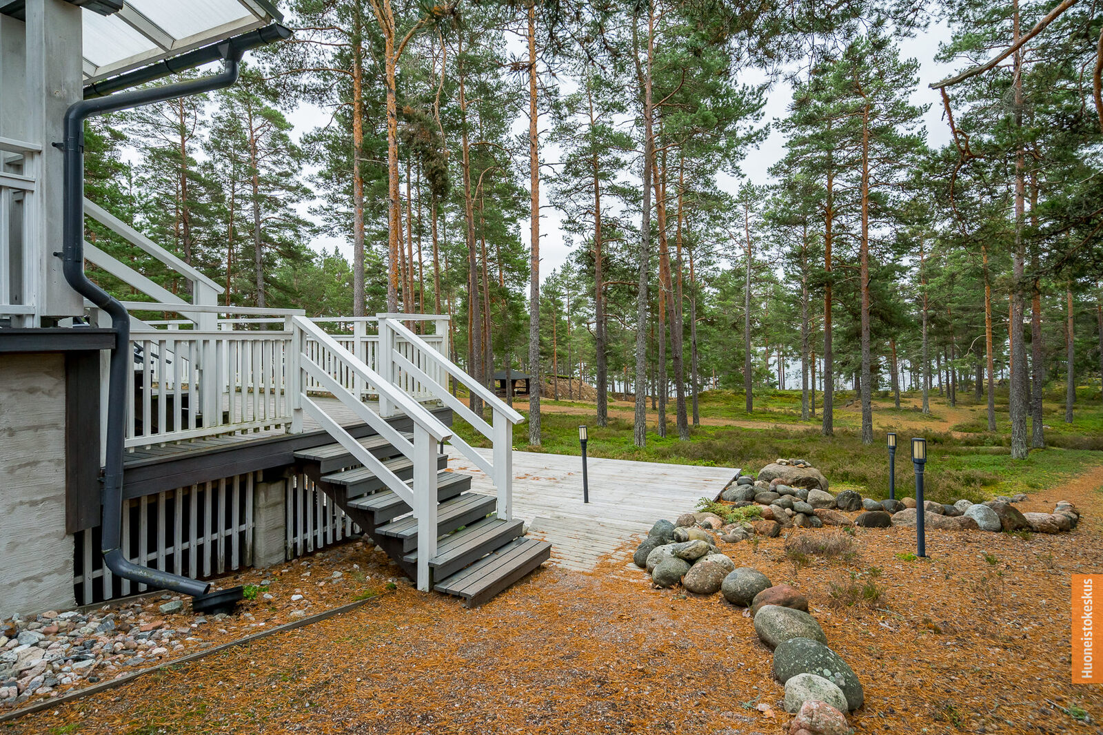 Asuintilat ovat yhdessä tasossa ja niiden keskiössä on korkea olohuone, jonka isoista ikkunoista meri näkyy kauniisti mäntypuiden välistä. Tontti rajoittuu meren puolelta virkistysalueeksi kaavoitettuun, hoidettuun kangasmetsään, joten mieltä rauhoittavat näkymät merelle tulevat säilymään.
