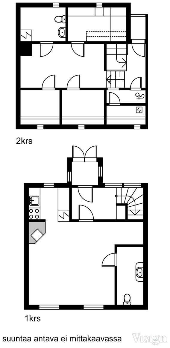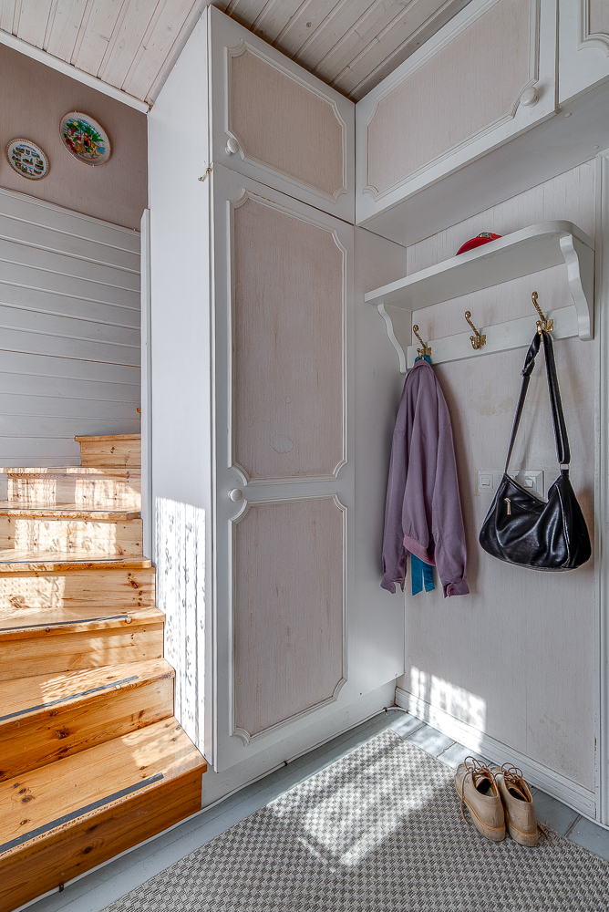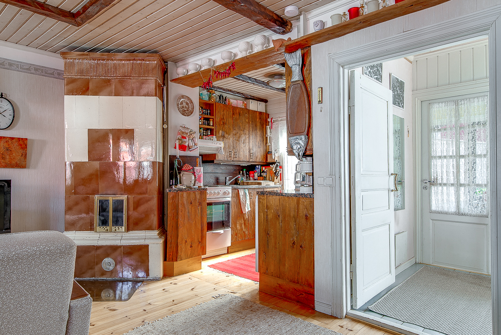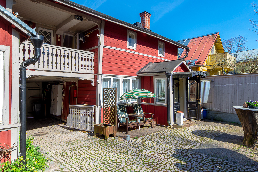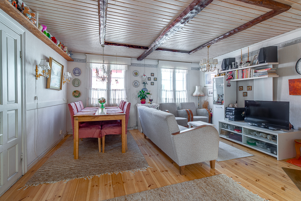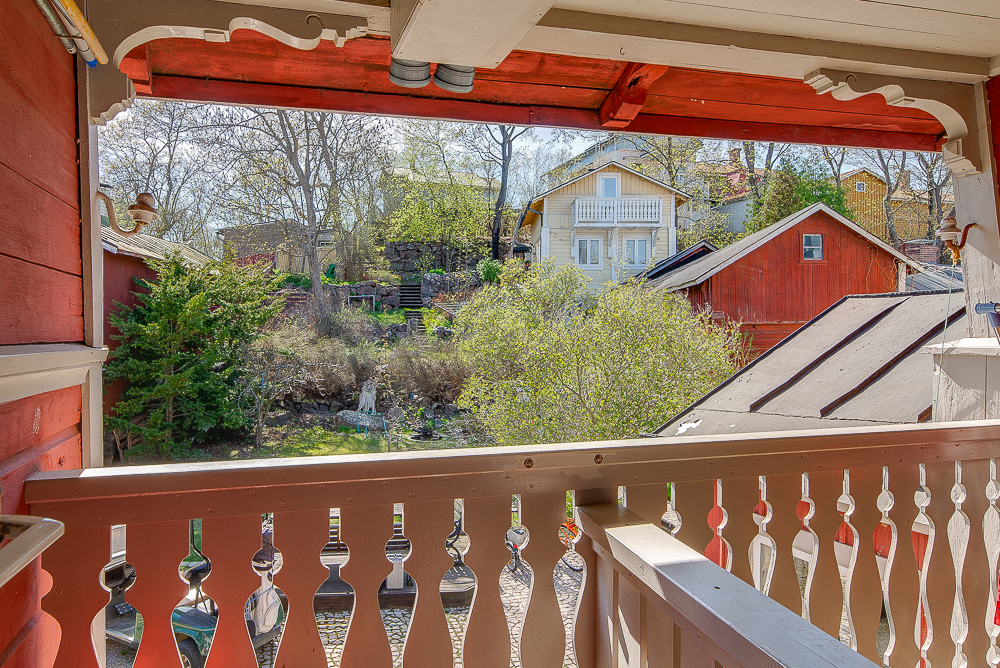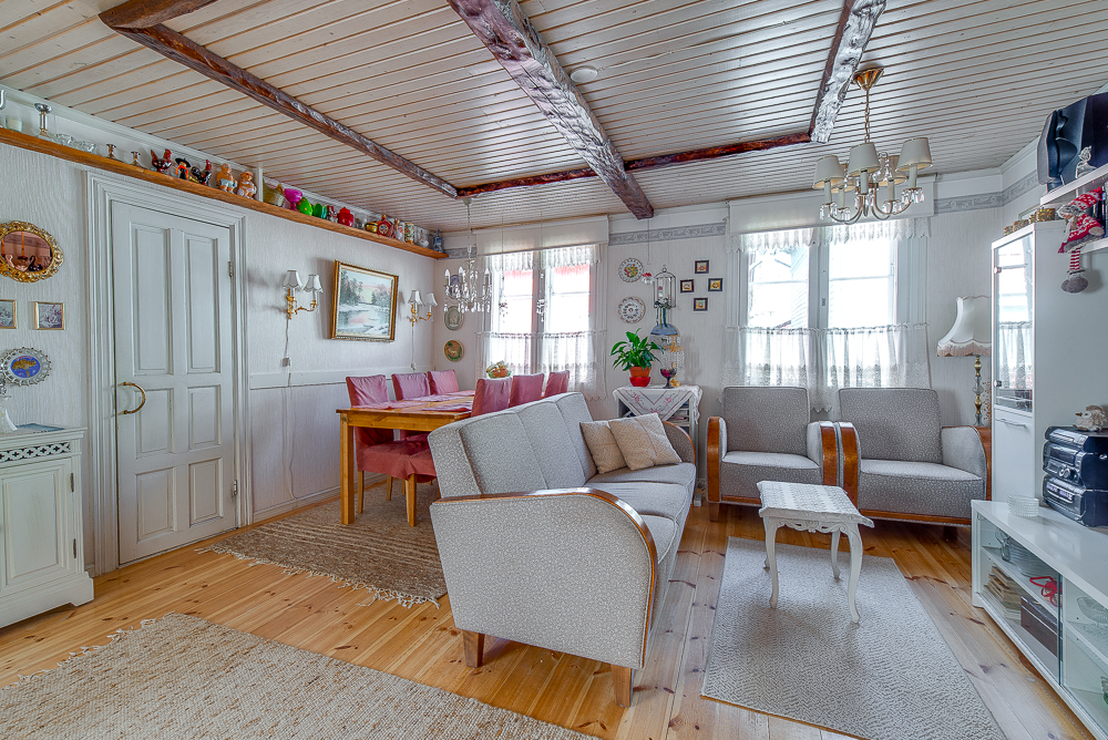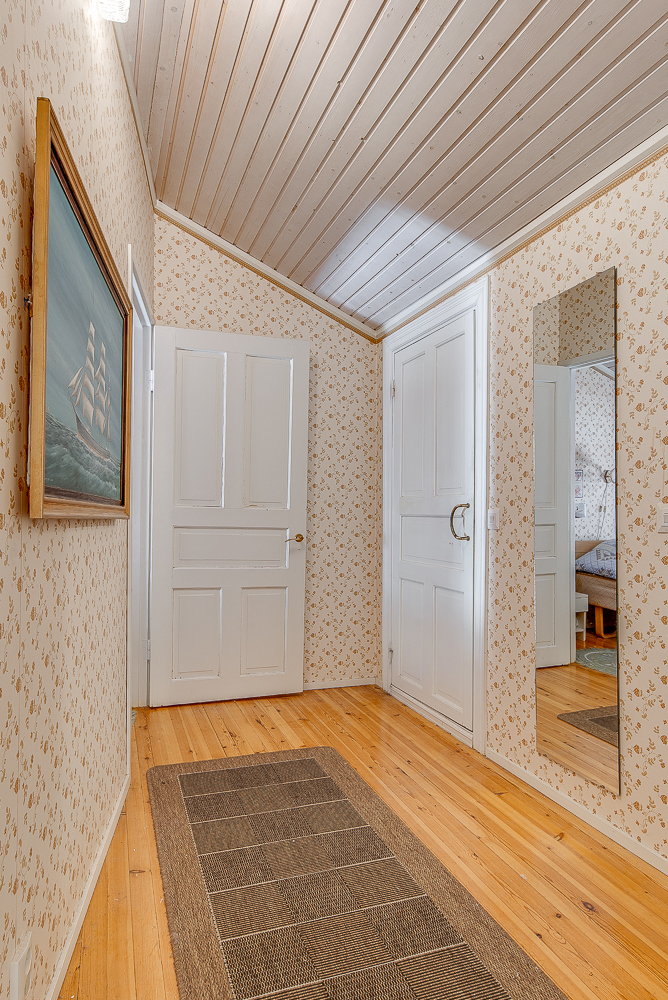 Tämän upealla paikalla sijaitsevan puutalohuoneiston alakerrassa on olohuone, keittiö ja wc. Yläkerrassa on kaksi huonetta, pesuhuone, sauna, wc ja vaatehuone.