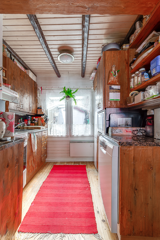 Liesi (Sähköhella), työtasot (kivi), lattiat (lauta), jääkaappipakastin, liesi, astianpesukone ja liesituuletin |