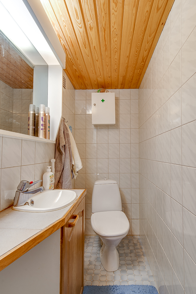 Lukumäärä: 2, WC-istuin, pesukoneliitäntä, pesuallas ja peili, seinät (Kaakeli), lattiat (Laatta) |