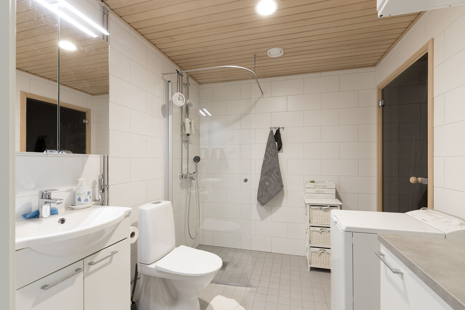 WC-istuin, lattialämmitys, allaskaappi, peilikaappi, suihkuseinä, pesukoneliitäntä, suihku ja kiinteät valaisimet, seinät (kaakeli), lattiat (laatta) |