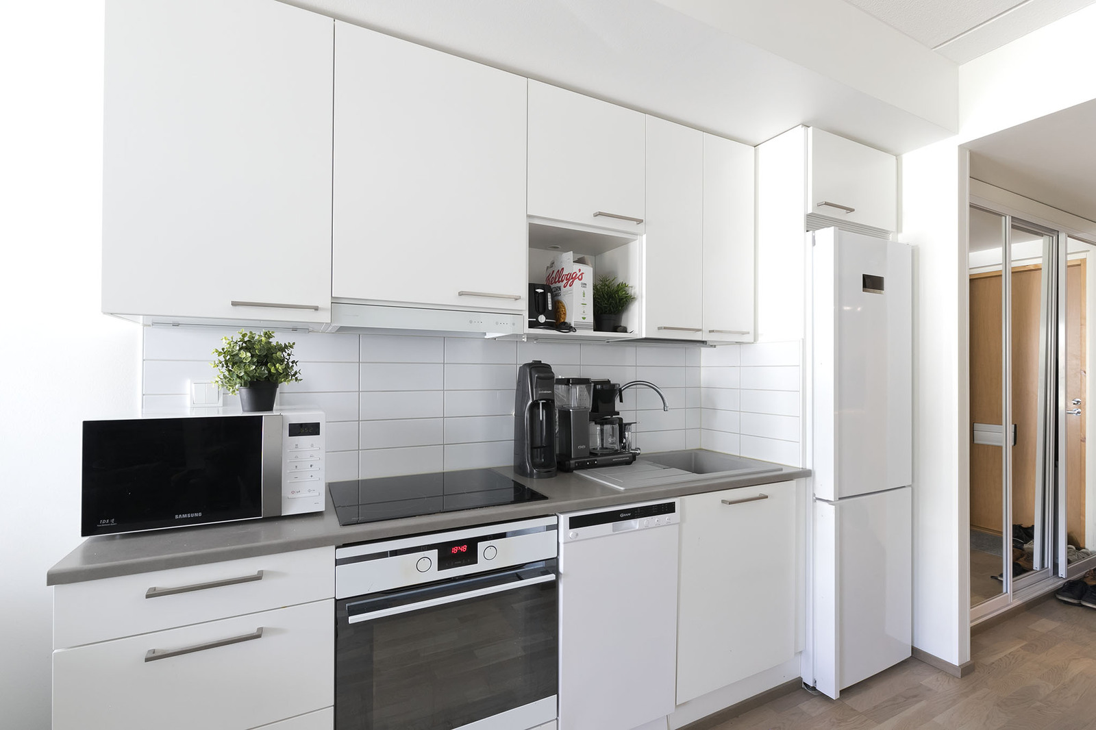 Liesi (Induktioliesi ja liesitaso, erillisuuni), työtasot (laminaatti), seinät (maali ja osalaatoitus), lattiat (parketti), astianpesukone, jääkaappipakastin, liesituuletin, erillisuuni, liesi ja kiinteät valaisimet, liesitaso |