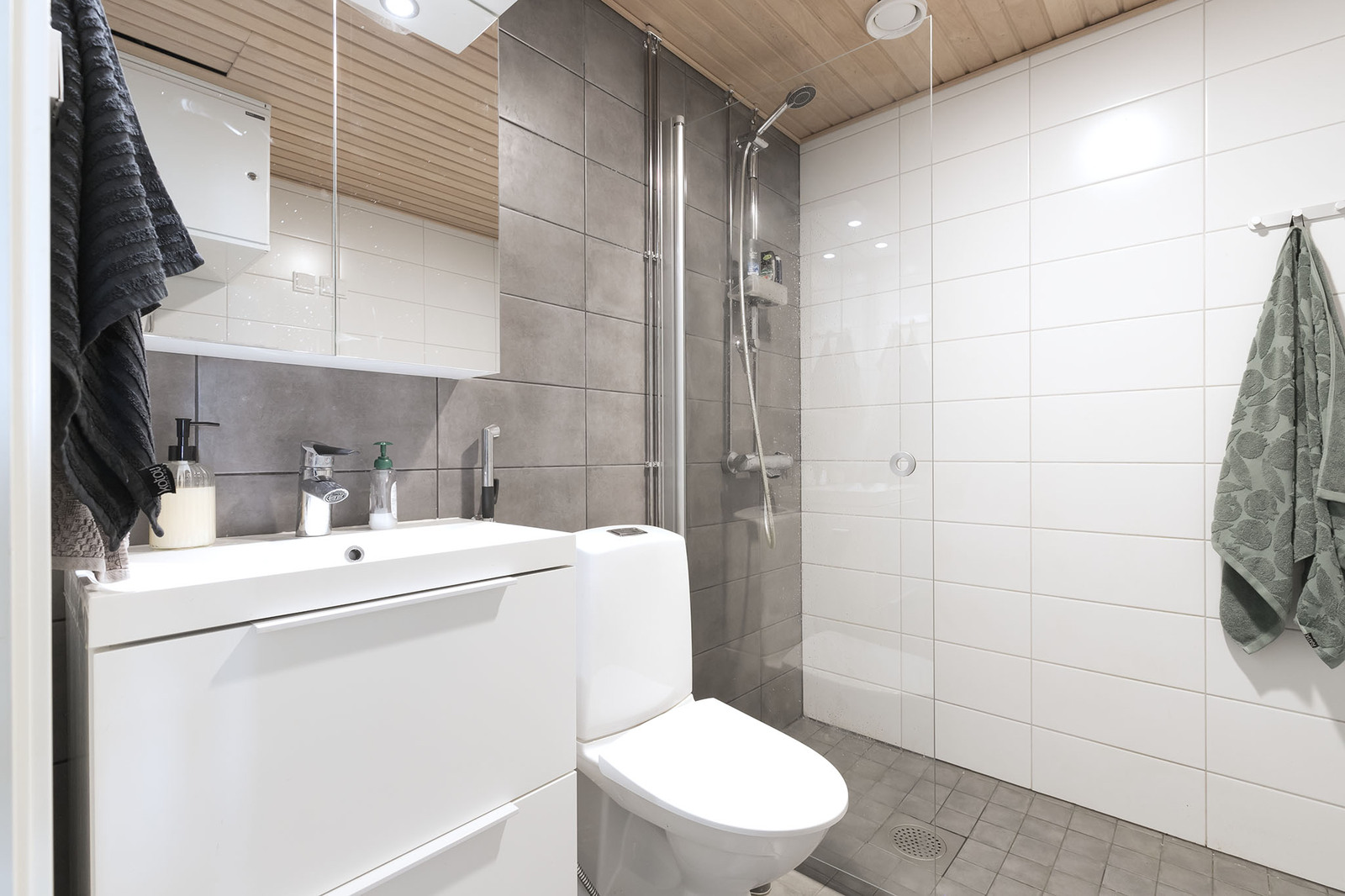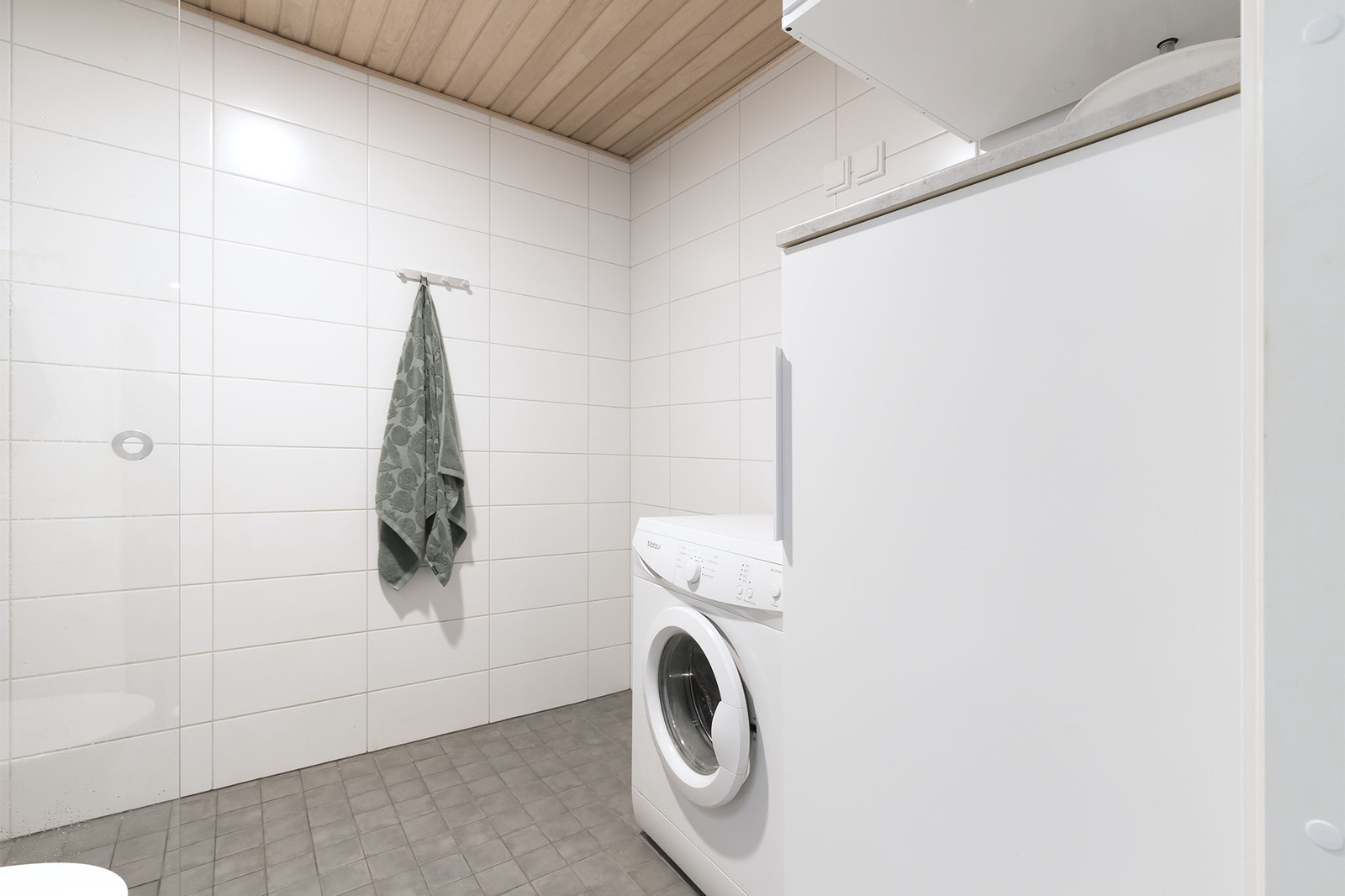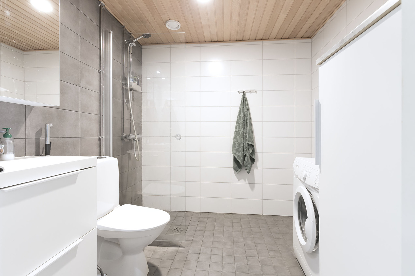 Suihkuseinä, allaskaappi, pesukoneliitäntä, lattialämmitys, peilikaappi, wc-istuin, suihku ja kiinteät valaisimet, seinät (kaakeli), lattiat (laatta) |