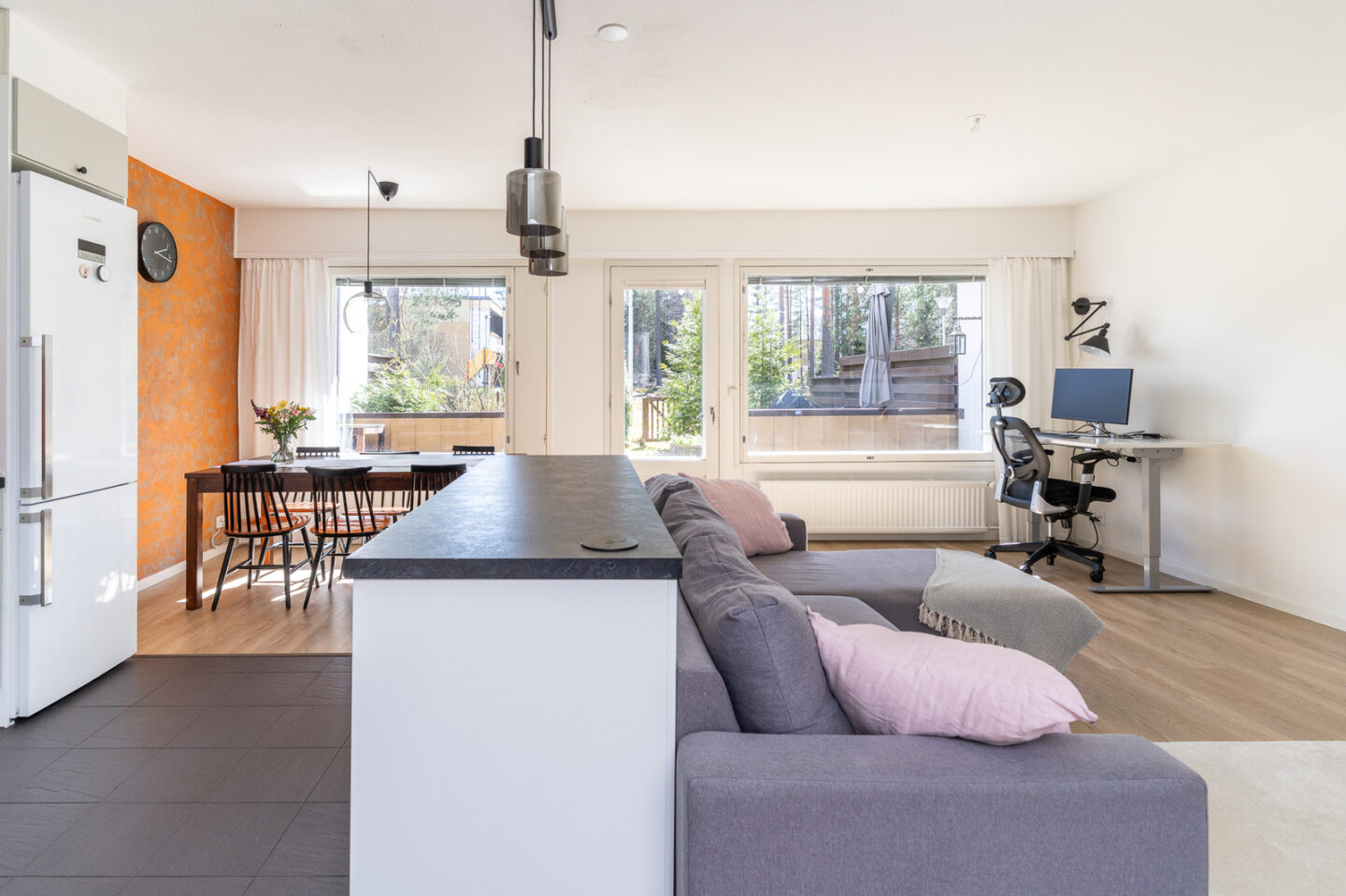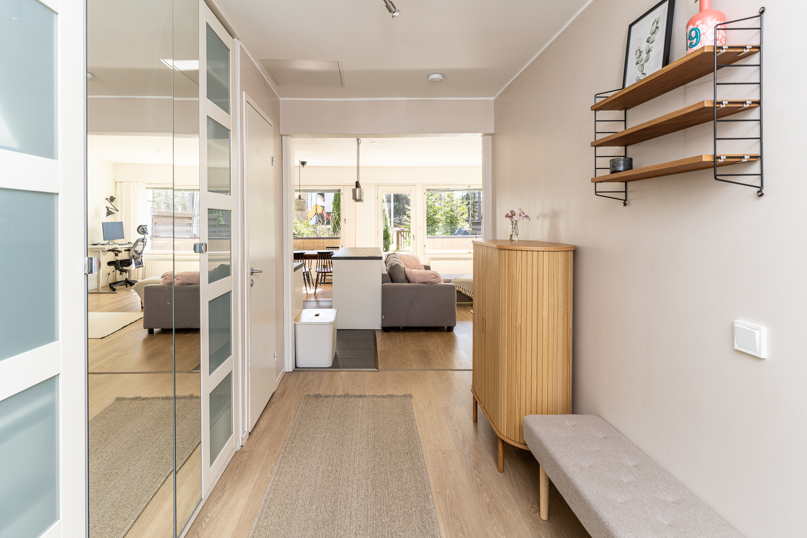 Asunnon pohjaratkaisu on avara ja toimiva, ja se käsittää kaksi makuuhuonetta, olohuoneen, keittiön sekä oman saunan. Keittiö on hyvin varusteltu, ja kylpyhuoneessa on mukavuutta lisäävä lattialämmitys. Etelään suuntautuva parveke tarjoaa viihtyisän paikan rentoutumiseen ja näkymät taloyhtiön suurelle piha-alueelle, josta löytyy myös vastikään uusittu leikkipaikka.