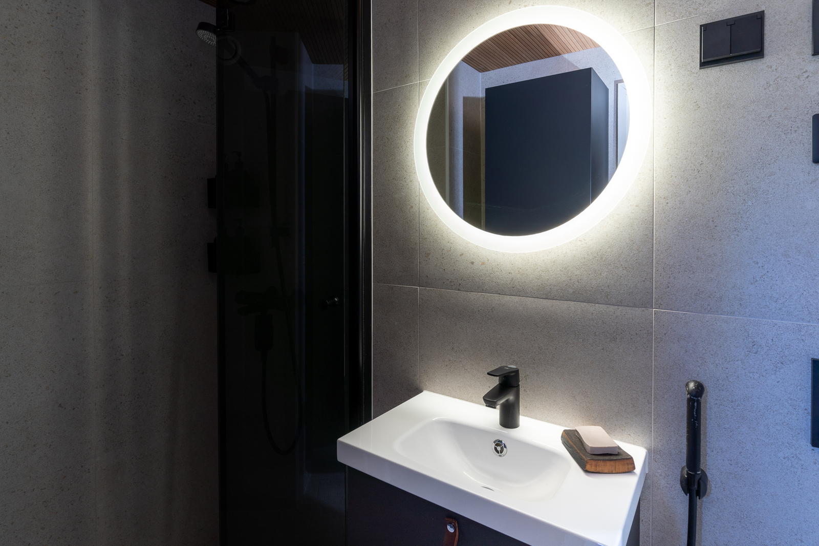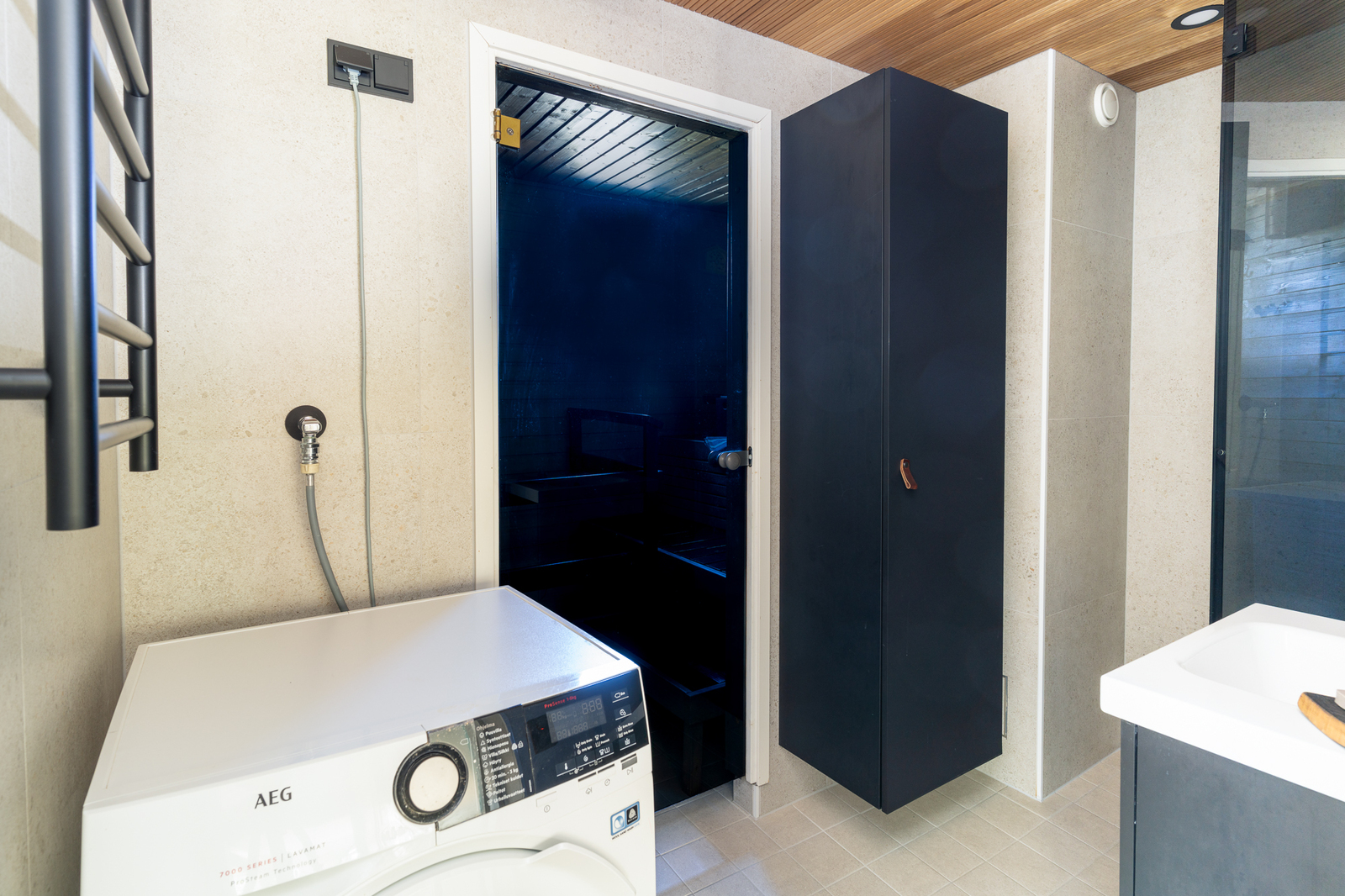 | Kylpyhuoneen kuvaus | Lattialämmitys, peili, suihkuseinä, suihku, allaskaappi, pesukoneliitäntä ja kiinteät valaisimet, seinät (kaakeli), lattiat (laatta) |