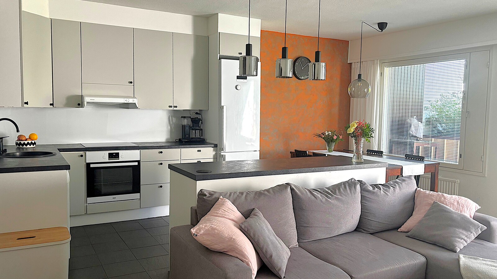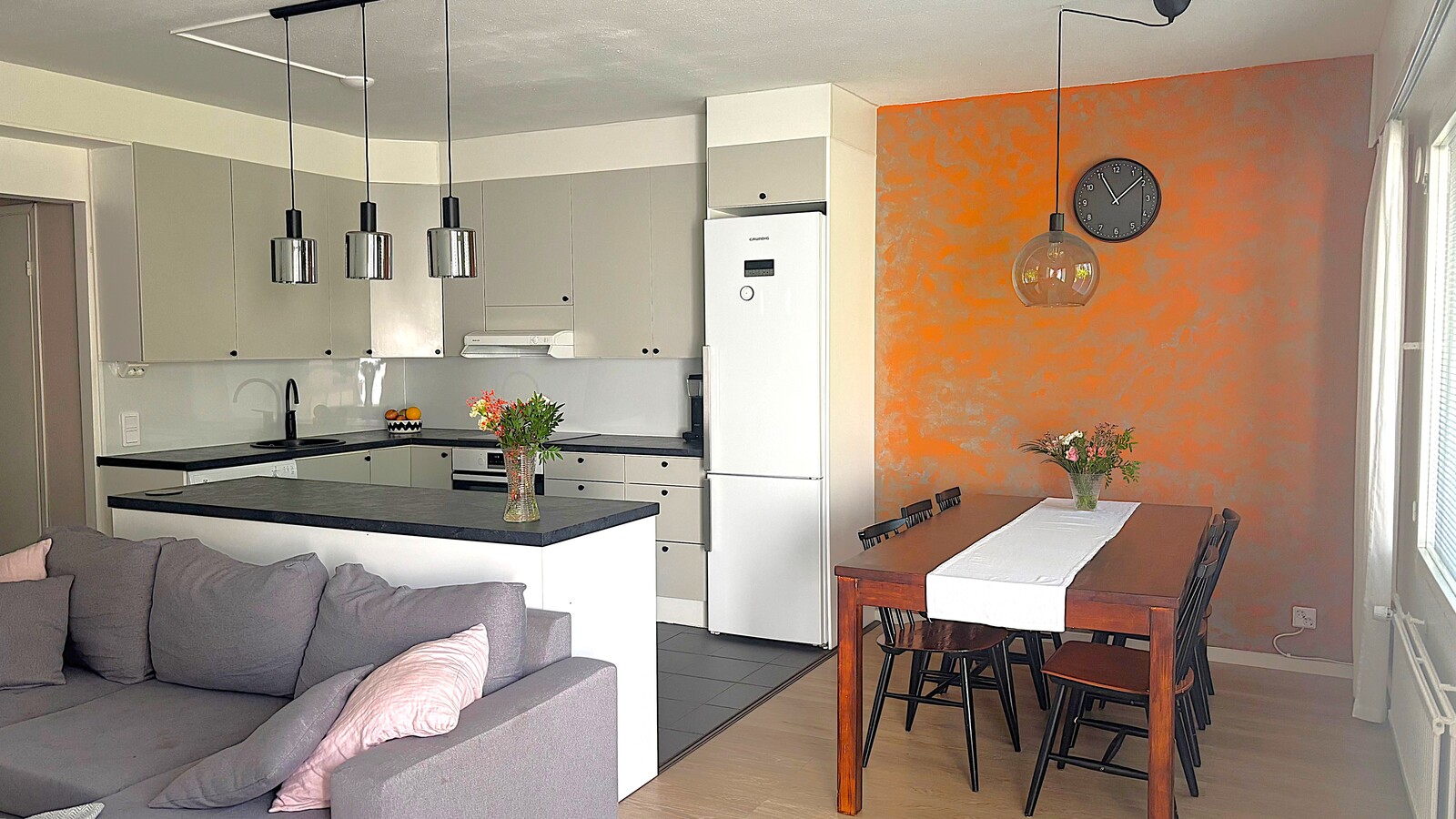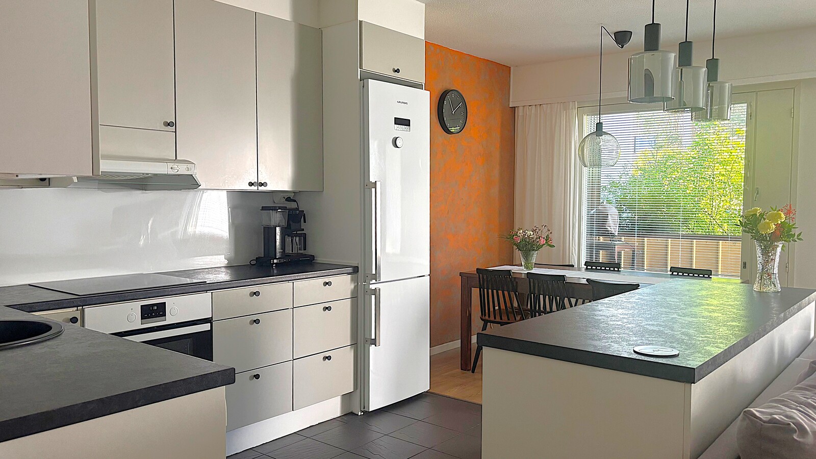 | Keittiön kuvaus | Liesi (Induktioliesi ja erillisuuni), seinät (maali), lattiat (laatta), jääkaappipakastin, erillisuuni, liesi, liesituuletin ja astianpesukone |