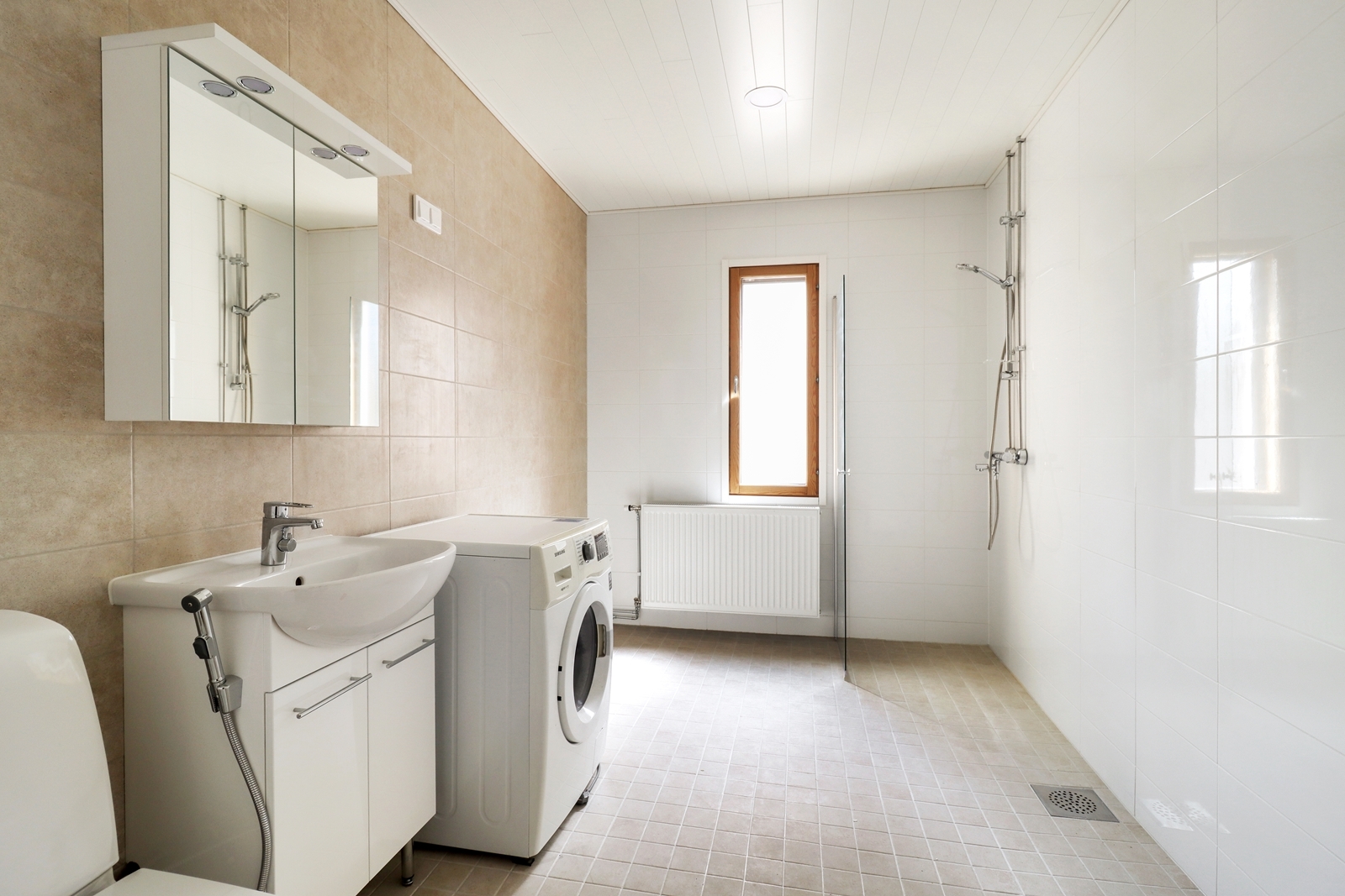 Allaskaappi, peilikaappi, suihku, pesukone, suihkuseinä ja wc-istuin, seinät (kaakeli), lattiat (laatta) |