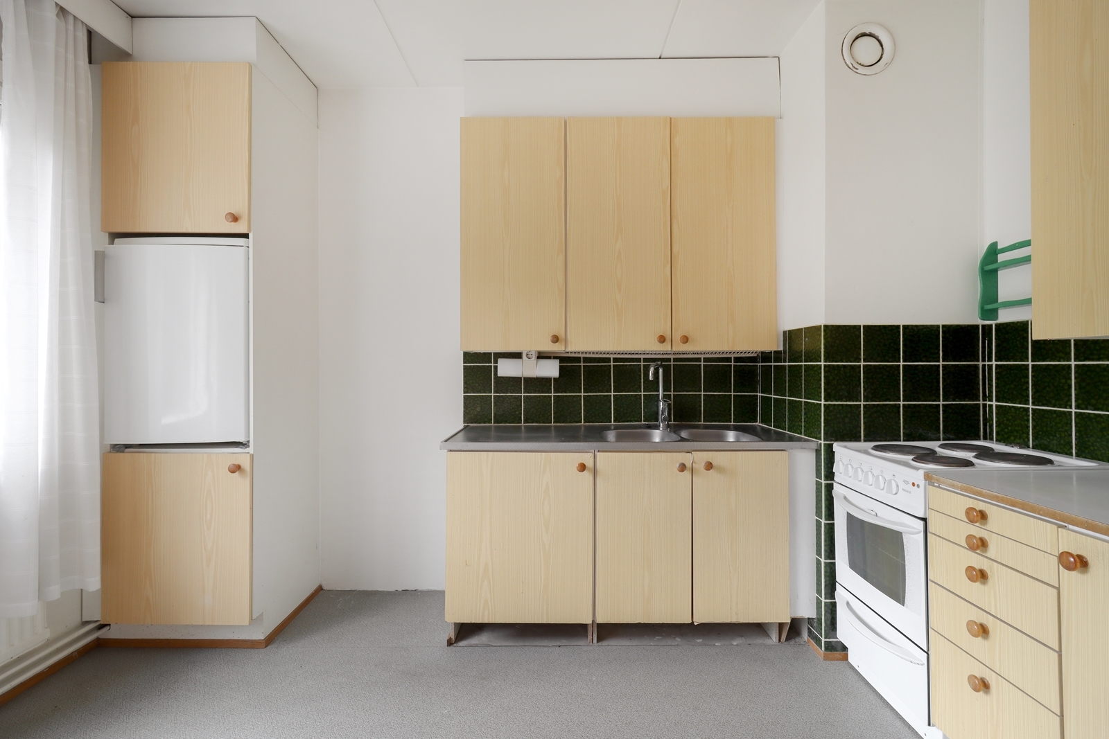 Liesi (sähköliesi), työtasot (laminaatti), seinät (maali ja osalaatoitus), lattiat (muovimatto), erillinen pakastin, liesi, jääkaappi ja varattu paikka astianpesukoneelle, kiinteät valaisimet |