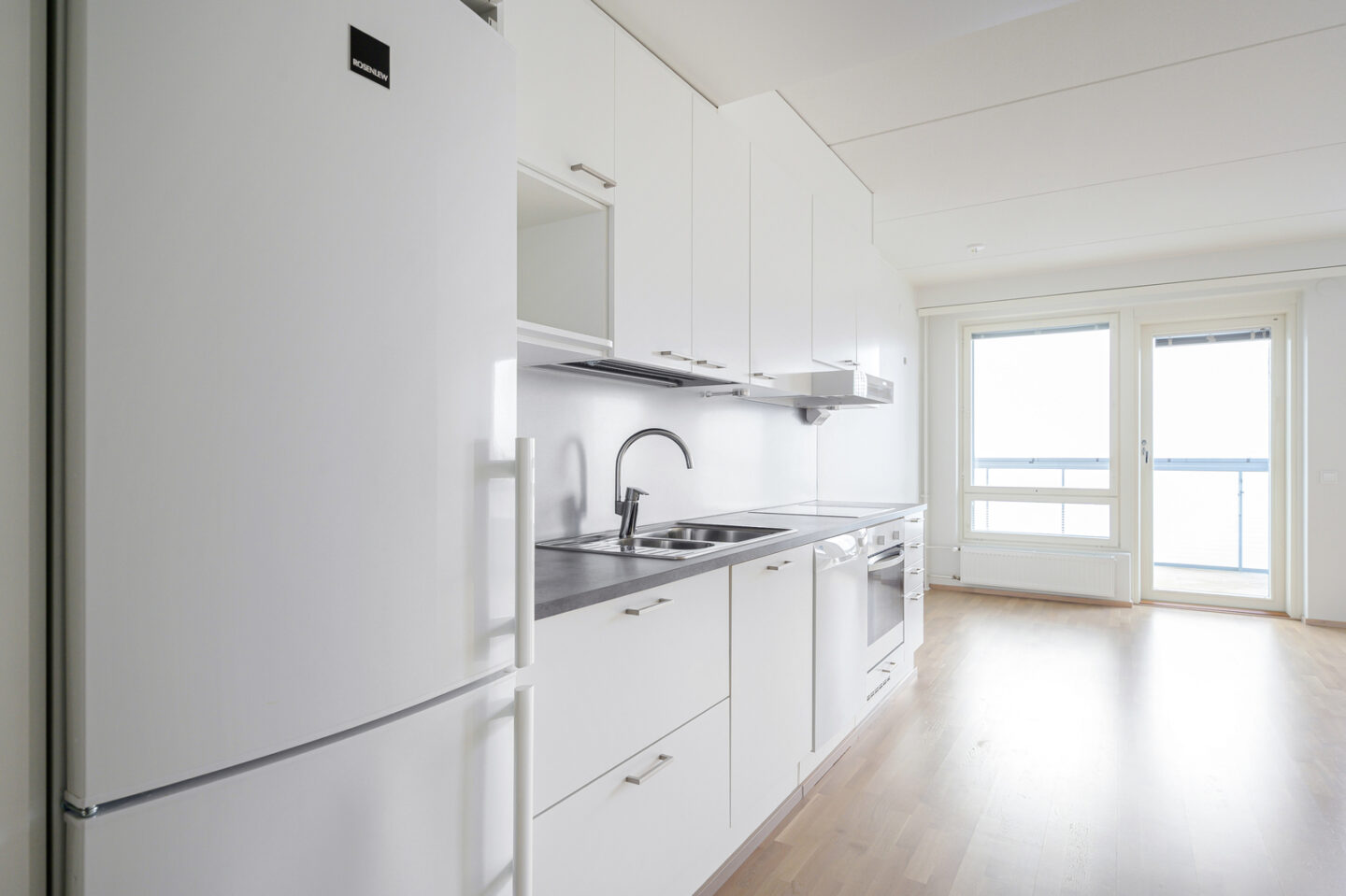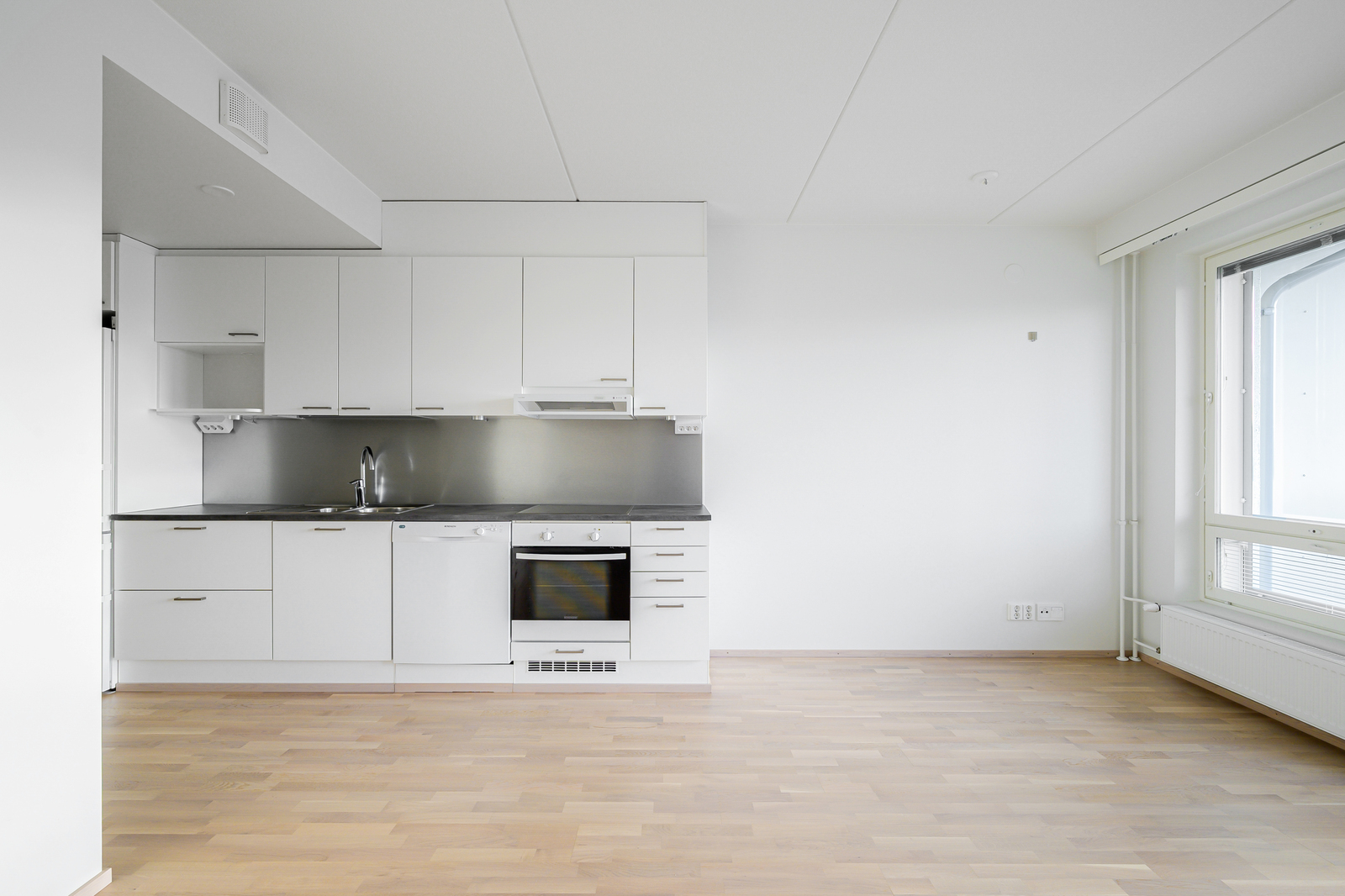 Liesi (Keraaminen liesi ja erillisuuni), seinät (maali), lattiat (parketti), erillisuuni, jääkaappipakastin, liesituuletin, astianpesukone ja kiinteät valaisimet |