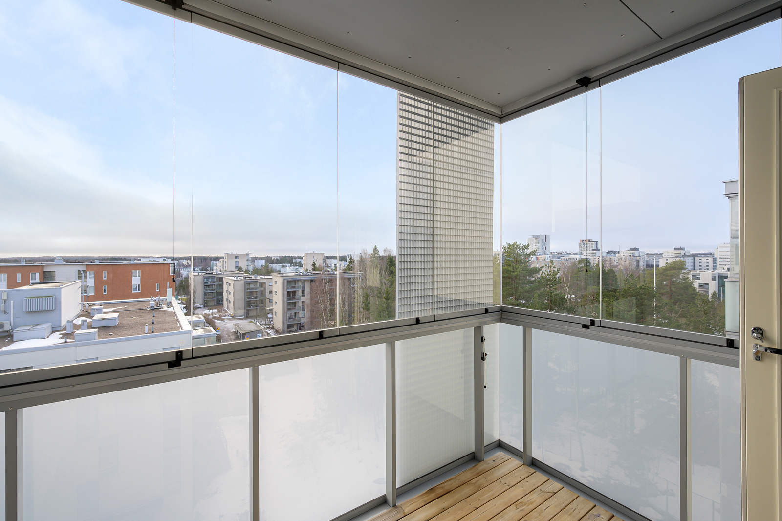 Tehokas ja toimiva tilankäyttö, lasitettu parveke sekä vaatehuone tuovat asumismukavuutta.