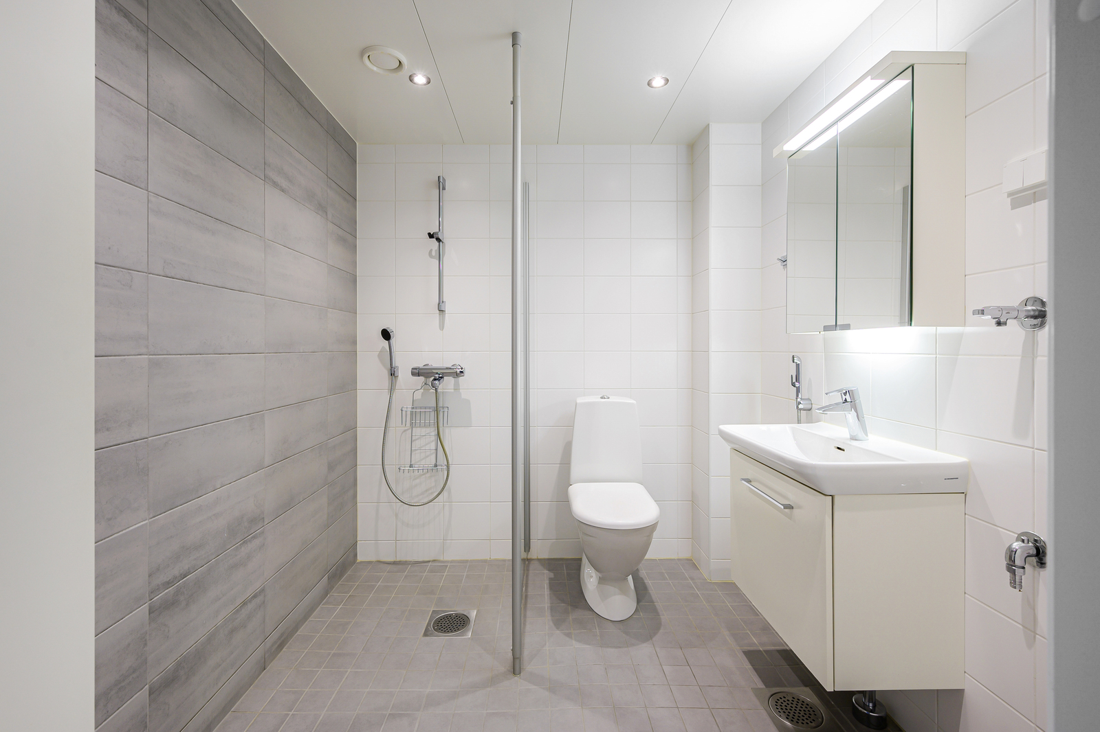 Suihku, lattialämmitys, suihkuseinä, wc-istuin, peilikaappi ja pesukoneliitäntä, seinät (kaakeli), lattiat (laatta) |
