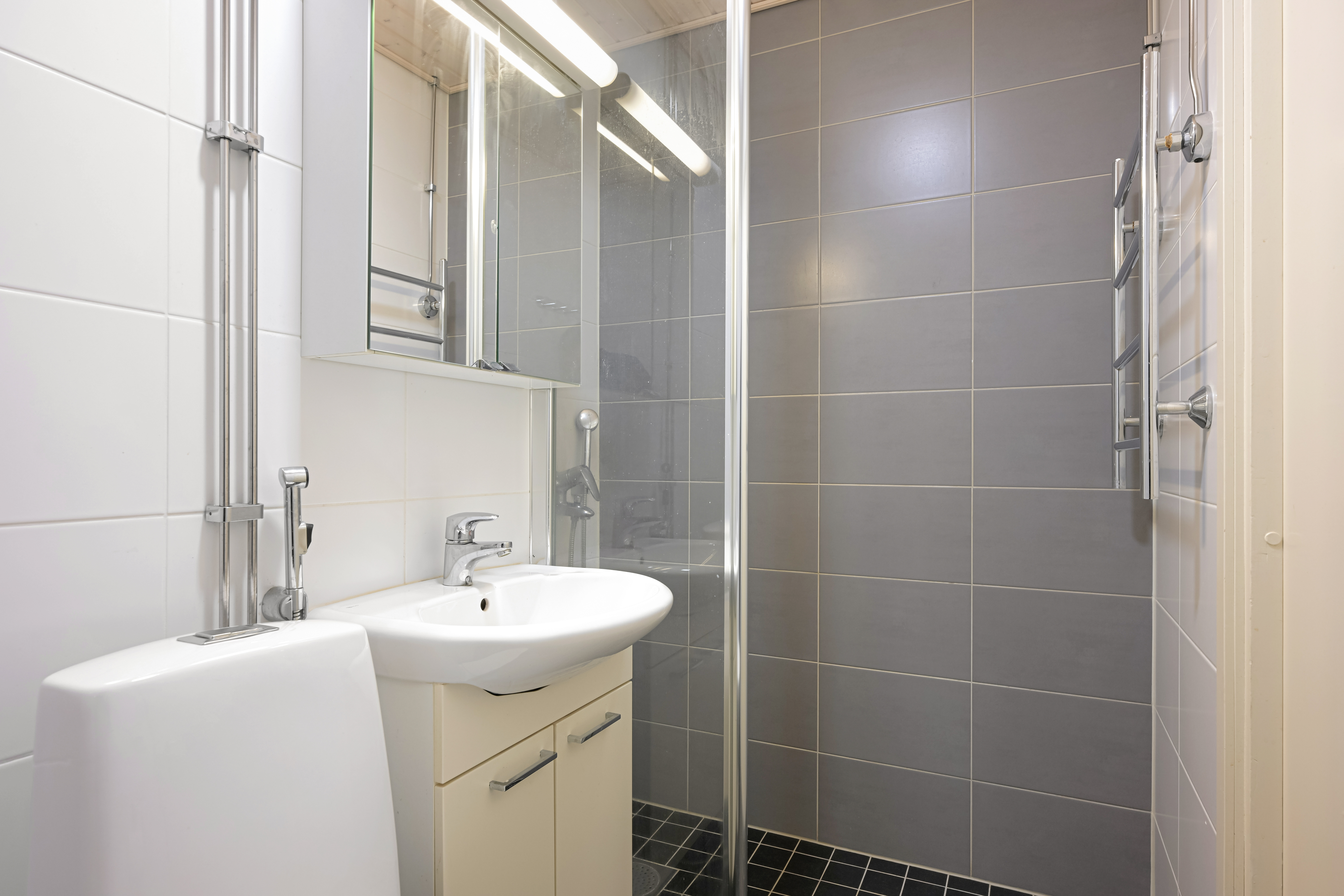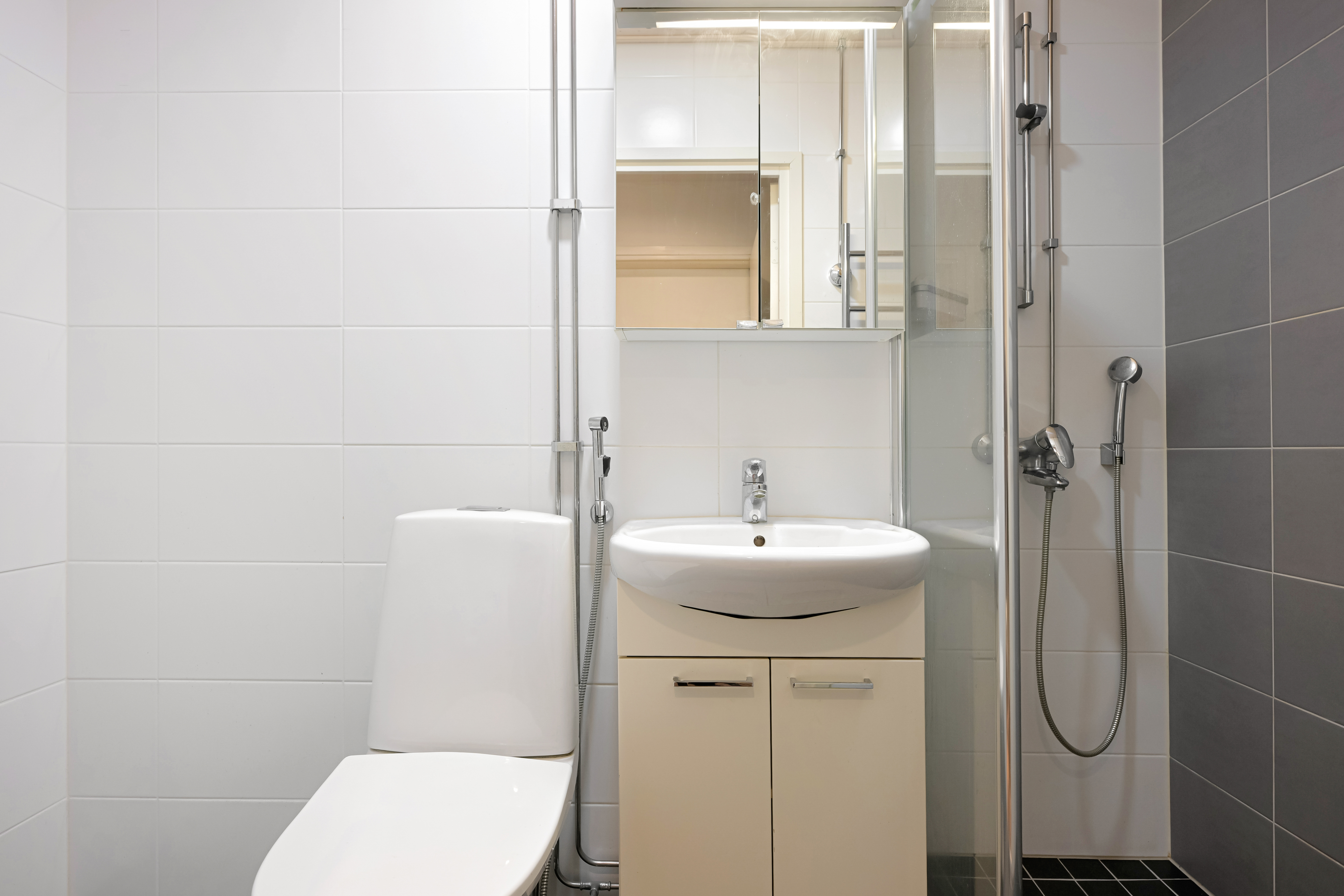 WC-istuin, suihku, suihkuseinä, pesukoneliitäntä, pesuallas, allaskaappi ja peilikaappi, seinät (kaakeli), lattiat (laatta) |