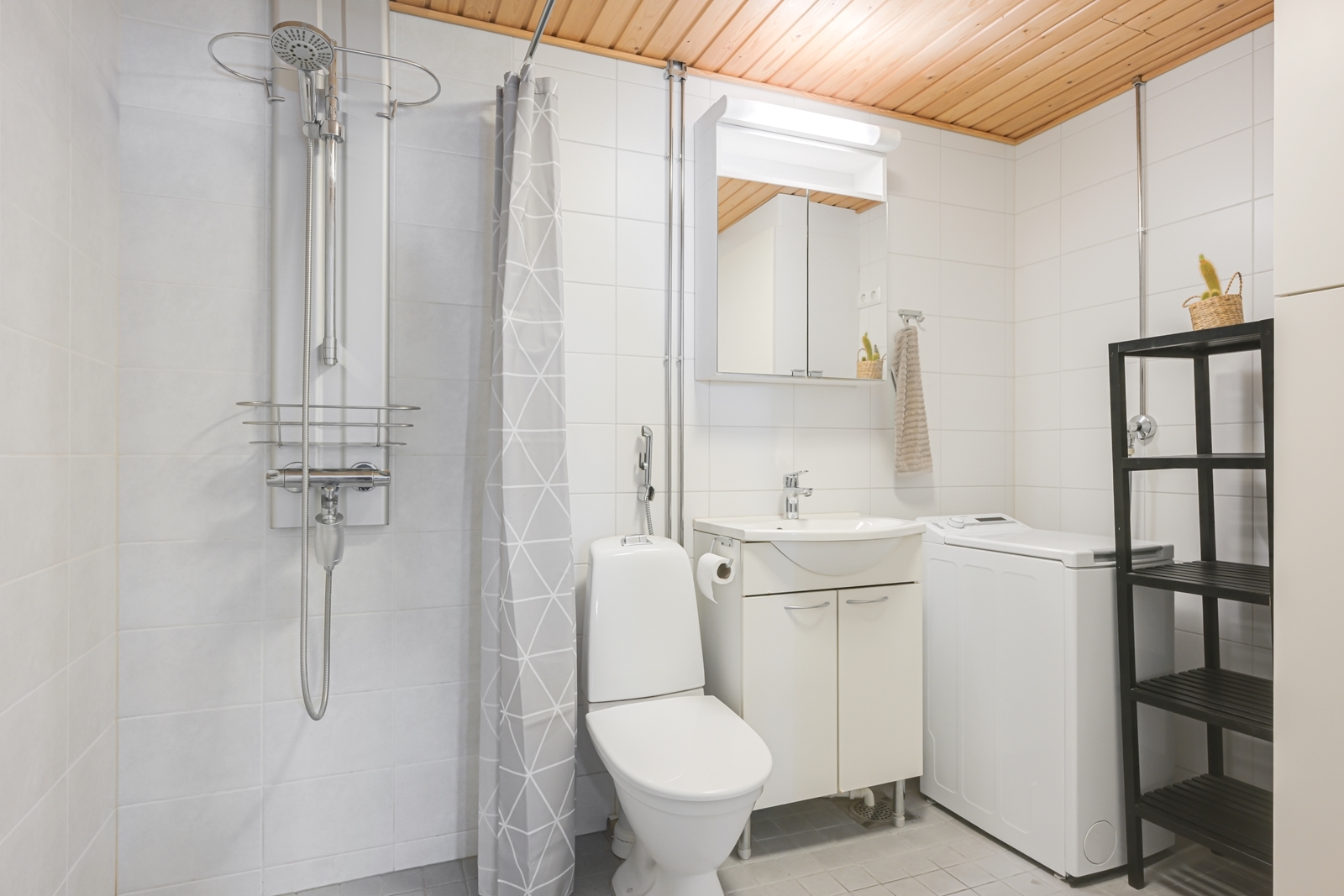 | Kylpyhuoneen kuvaus | Suihku, allaskaappi, lattialämmitys, wc-istuin, peilikaappi, pesukoneliitäntä ja kiinteät valaisimet, seinät (kaakeli), lattiat (laatta) |