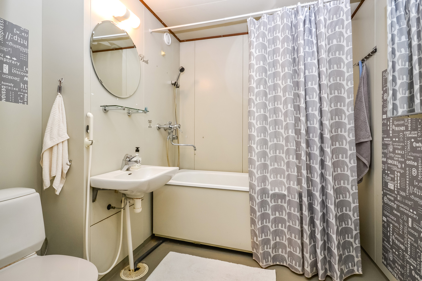 | Kylpyhuoneen kuvaus | Suihku, kylpyamme, wc-istuin ja pesukoneliitäntä, seinät (maali), lattiat (muovimatto) |
