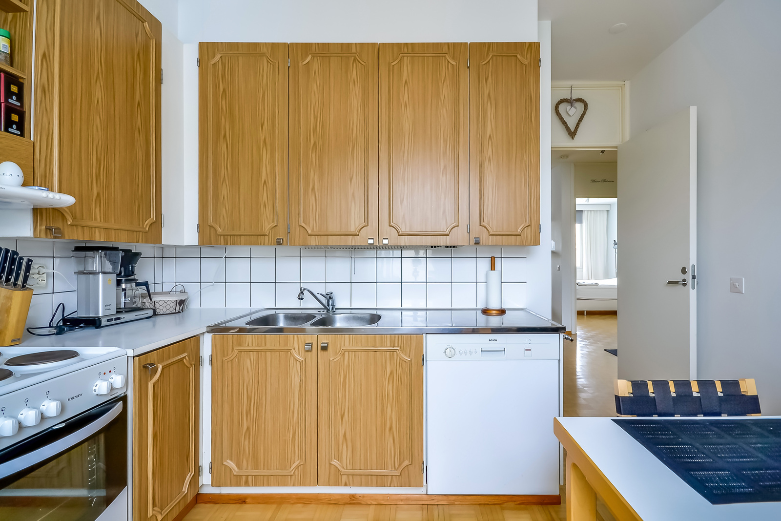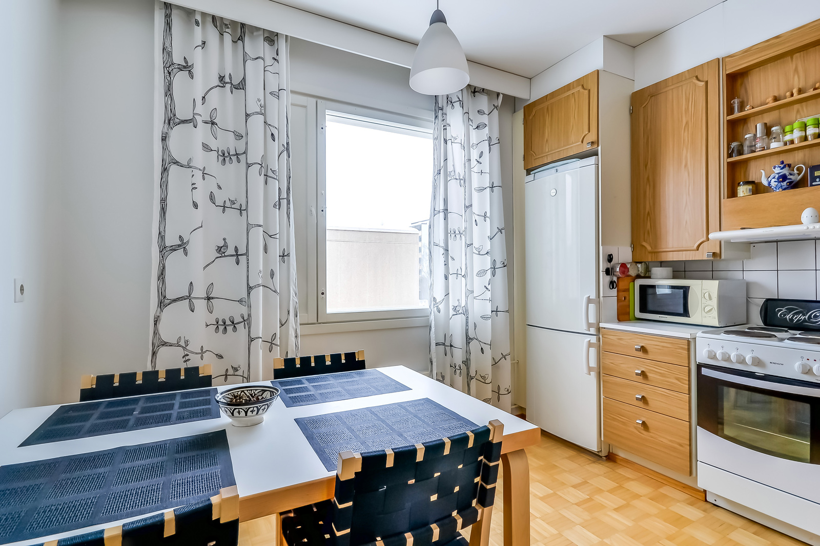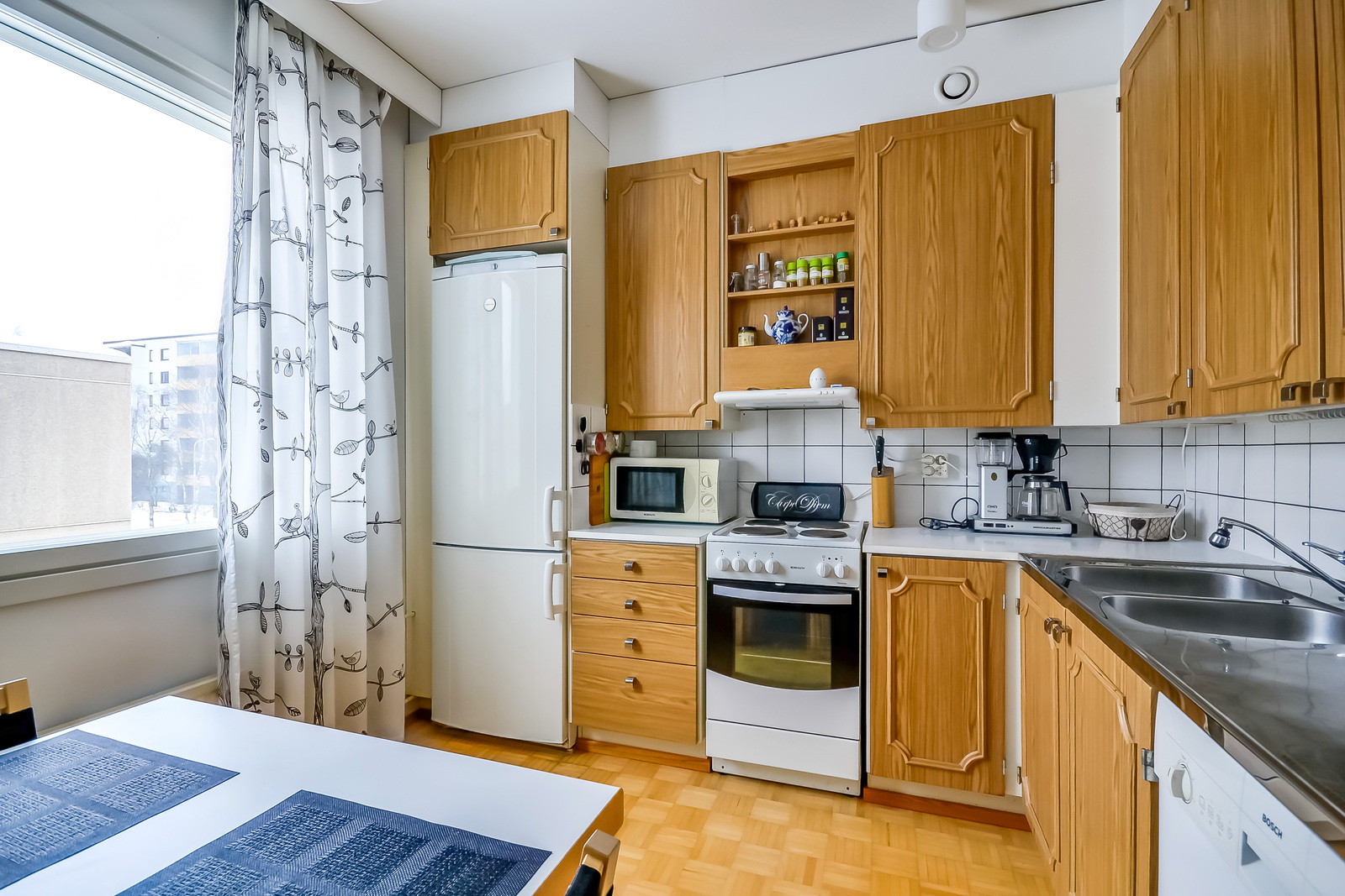 | Keittiön kuvaus | Liesi (sähköliesi), työtasot (laminaatti), seinät (maali), lattiat (parketti), astianpesukone, liesi, jääkaappipakastin ja liesituuletin |