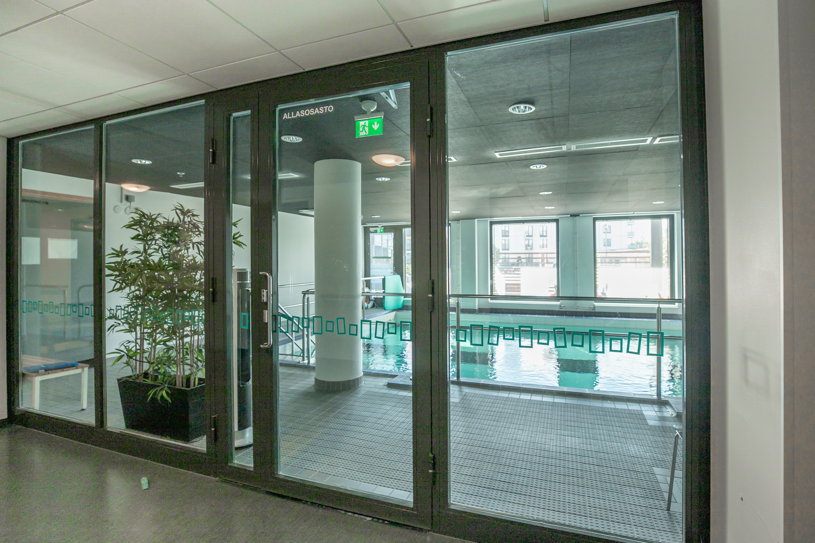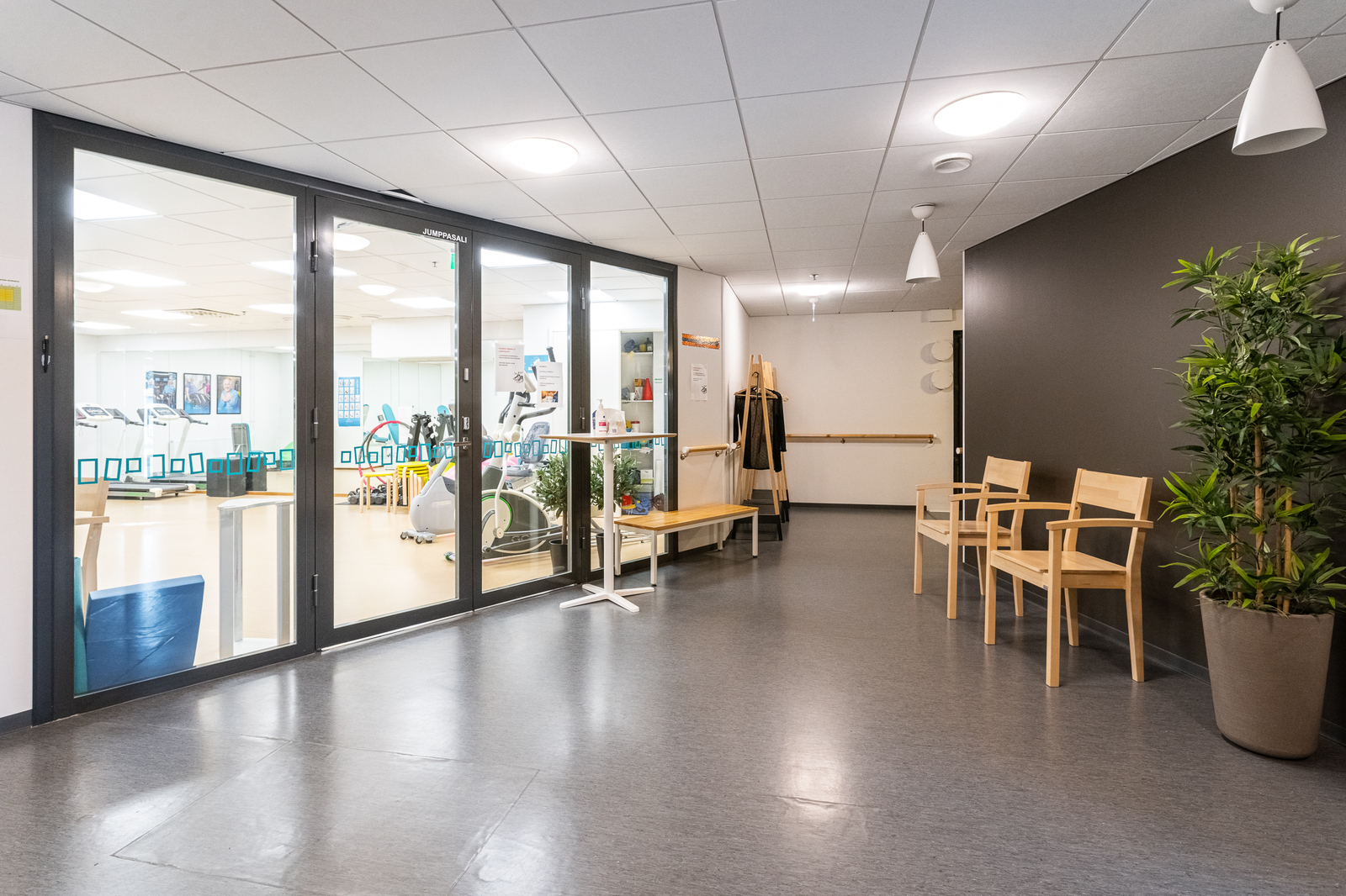Uima-allasosasto, kunto/ jumppasali, päiväsali, apuvälinevarasto. |