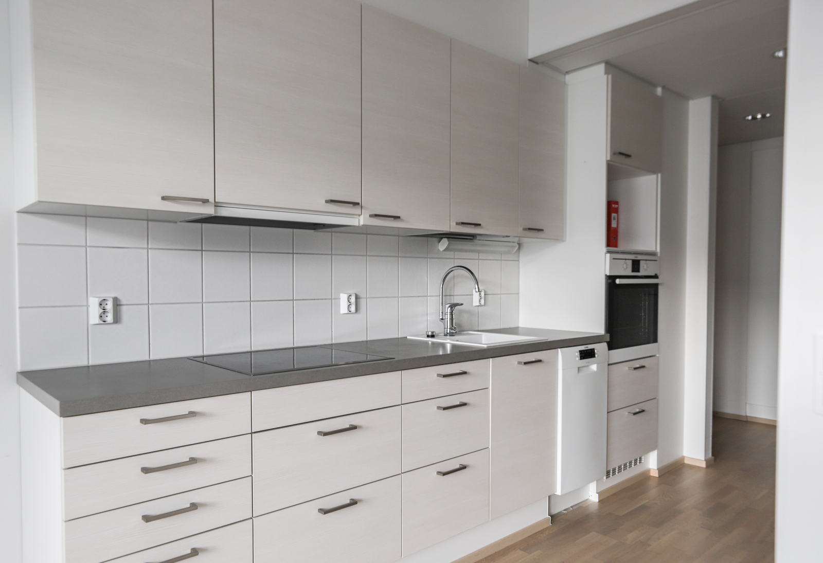 Liesi (erillisuuni, liesitaso), työtasot (laminaatti), seinät (maali), lattiat (parketti), liesituuletin, erillisuuni, astianpesukone, jääkaappipakastin ja liesitaso |