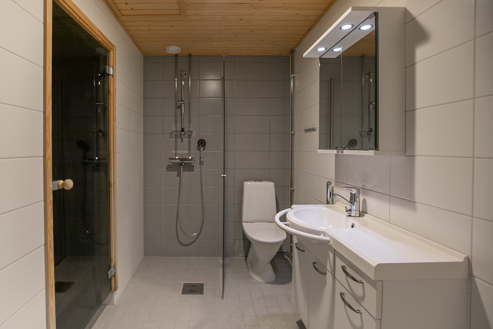 Pesukoneliitäntä, suihkuseinä, wc-istuin, lattialämmitys, peilikaappi ja suihku, seinät (kaakeli), lattiat (laatta) |