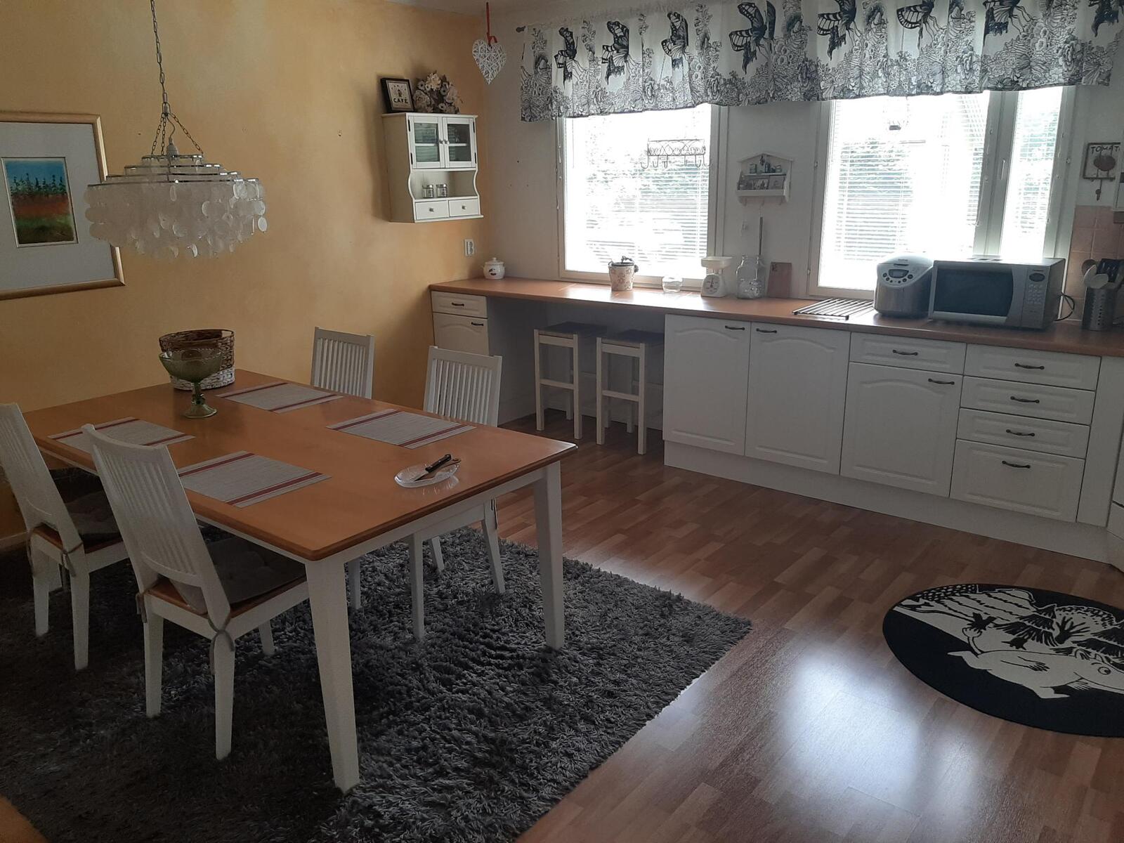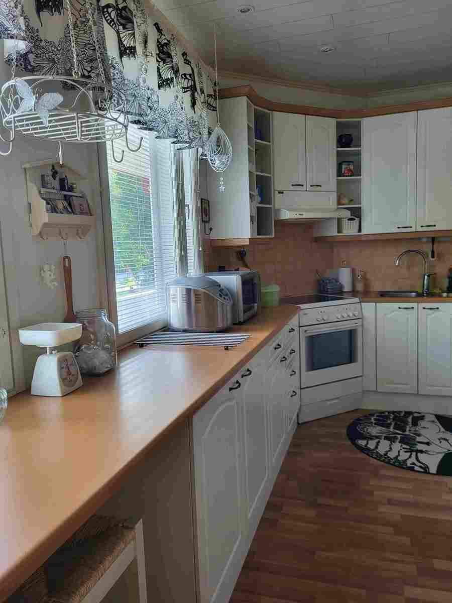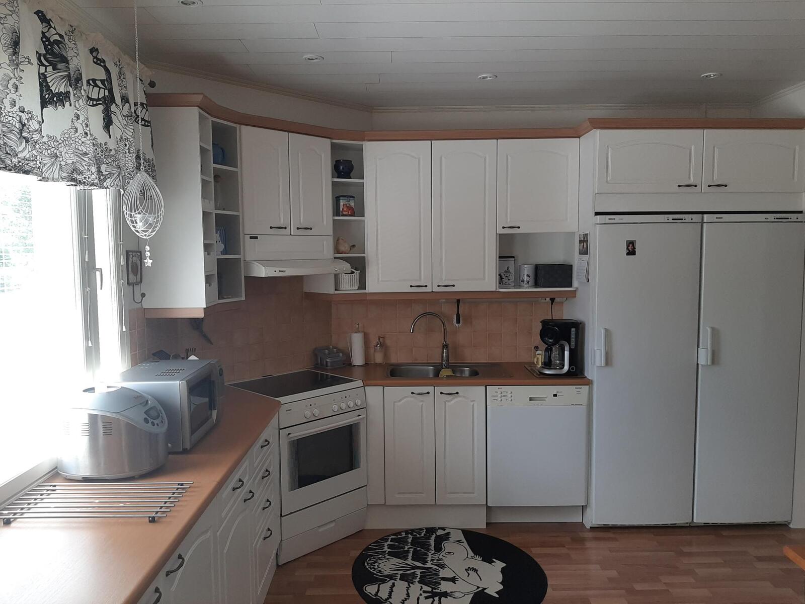 Liesi (Keraaminen liesi), työtasot (laminaatti), seinät (maali), lattiat (laminaatti), astianpesukone, liesituuletin, jääkaappi ja kiinteät valaisimet, pakastekaappi |
