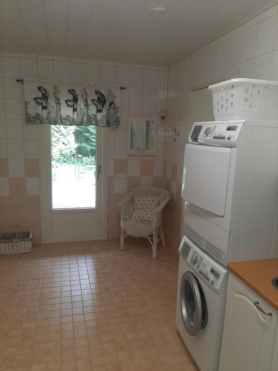 Pesuallas, keskuspölynimuri, lattiakaivo, pöytätaso, lattialämmitys ja pyykkikaapit, lattiat (laatta), seinät (kaakeli) |