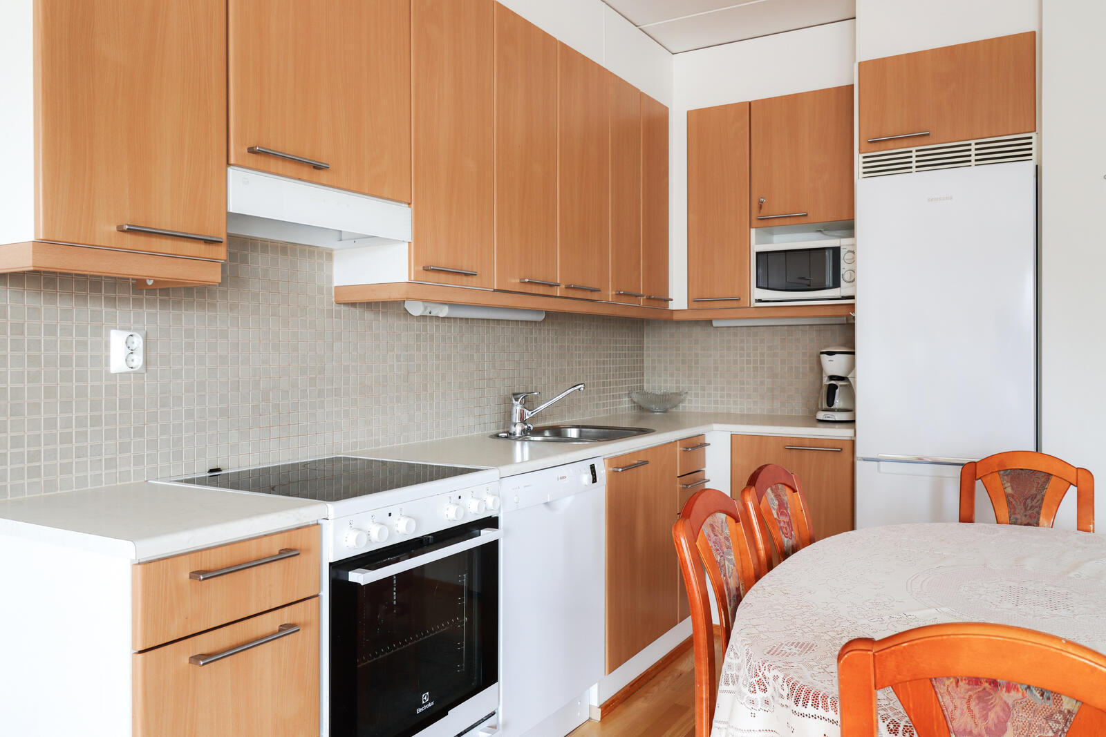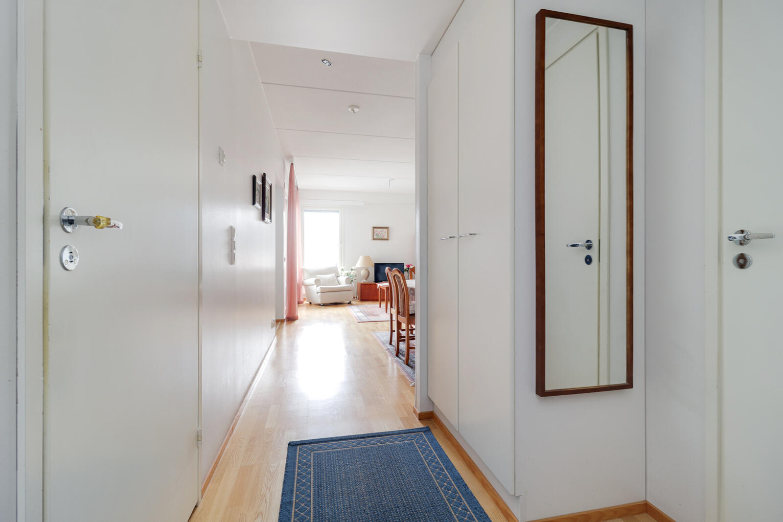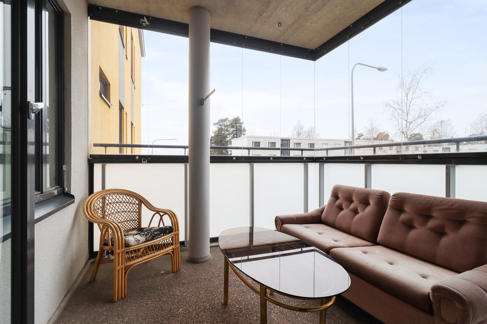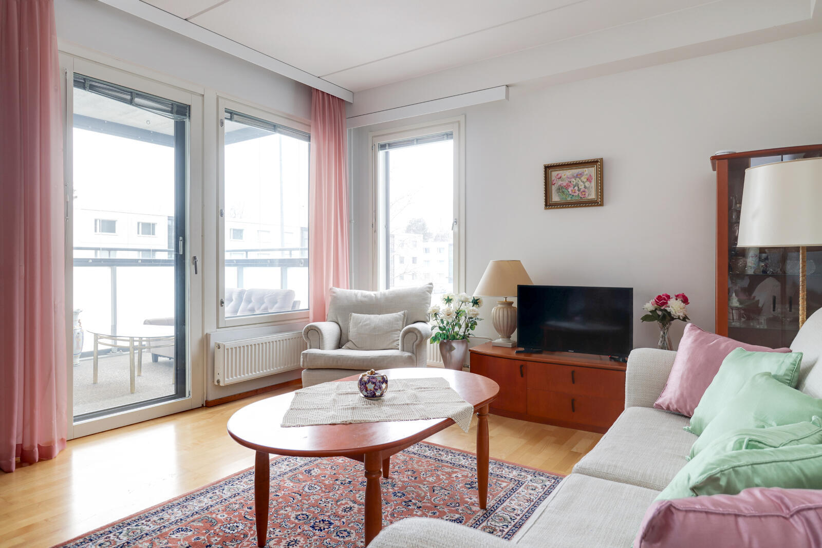 Pohjaltaan käytännöllisen asunnon huoneet ovat tilavat, kaappitilaa on runsaasti ja lasitetulla terassilla istuskelee mukavasti saunan jälkeen.