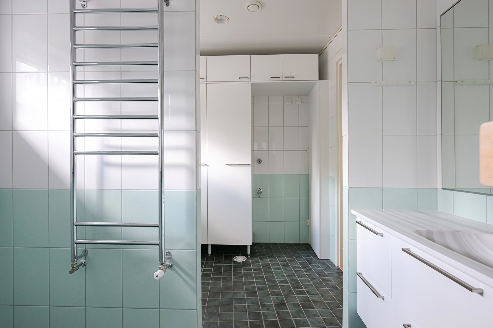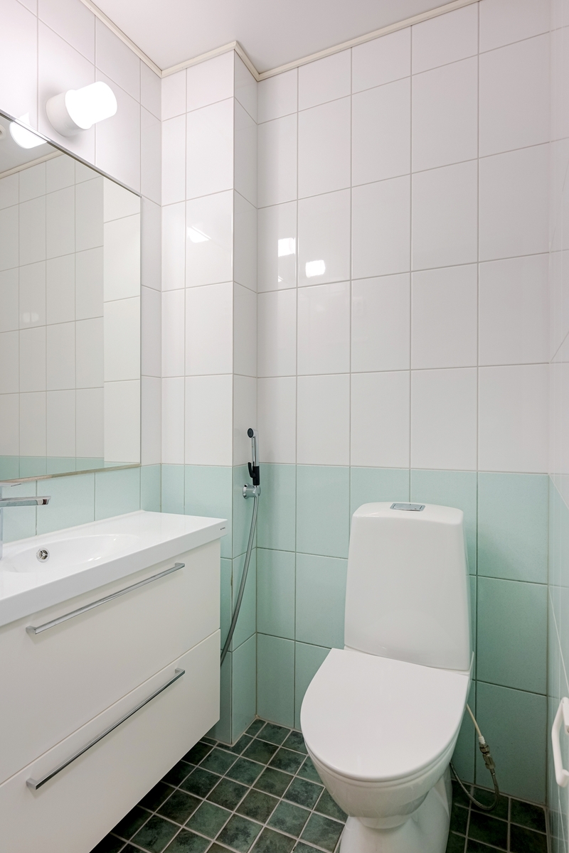 Pesukoneliitäntä, wc-istuin, peilikaappi, suihku, allaskaappi, peili, lattialämmitys ja kiinteät valaisimet, seinät (kaakeli), lattiat (laatta) |