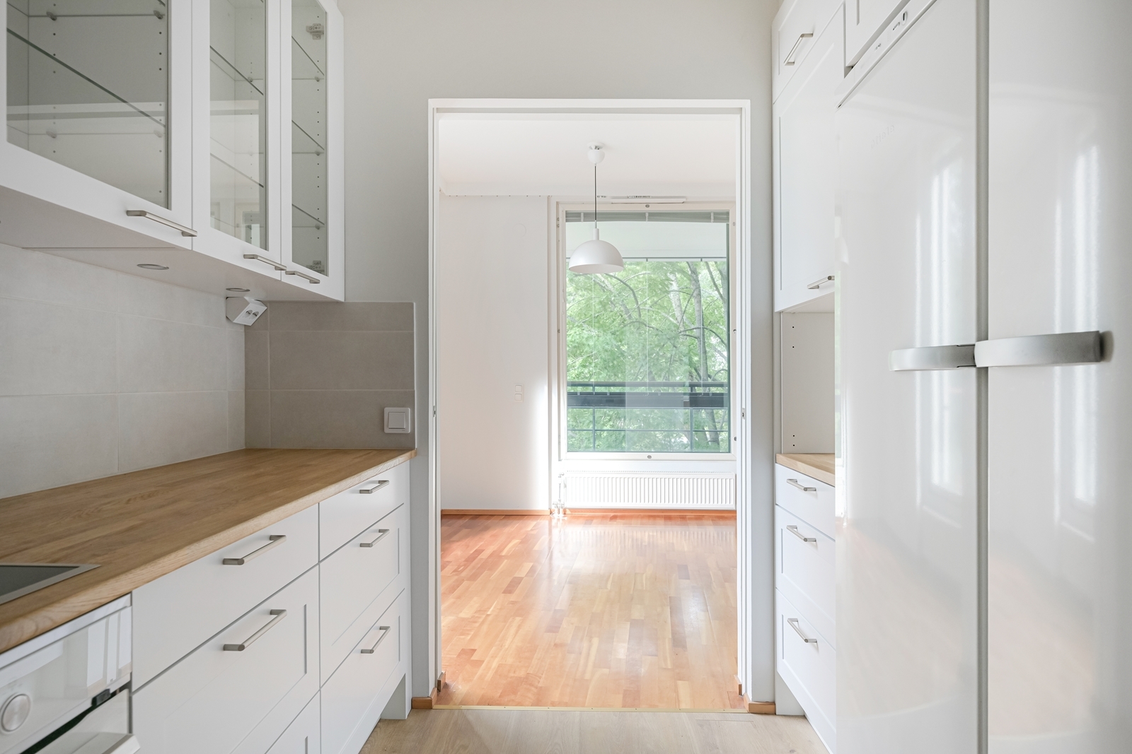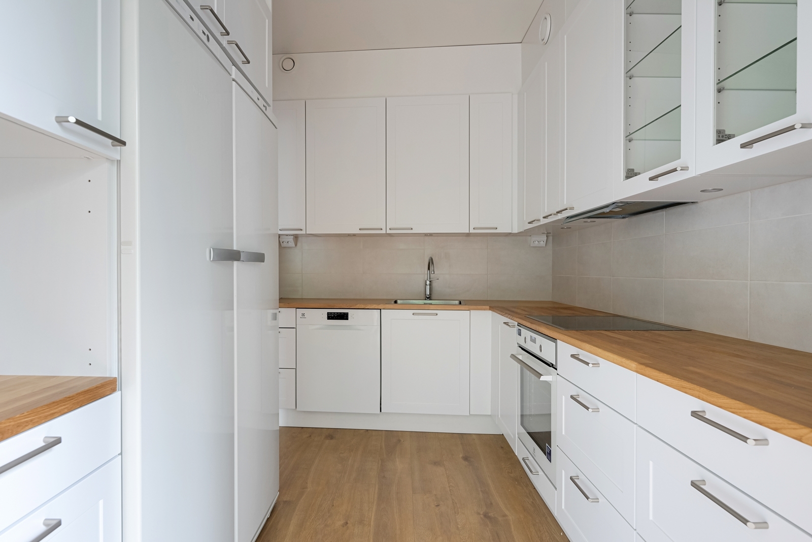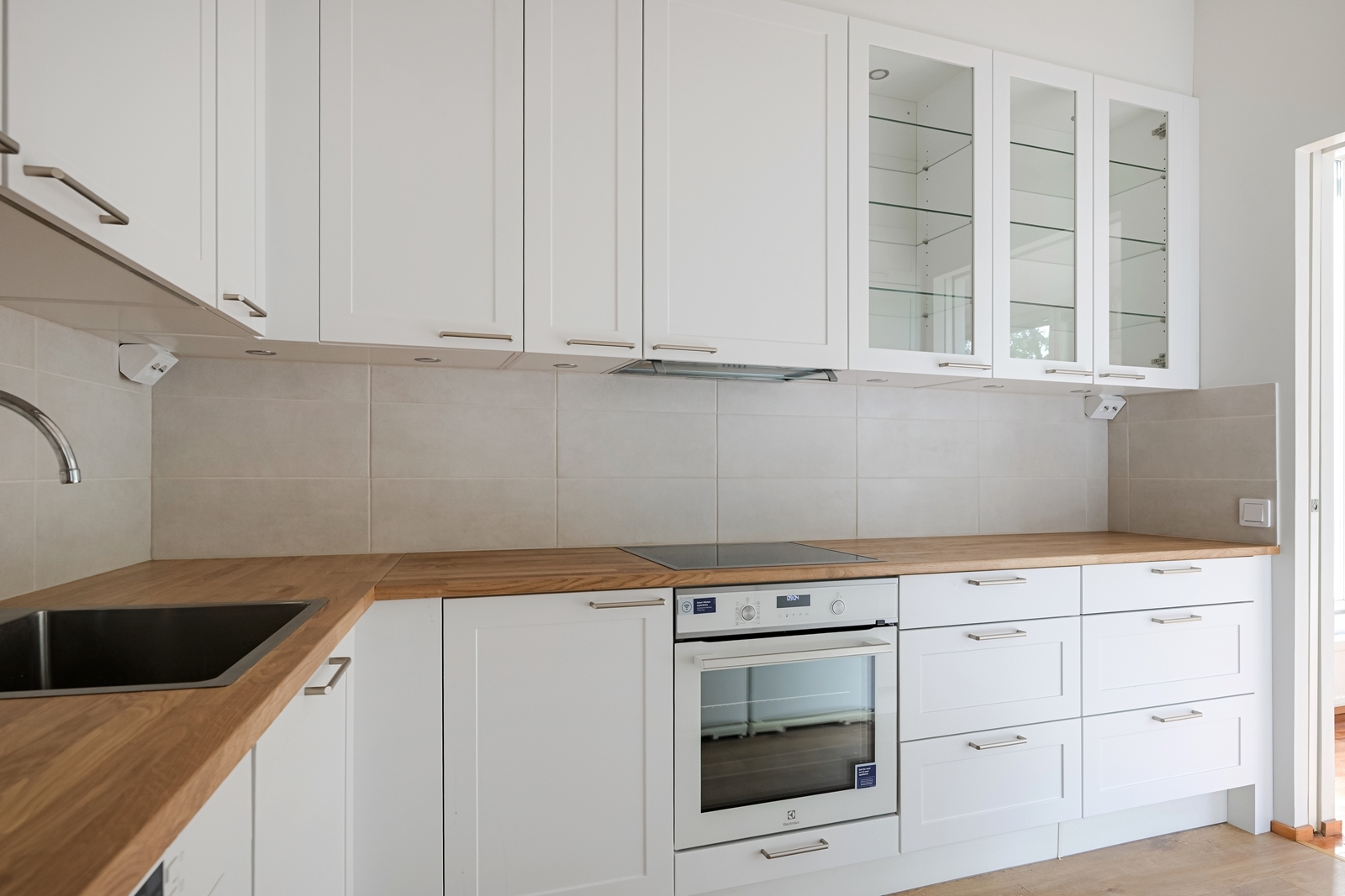 Liesi (Keraaminen liesi ja erillisuuni), seinät (maali), lattiat (vinyyli), astianpesukone, jääkaappi, erillisuuni, erillinen pakastin, liesituuletin ja kiinteät valaisimet |
