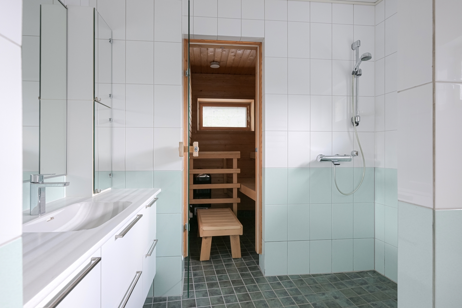 Seinät (puu), lattiat (laatta), Sähkökiuas, ikkunallinen sauna |