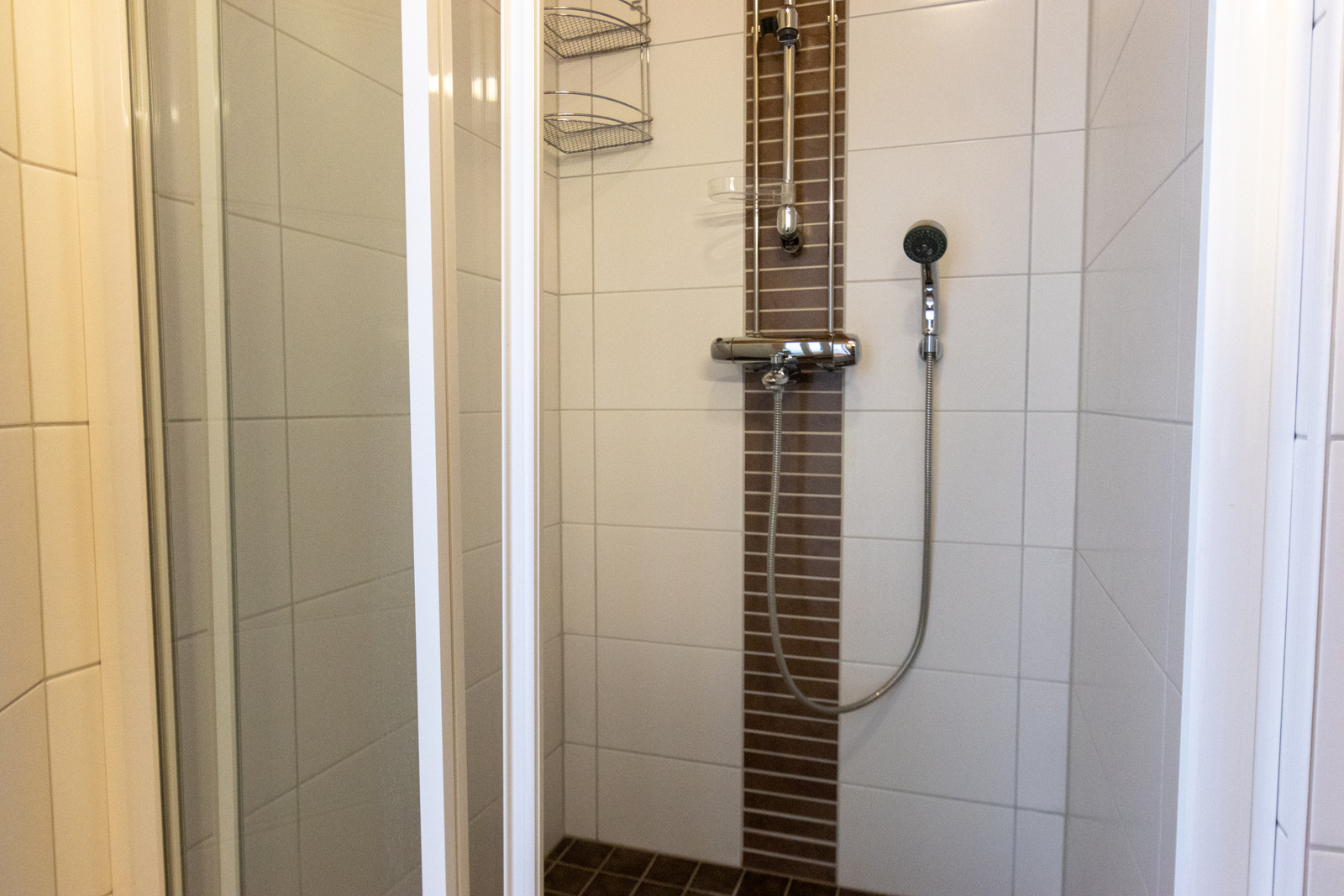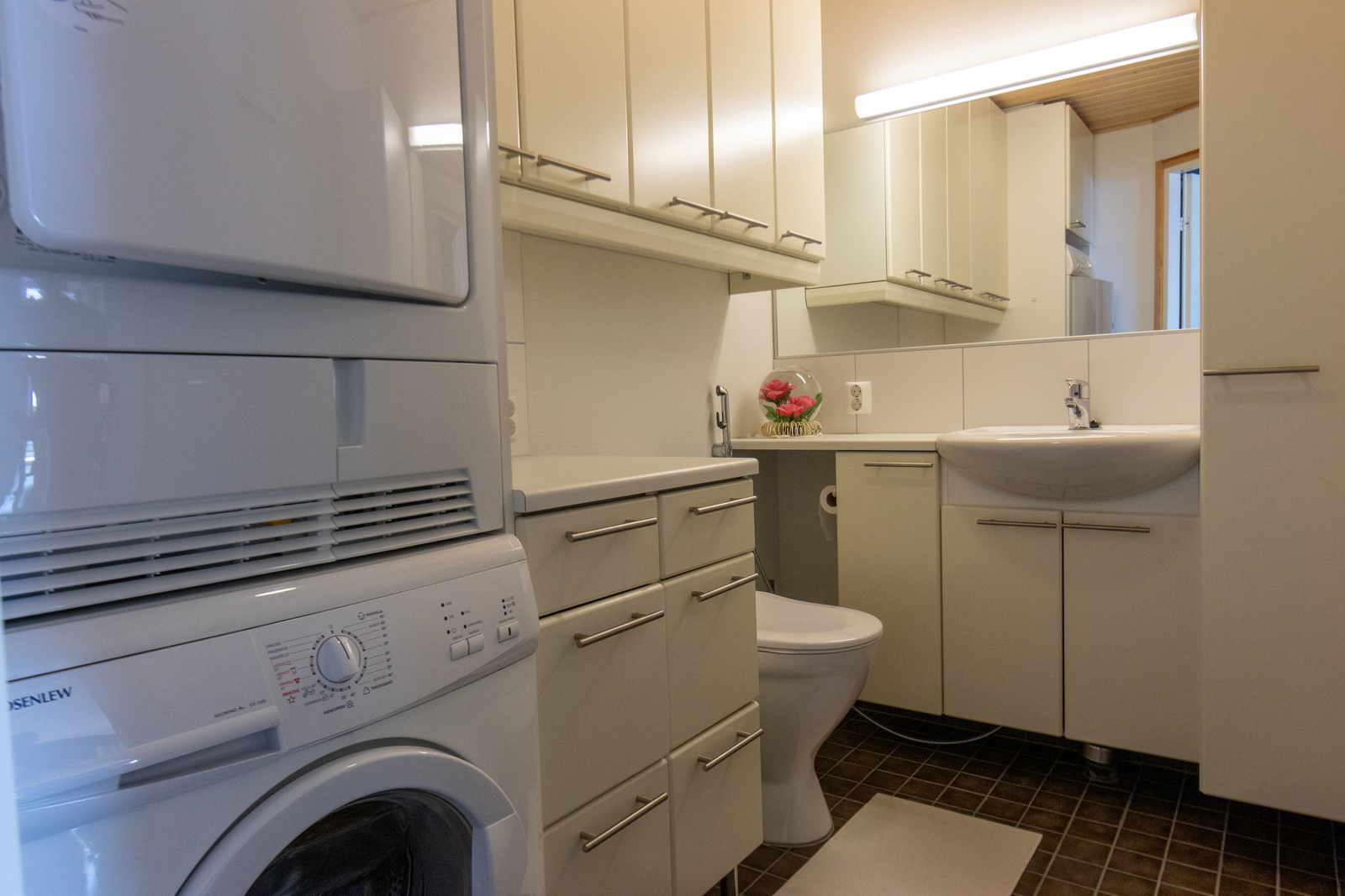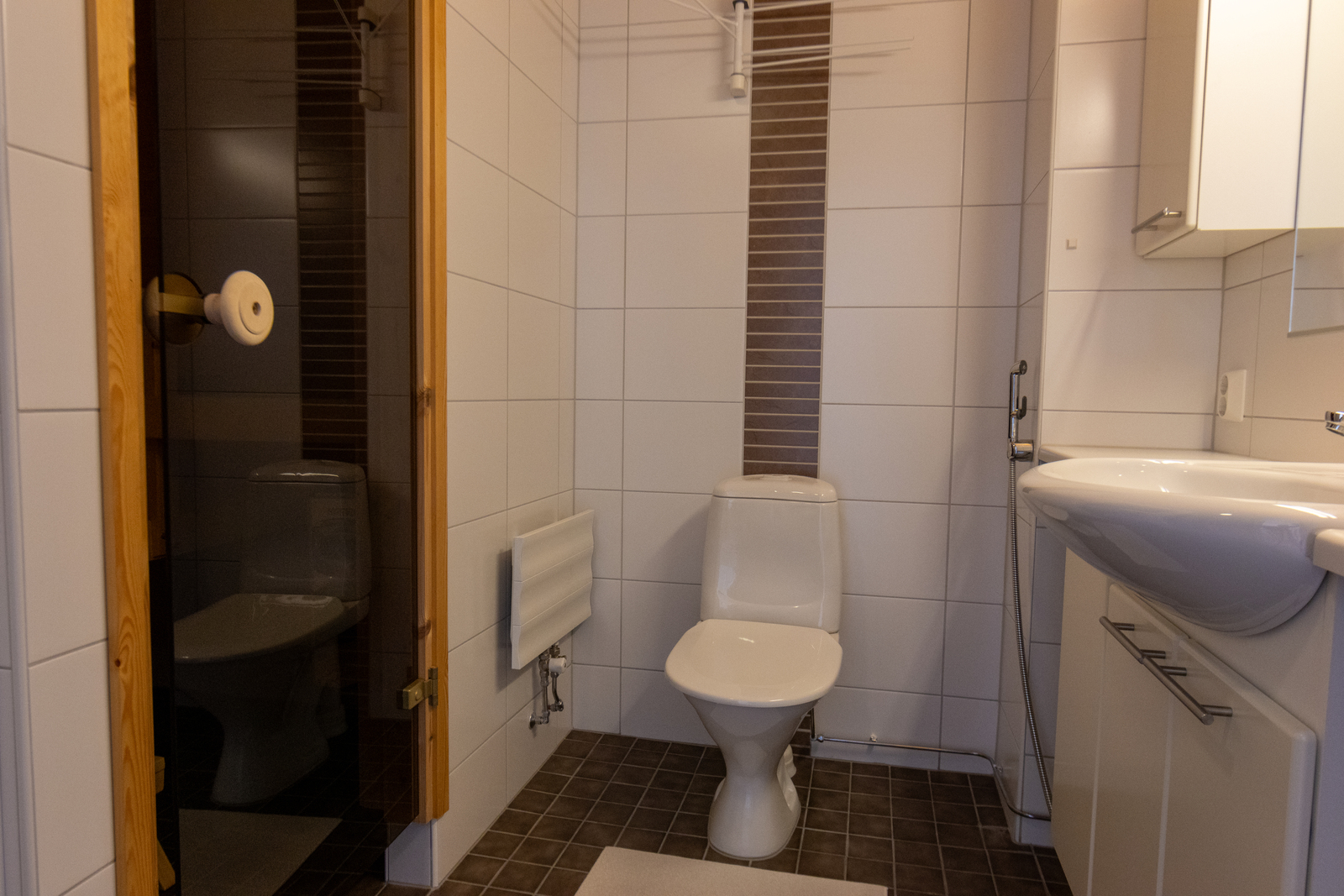 Peilikaappi, lattialämmitys ja kiinteät valaisimet, seinät (kaakeli), lattiat (laatta) |