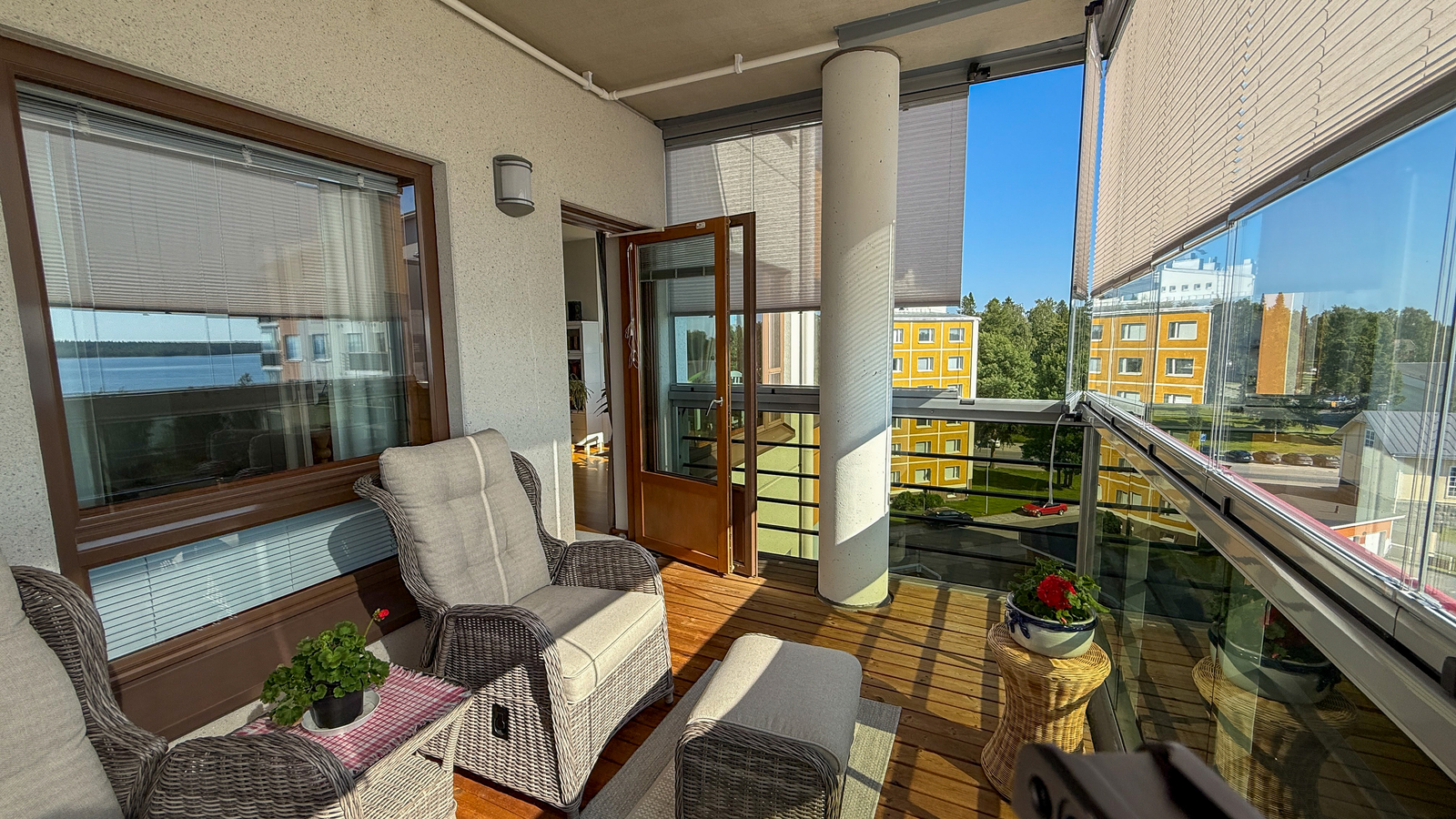 seurata lasitetulta parvekkeelta. Parvekkeelle asennettu säädettävät verhot. Asunnossa parkettilattiat ja laatoitetut kosteat tilat, erillinen kodinhoitotila, jossa wc , sekä erillinen wc.