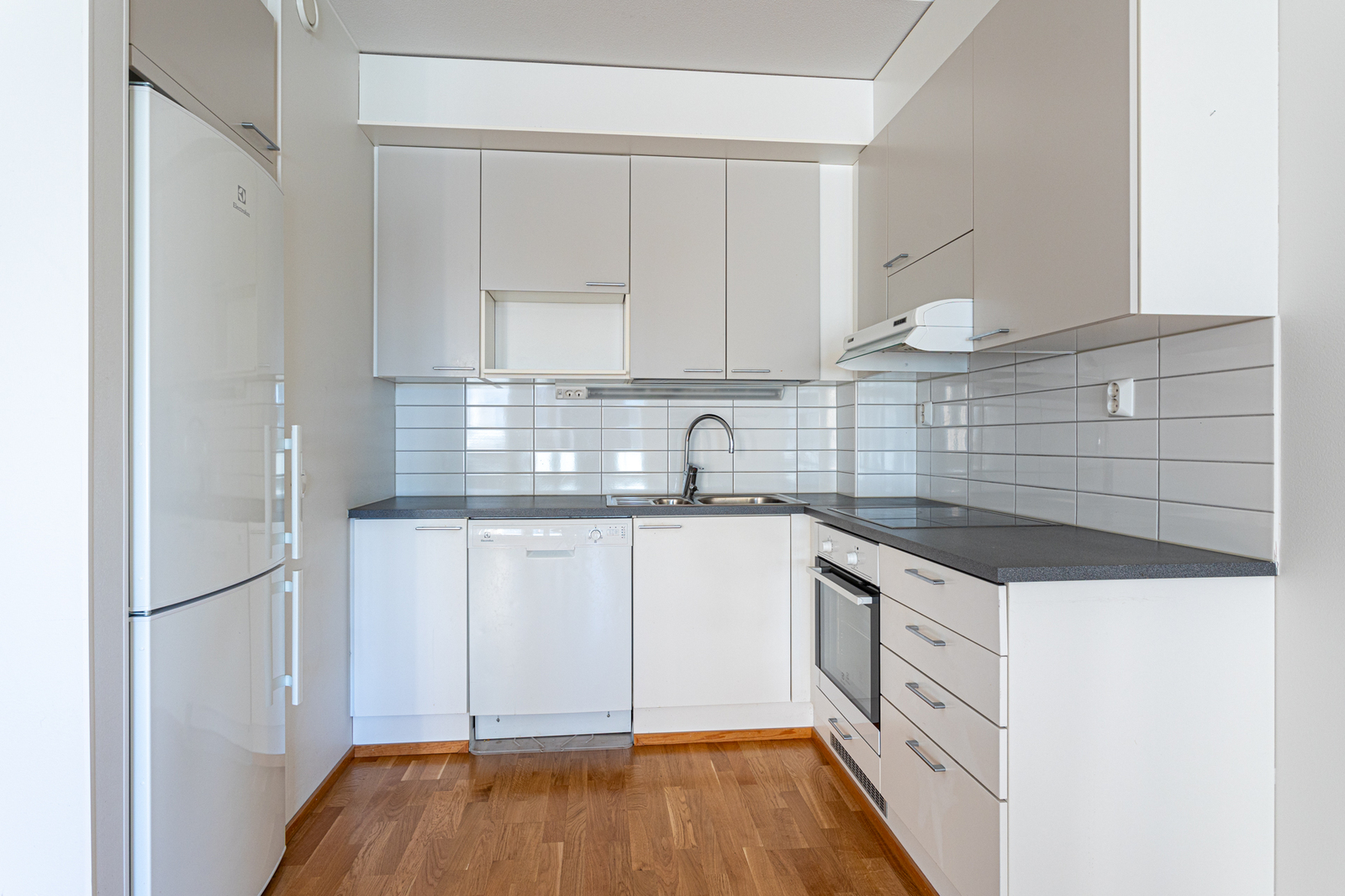 | Keittiön kuvaus | Liesi (Keraaminen liesi), työtasot (laminaatti), seinät (maali), lattiat (parketti), astianpesukone, jääkaappipakastin ja liesituuletin / hormi |