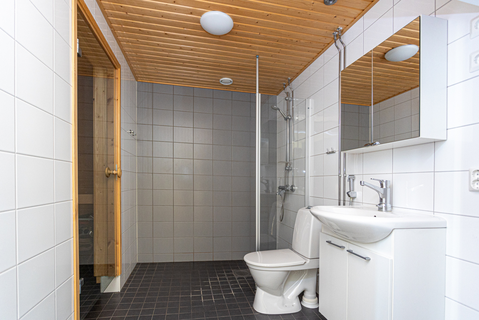 | Kylpyhuoneen kuvaus | Suihku, wc-istuin, lattialämmitys, peilikaappi, pesukoneliitäntä, suihkuseinä, allaskaappi ja kiinteät valaisimet, seinät (kaakeli), lattiat (laatta) |