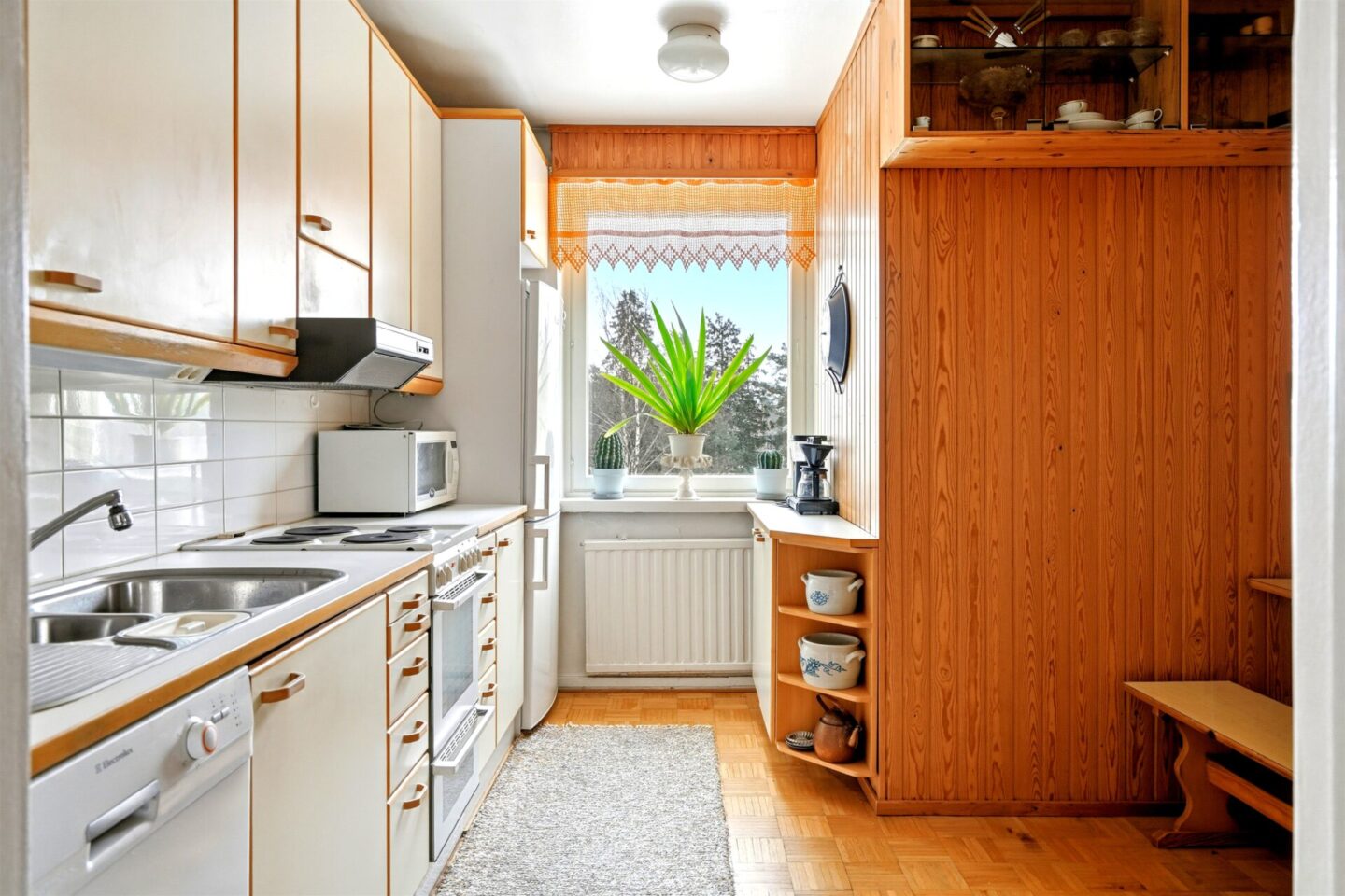 | Keittiön kuvaus | Liesi (Sähköhella), seinät (paneeli), lattiat (parketti), jääkaappi |