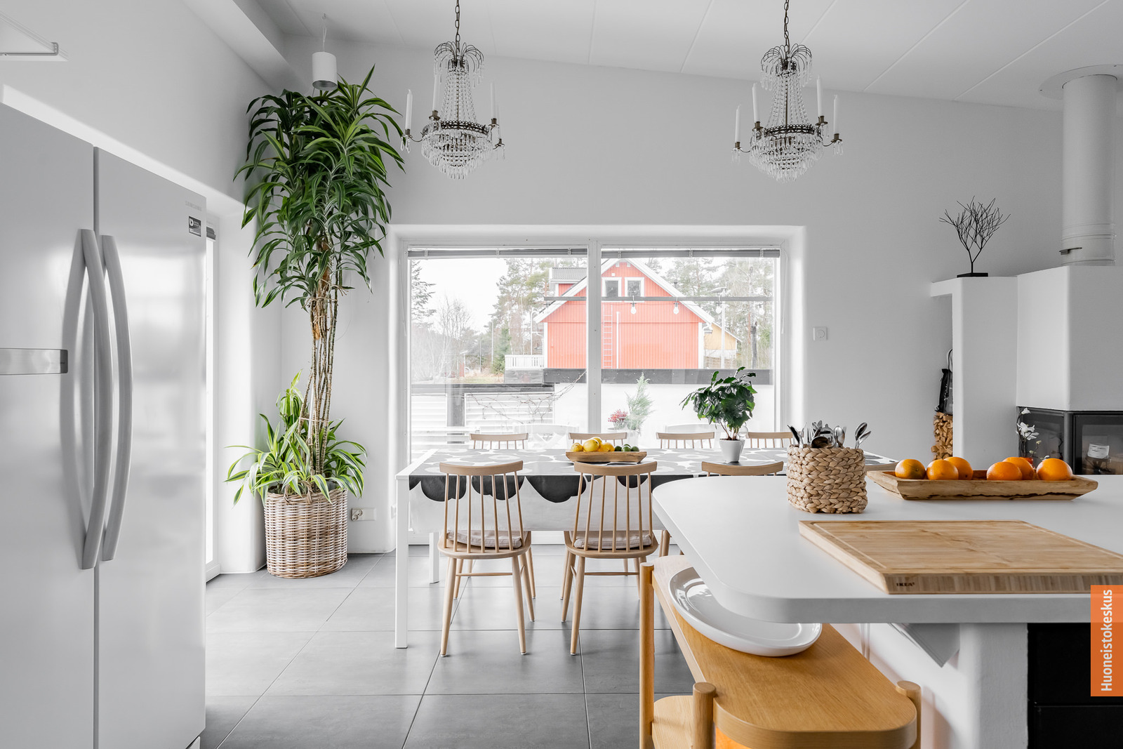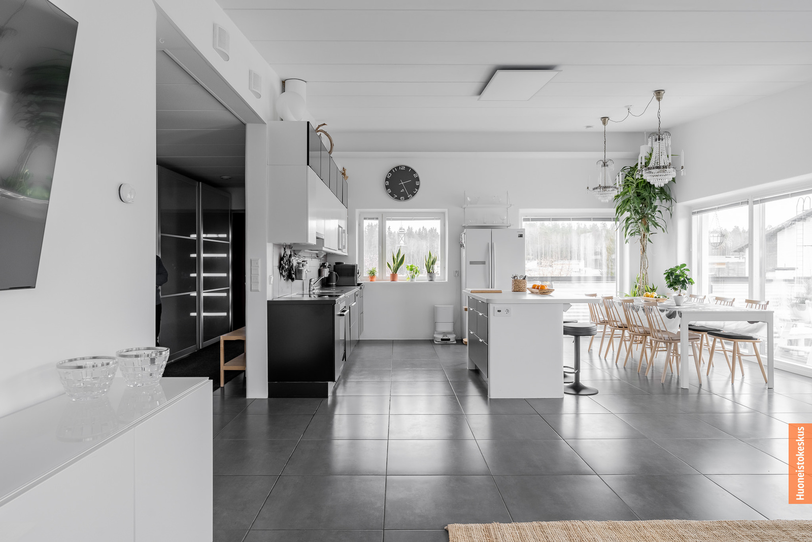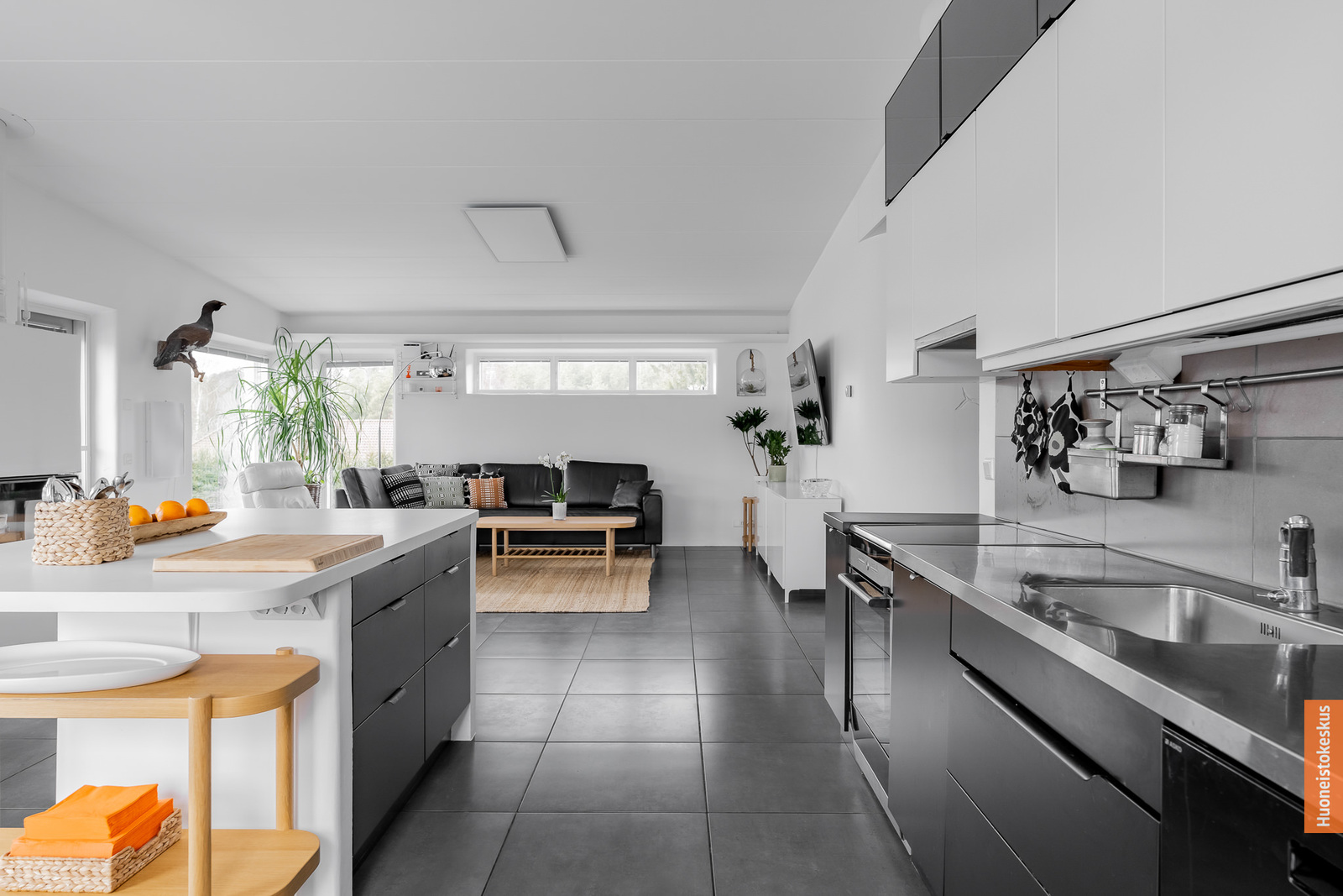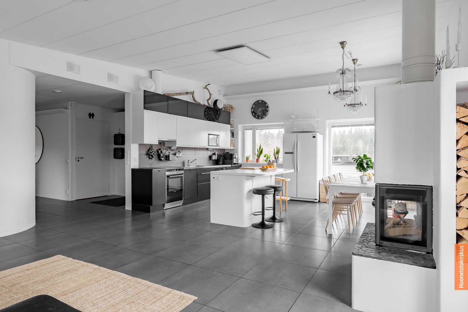 Liesi (Keraaminen liesi), lattiat (laatta), jääkaappi, astianpesukone, erillinen pakastin ja liesituuletin / hormi, kiinteät valaisimet |