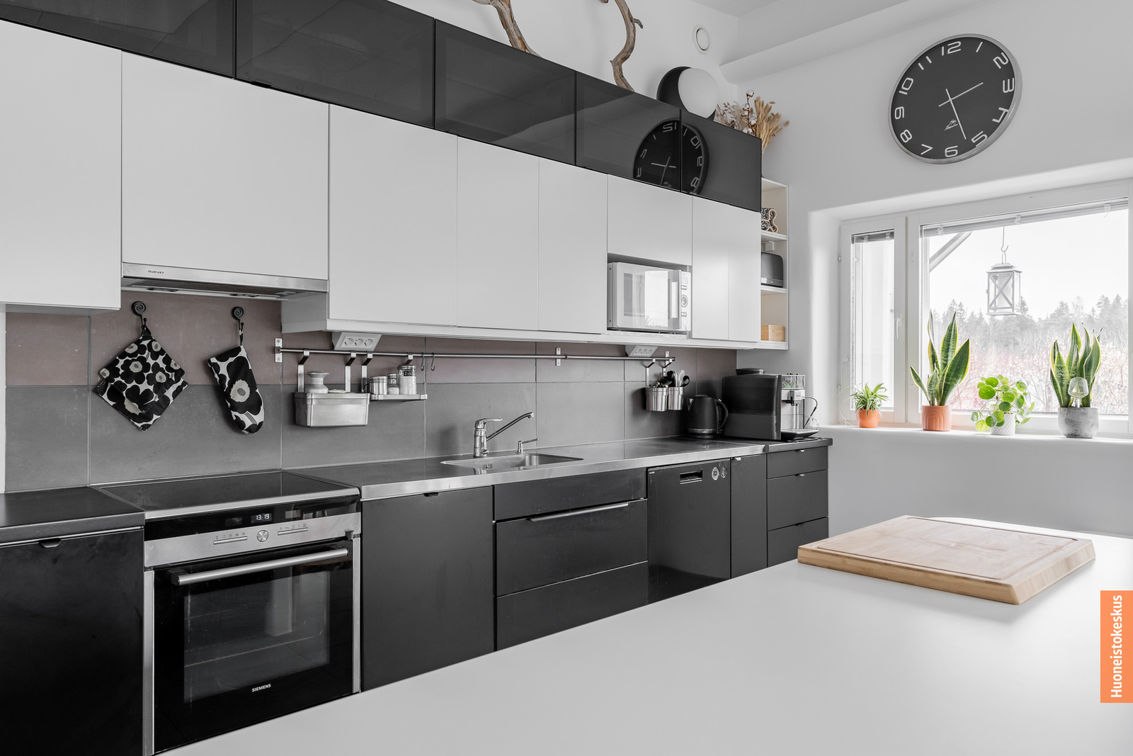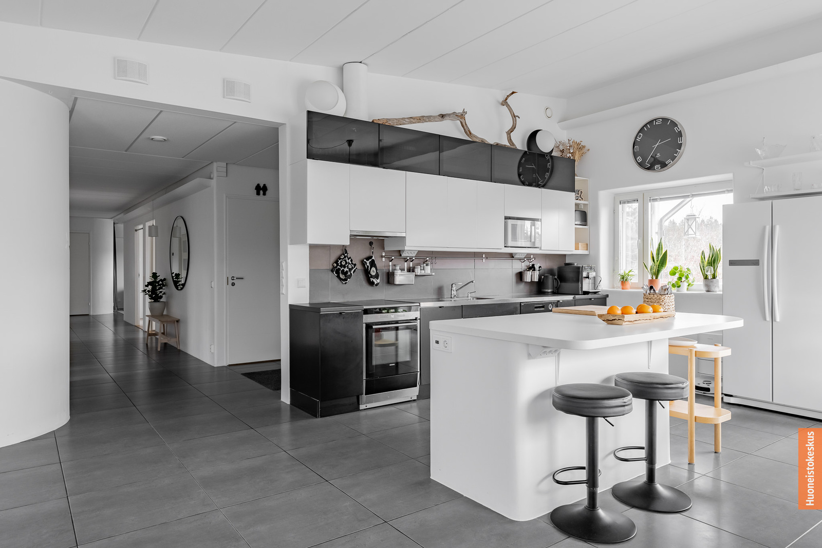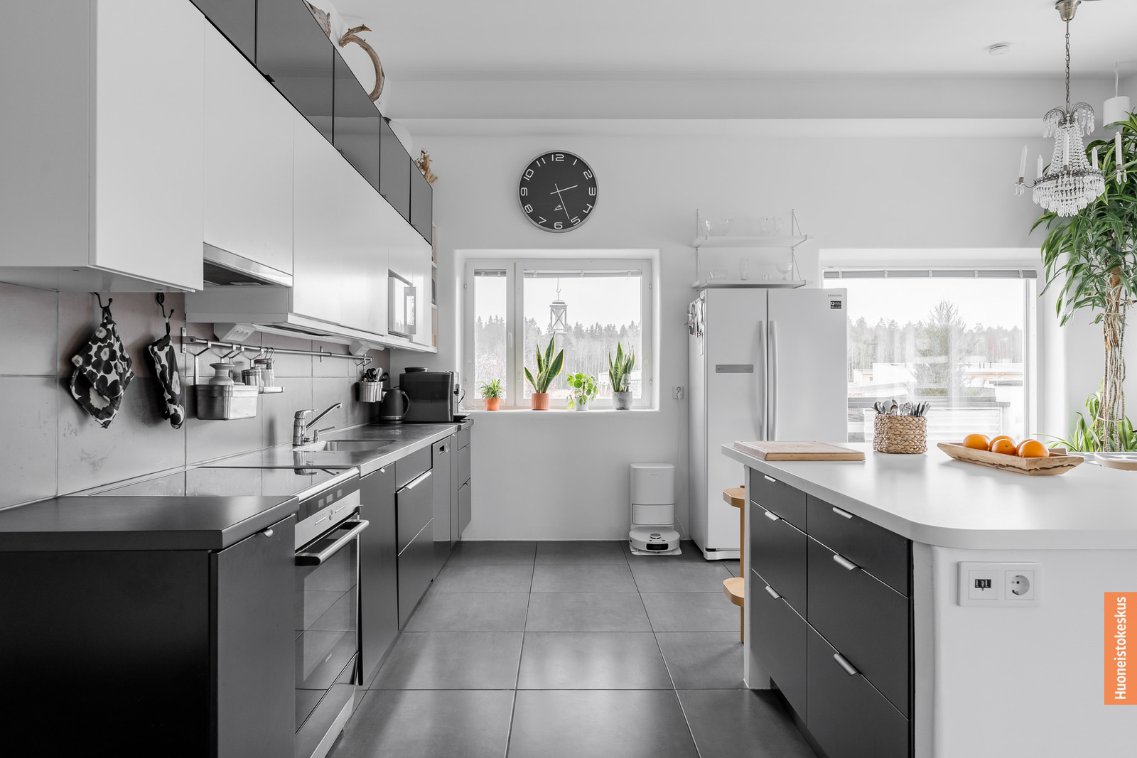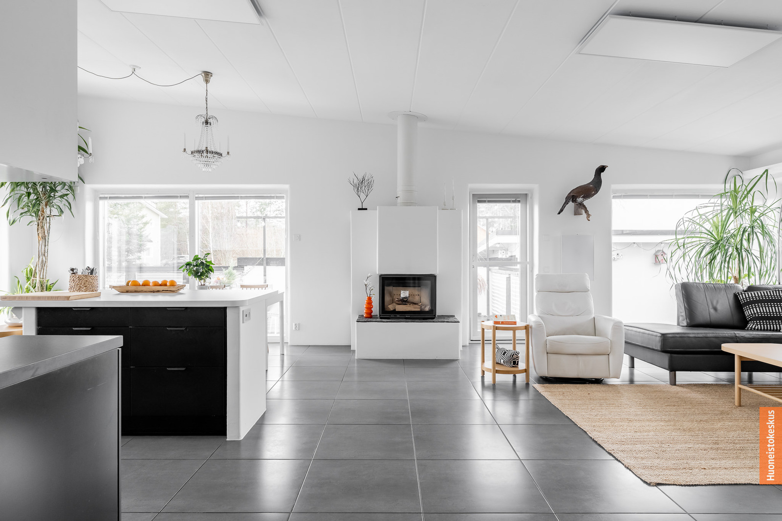 Liesi (Keraaminen liesi), lattiat (laatta), jääkaappi, astianpesukone, erillinen pakastin ja liesituuletin / hormi, kiinteät valaisimet |