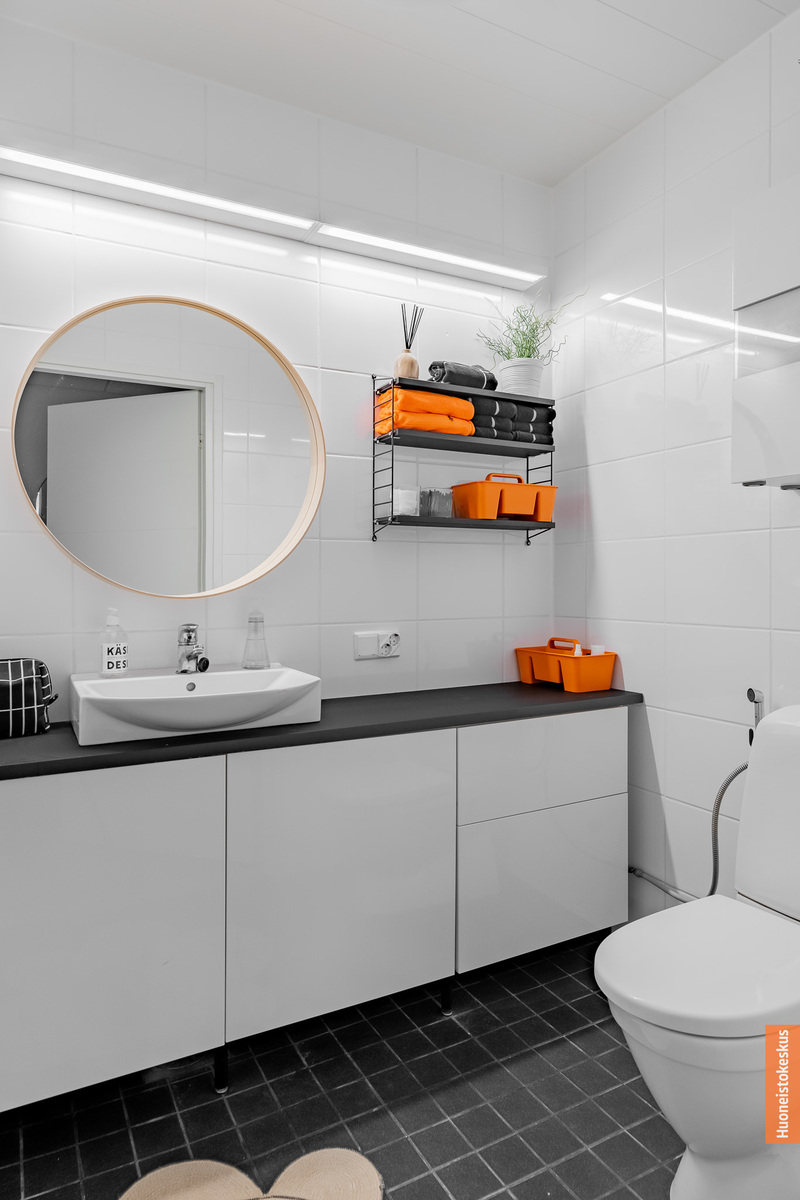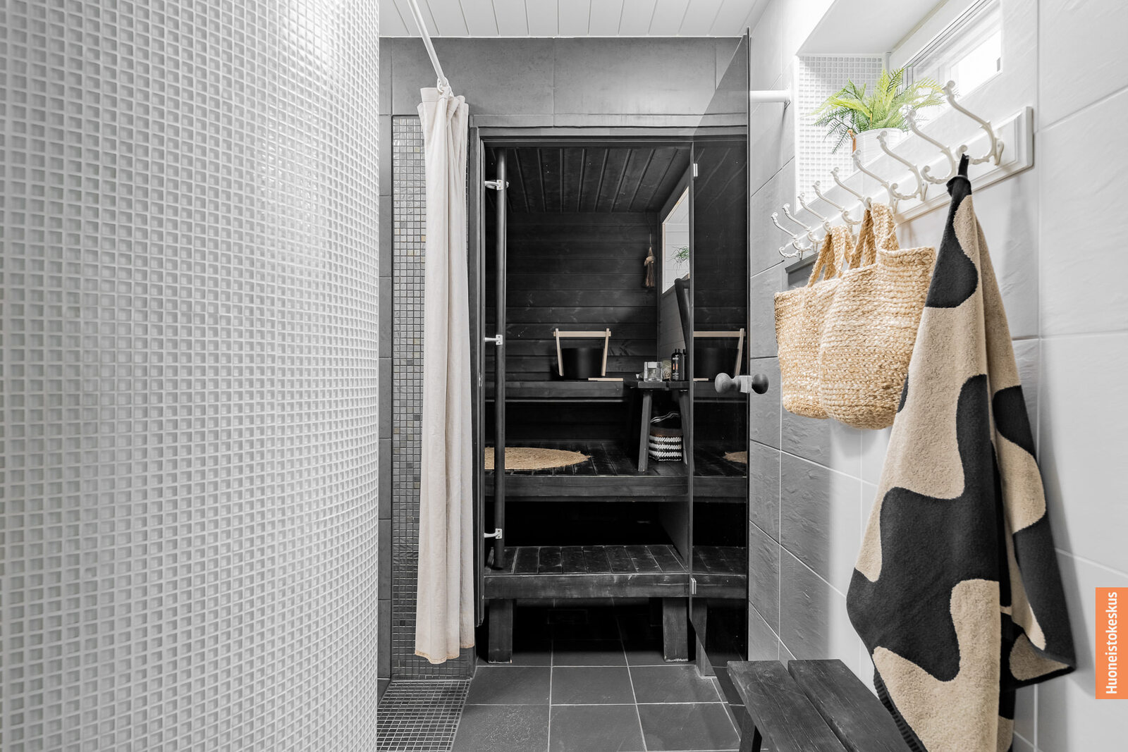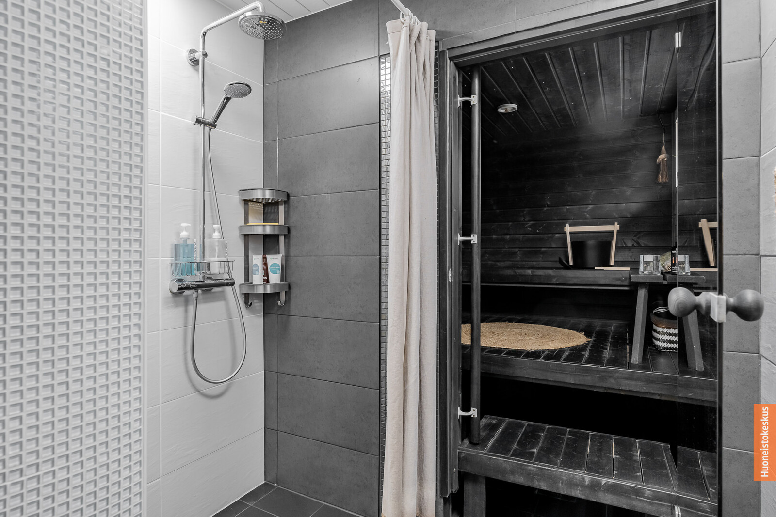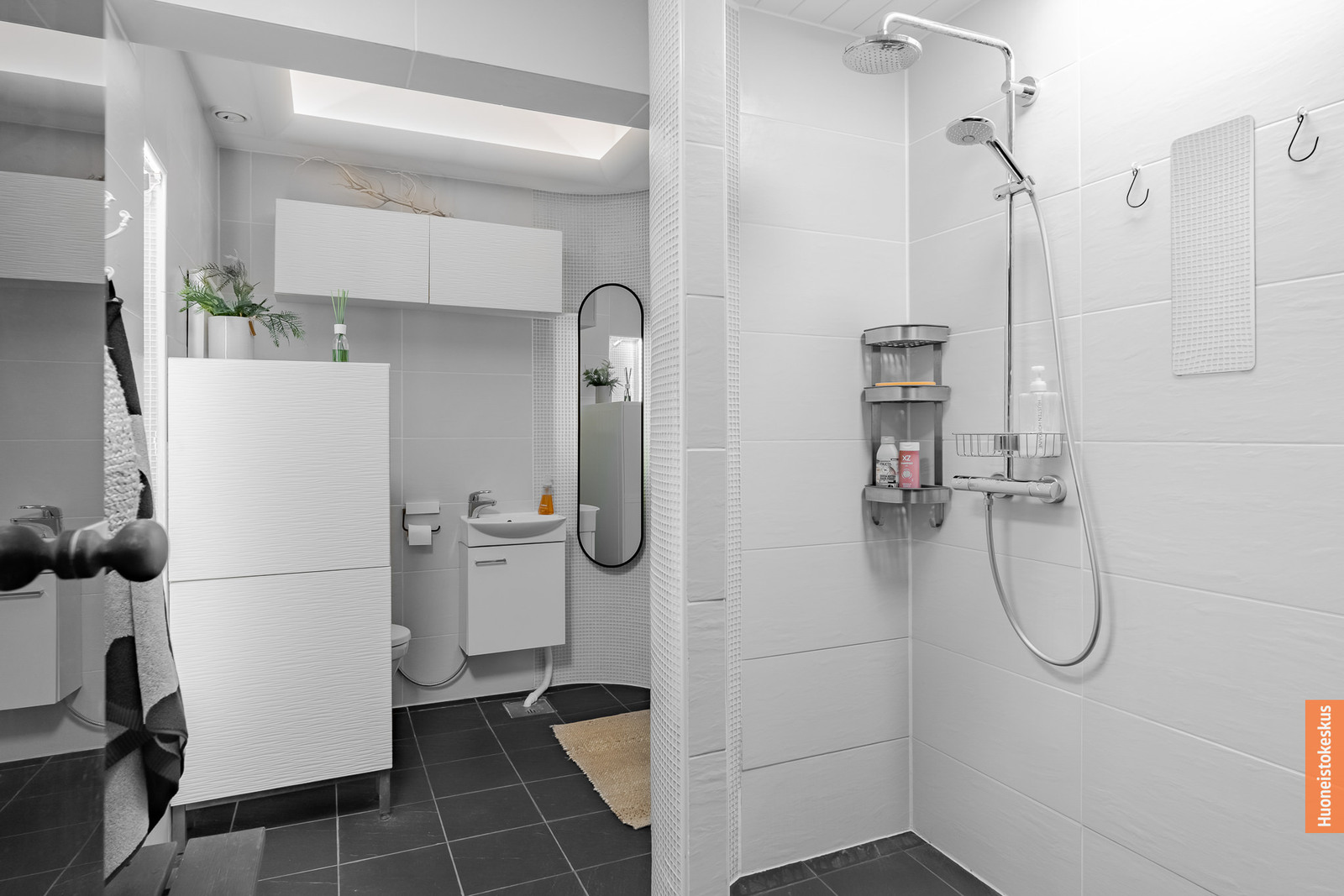 Allaskaappi, wc-istuin, lattialämmitys, peilikaappi, suihku ja kiinteät valaisimet, seinät (kaakeli), lattiat (laatta) |