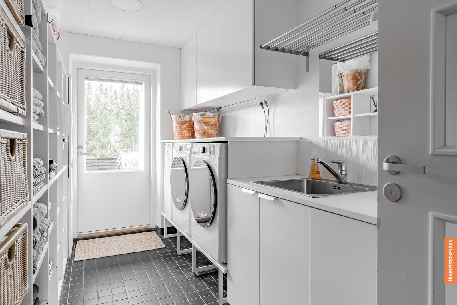 Lattialämmitys, pesukoneliitäntä, pyykkikaapit ja pöytätaso, lattiat (laatta), pesuallas ja työtasot, hyvin tilaa pyykinpesu-ja kuivauskoneille |