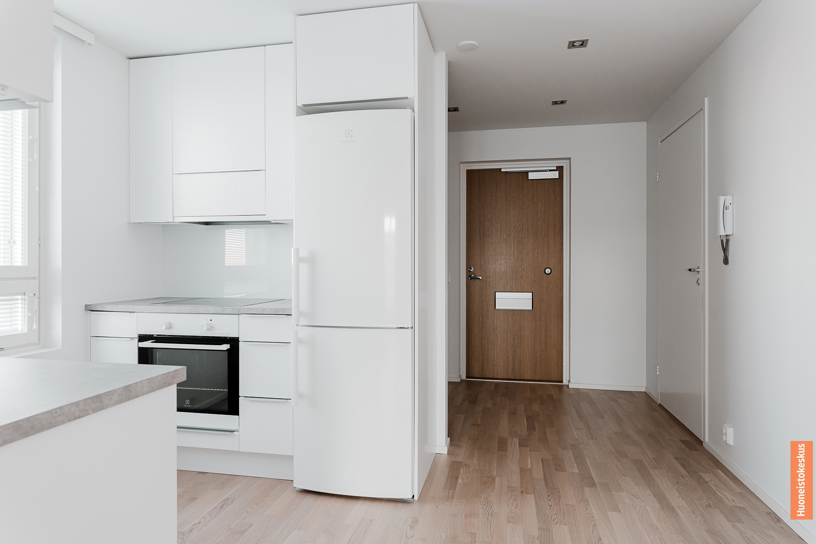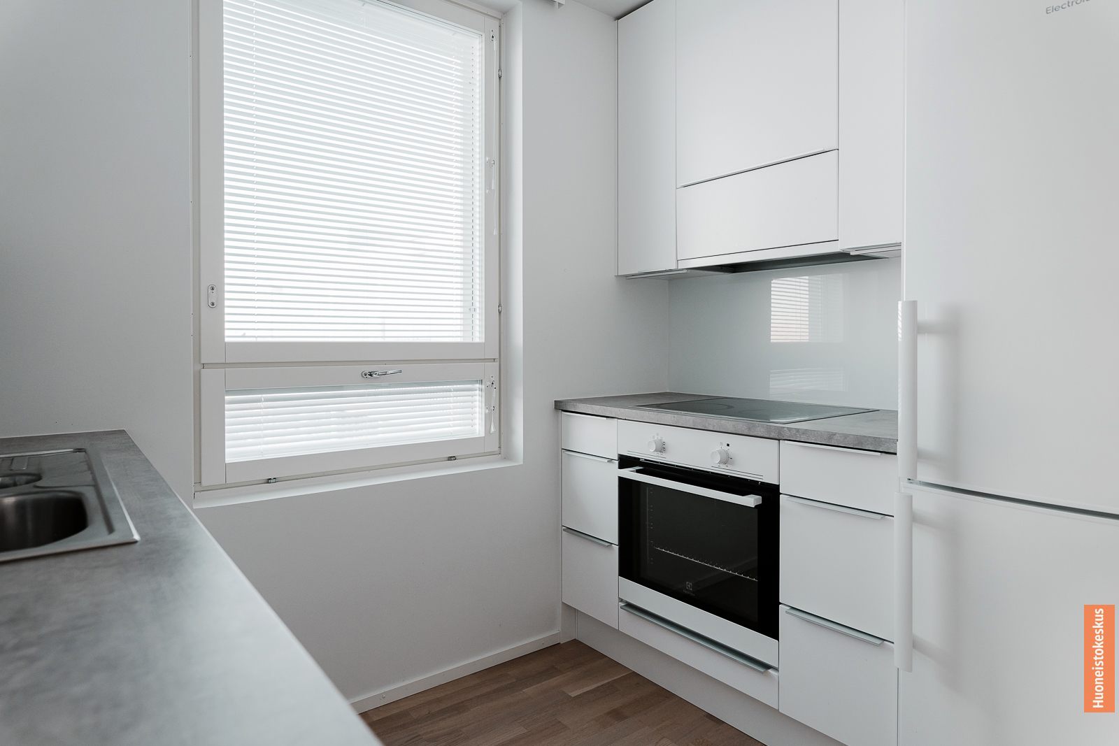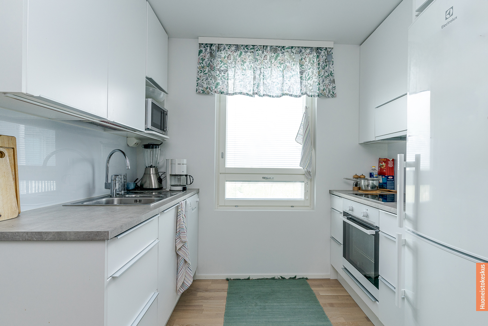 Liesi (Induktioliesi ja erillisuuni), työtasot (laminaatti), seinät (maali), lattiat (parketti), jääkaappipakastin, erillisuuni, liesi, liesituuletin ja astianpesukone |