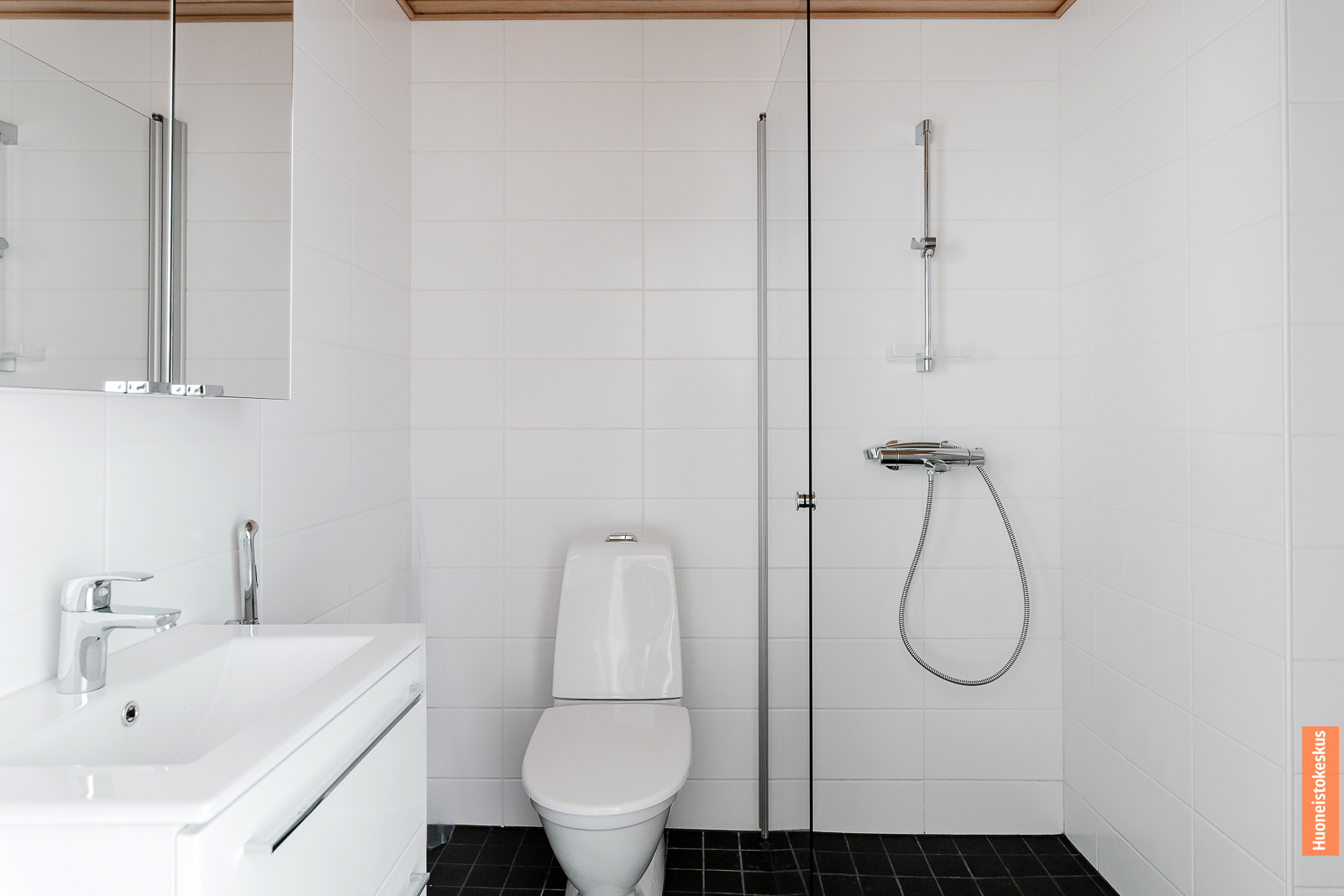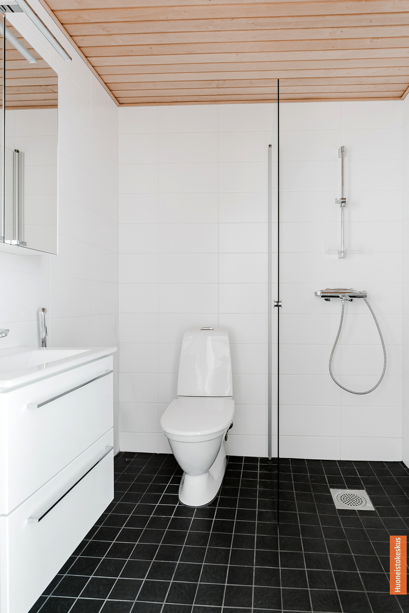 Lattialämmitys, peilikaappi, suihkuseinä, suihku, wc-istuin ja pesukoneliitäntä, seinät (kaakeli), lattiat (laatta) |
