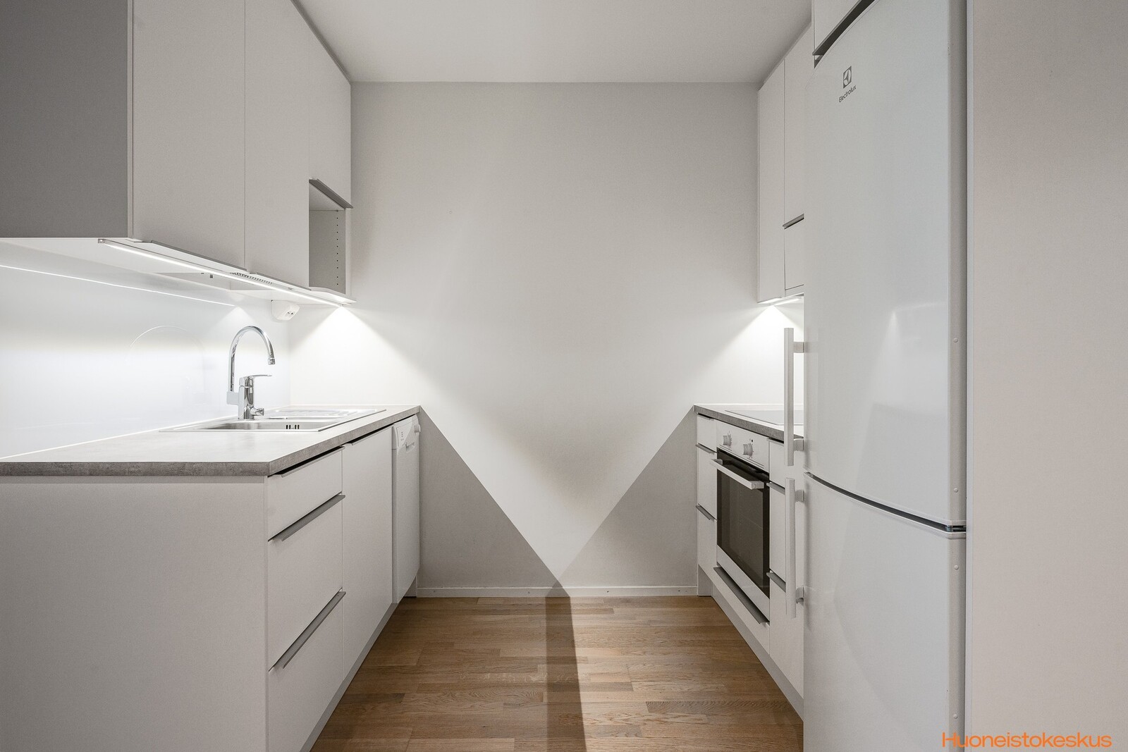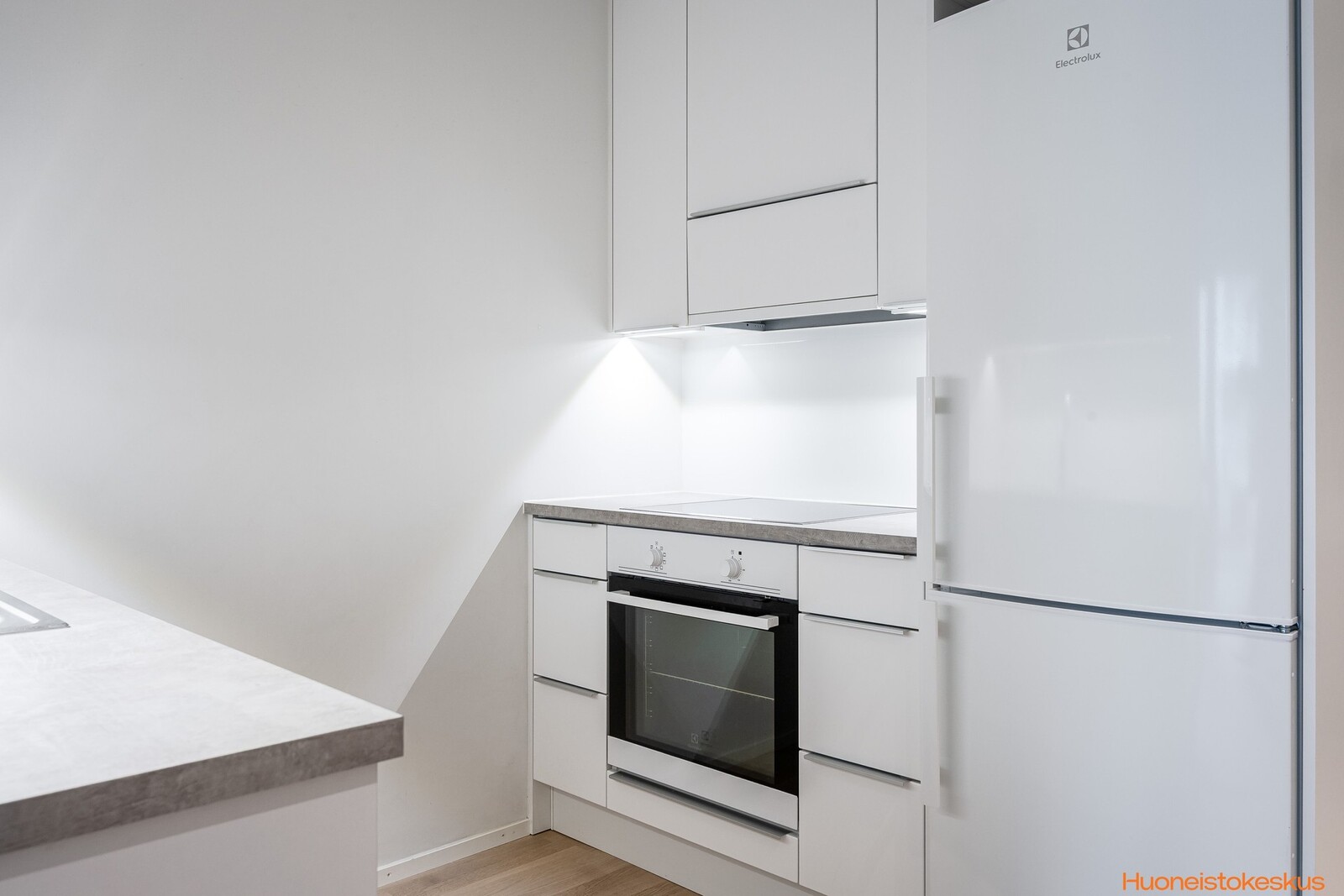Liesi (Induktioliesi ja erillisuuni), työtasot (laminaatti), seinät (maali), lattiat (parketti), erillisuuni, jääkaappipakastin, liesi, liesituuletin ja astianpesukone |