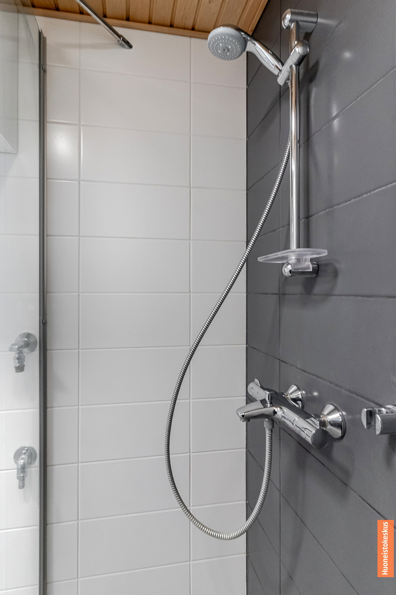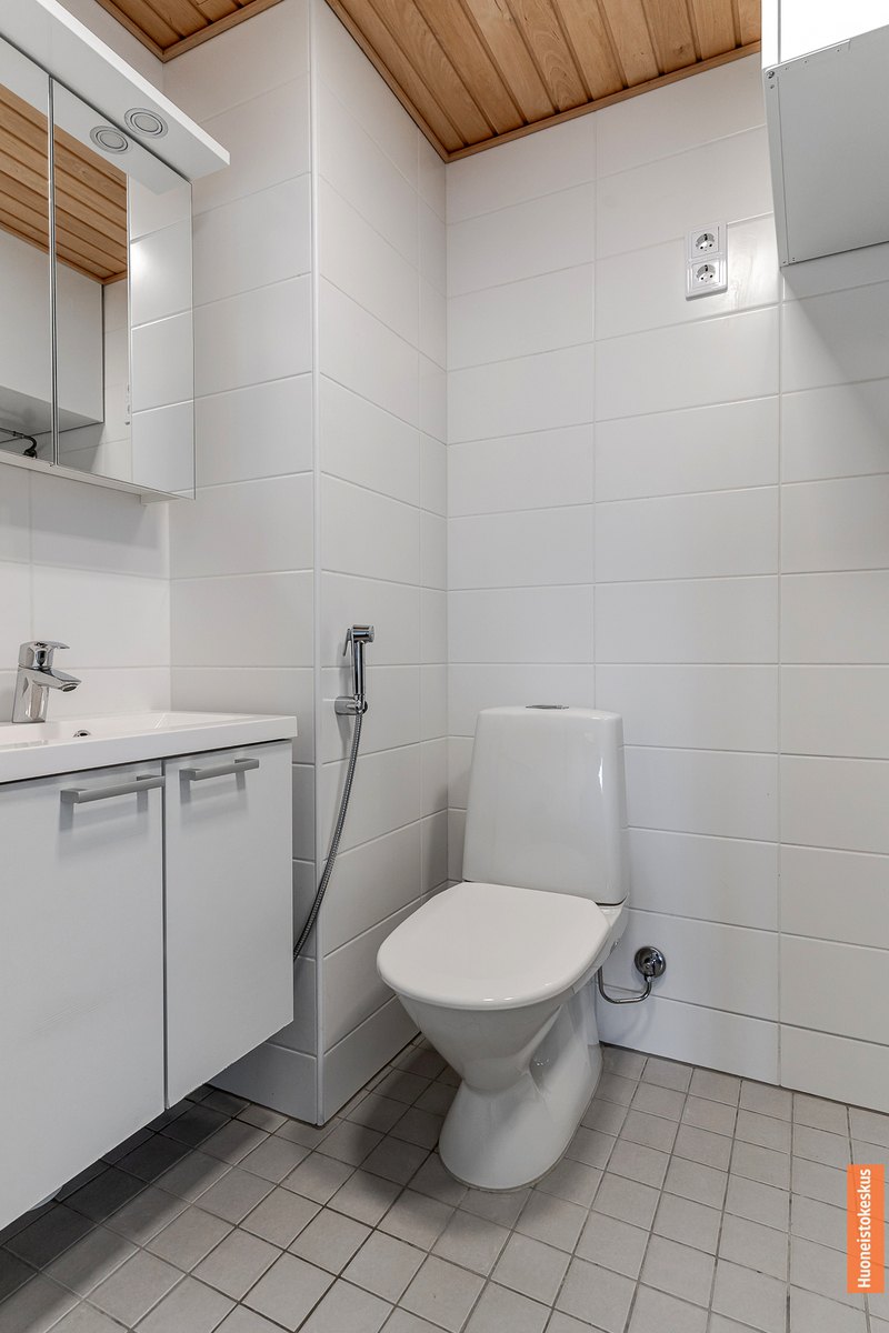 | Kylpyhuoneen kuvaus | Allaskaappi, lattialämmitys, peilikaappi, suihku, pesukoneliitäntä, suihkuseinä, wc-istuin ja kiinteät valaisimet, seinät (kaakeli), lattiat (laatta) |