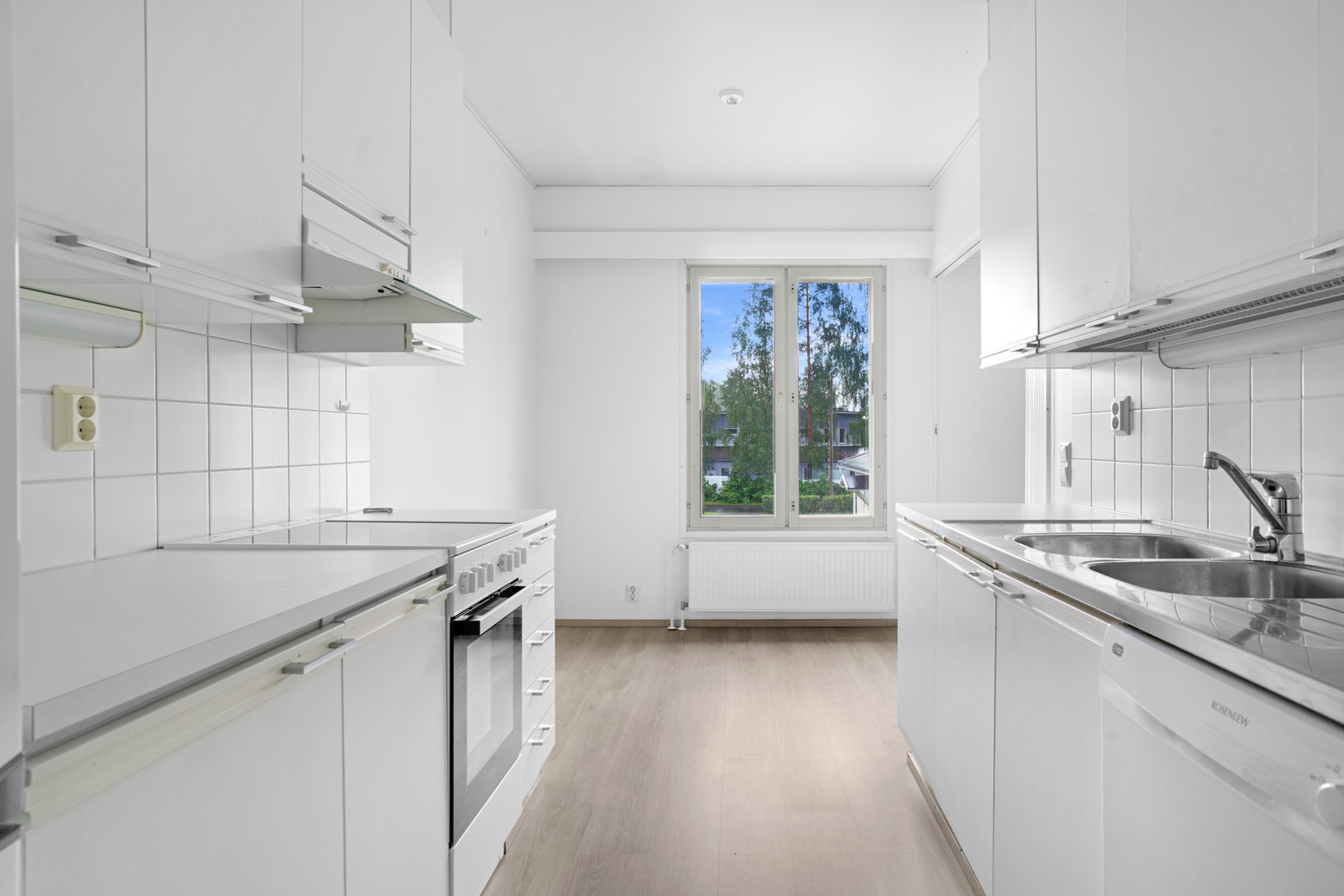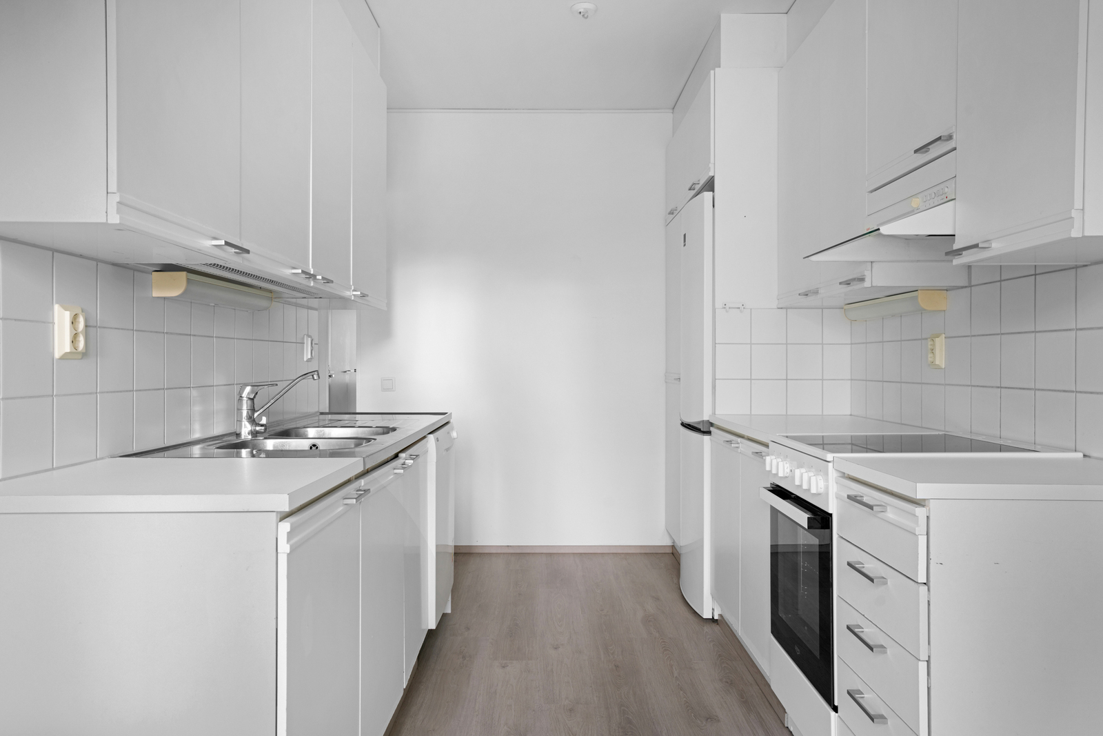 Liesi (Keraaminen liesi), työtasot (laminaatti), seinät (maali), lattiat (laminaatti), astianpesukone, jääkaappipakastin, liesituuletin ja kiinteät valaisimet |